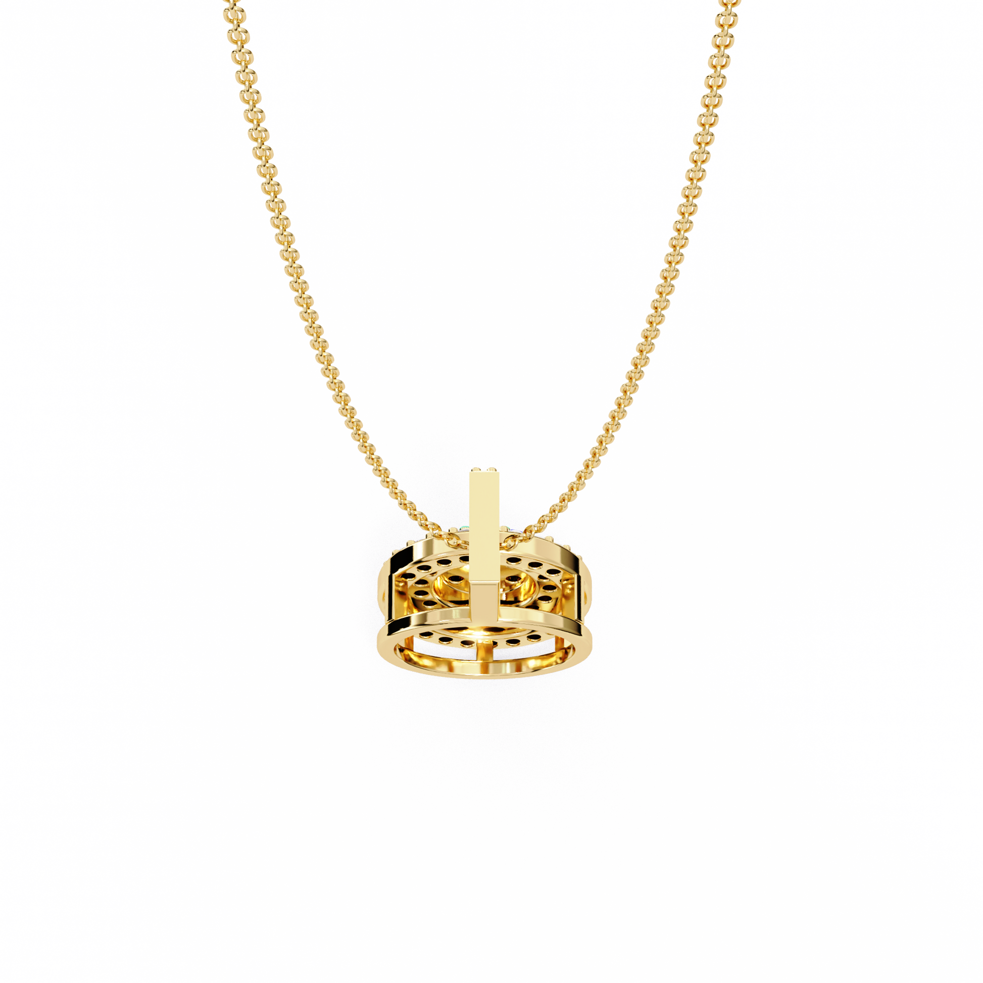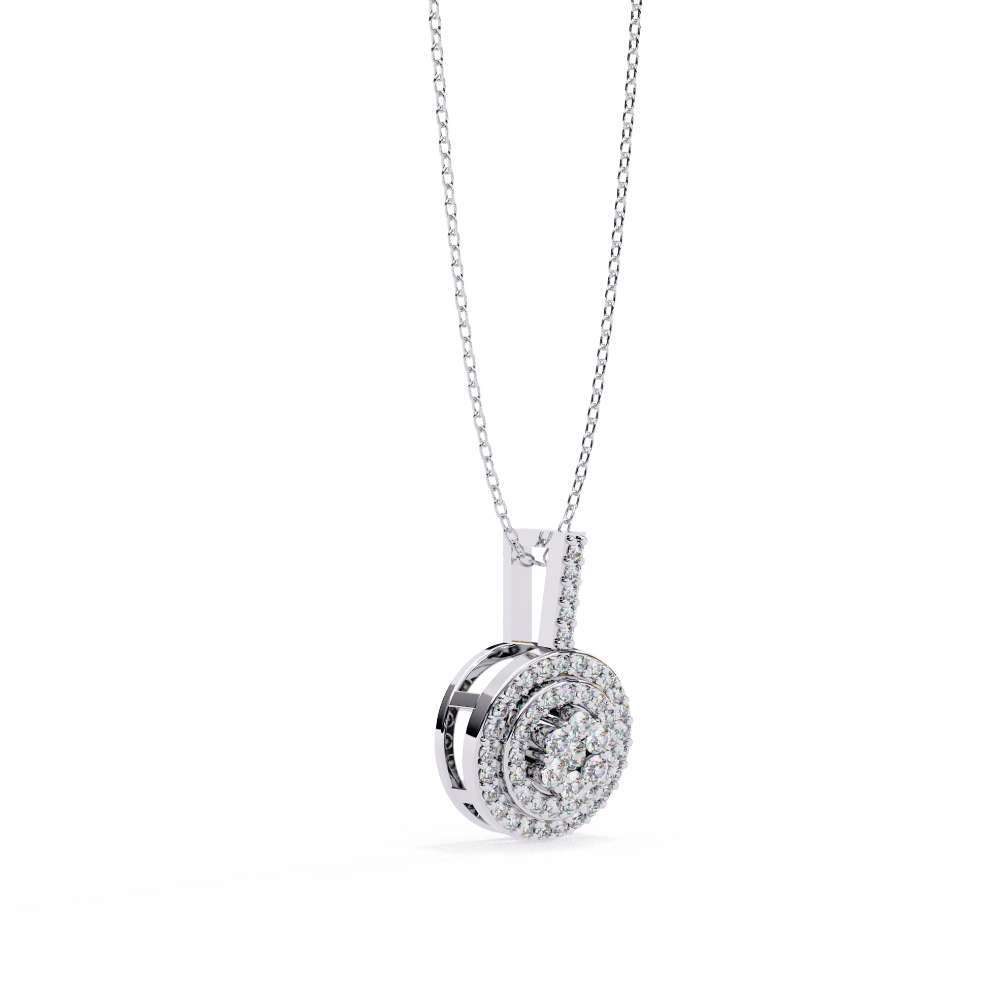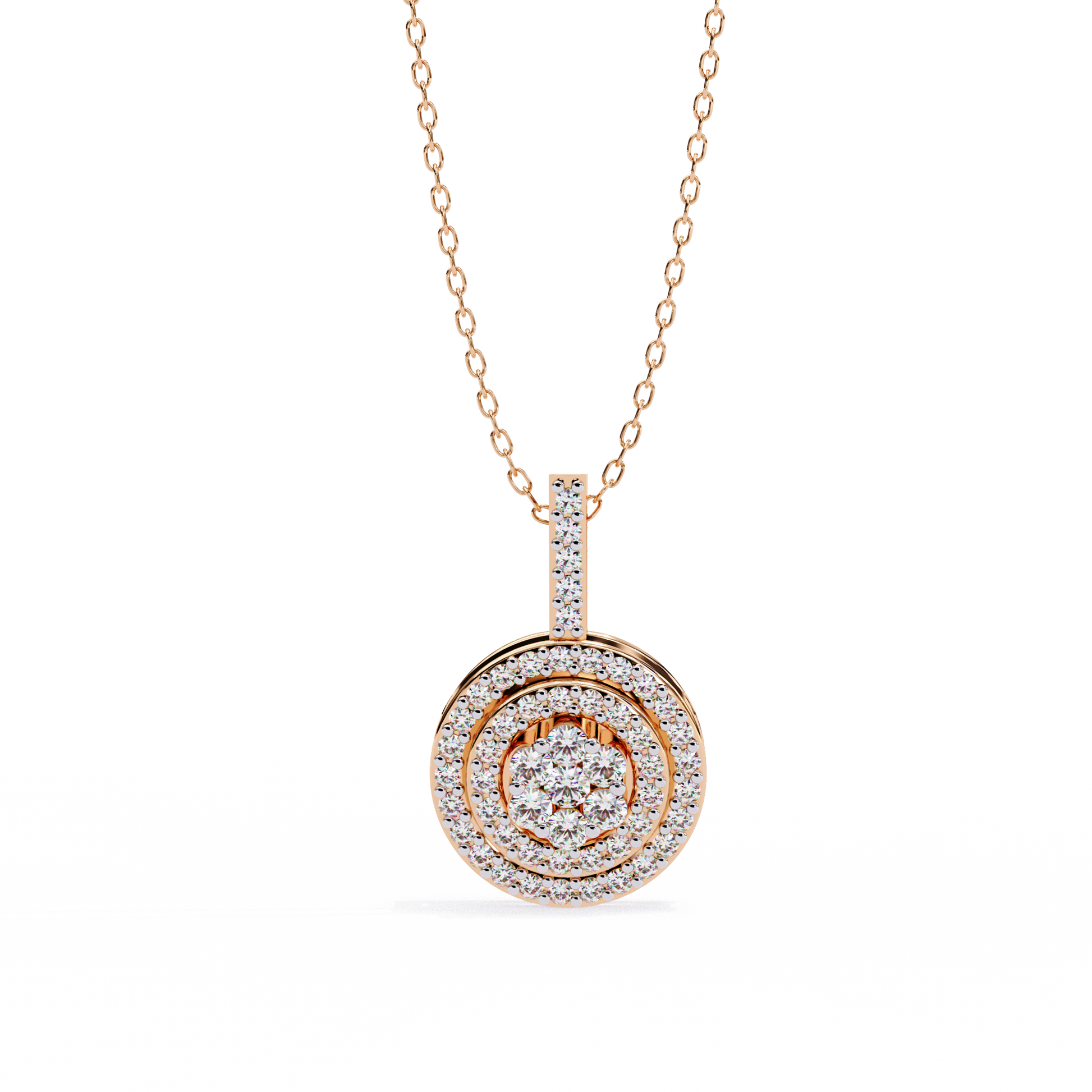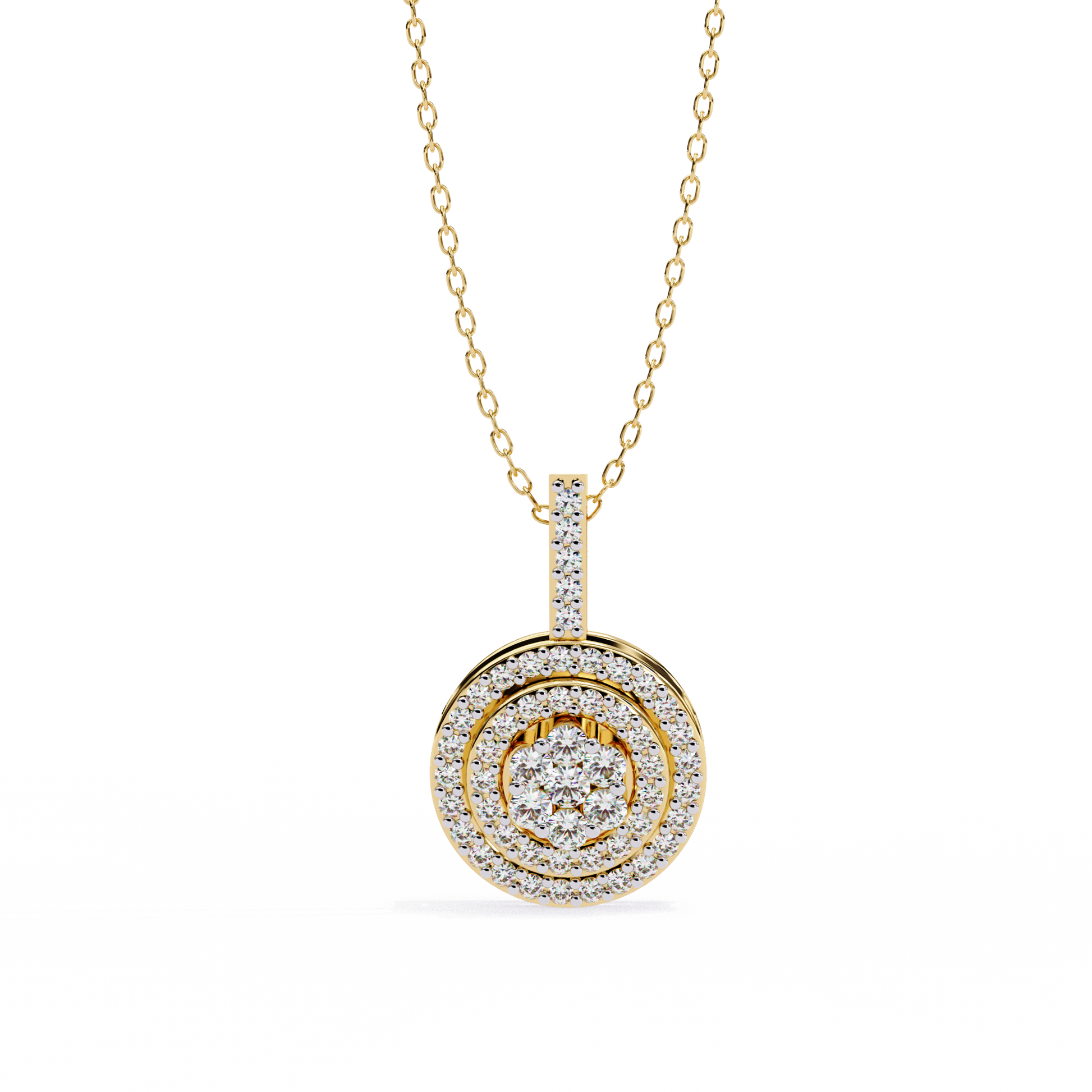 This stunning pendant showcases a dazzling circular design crafted in rich gold, featuring a captivating Cluster of Brilliant Round Diamonds at its center. Encircling the centerpiece are two concentric halos of smaller, meticulously set diamonds that amplify its sparkle and elegance. The diamond-encrusted bail adds a refined finishing touch, making this piece a perfect symbol of timeless luxury and radiant beauty, ideal for adding glamour to any special occasion or everyday look by Ivevar.