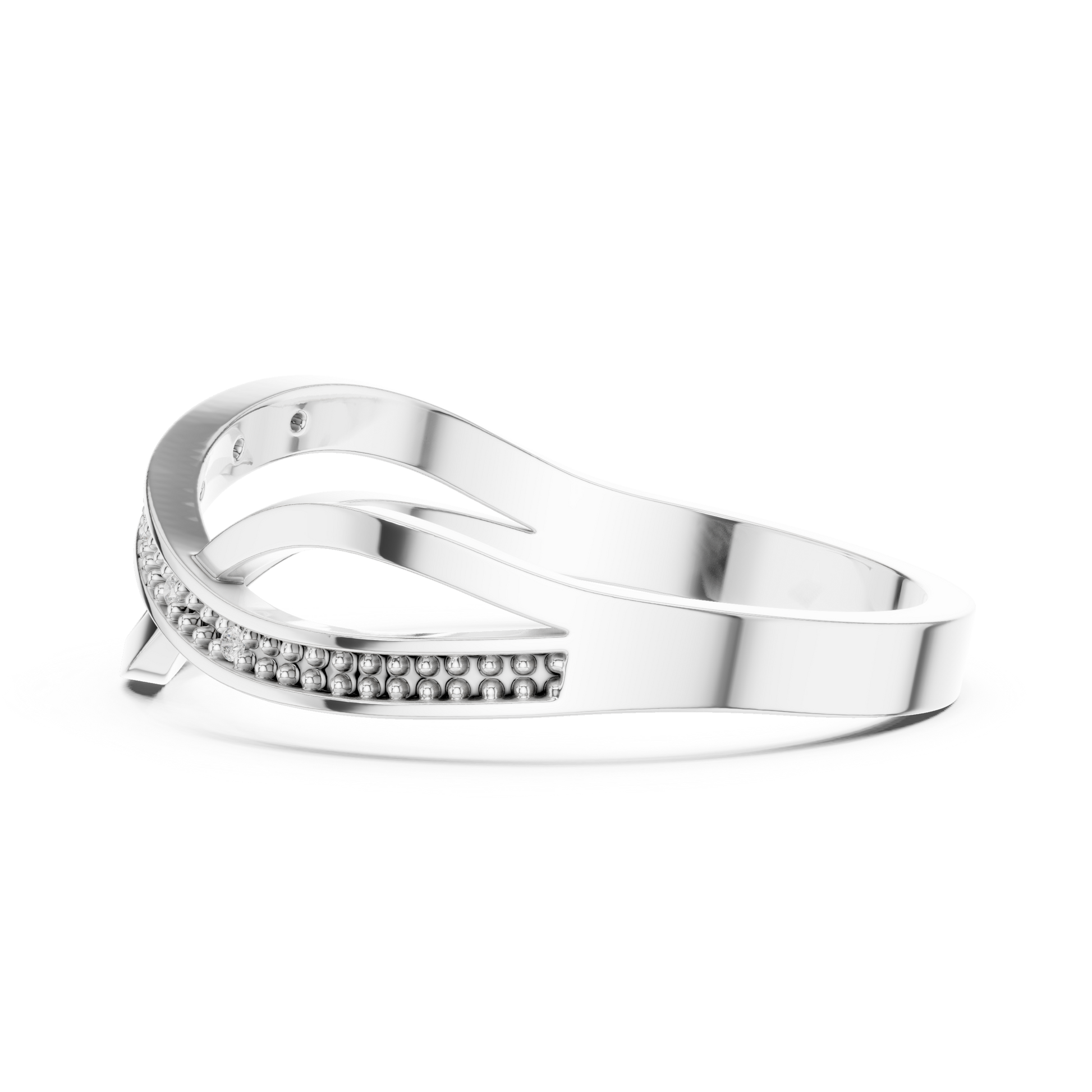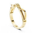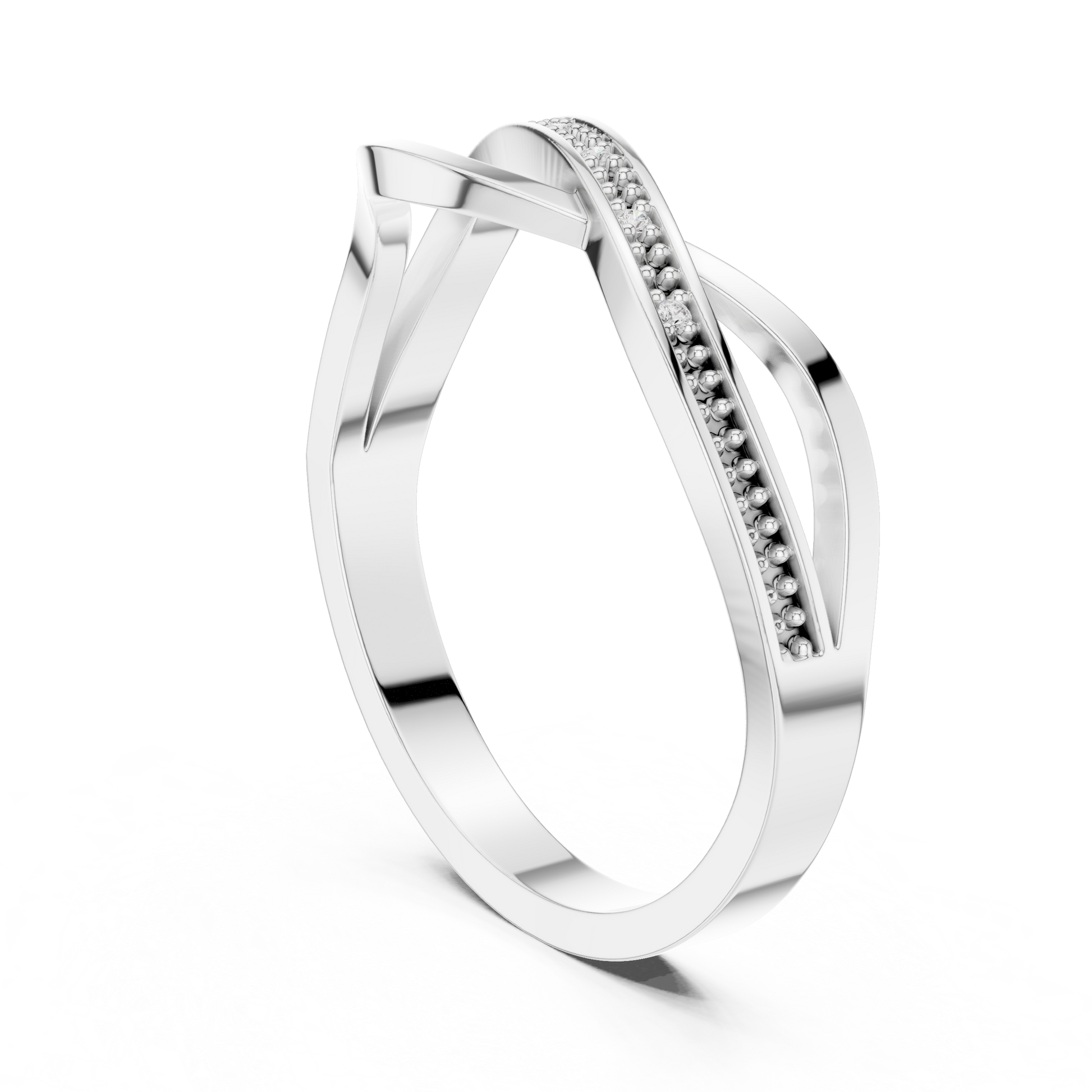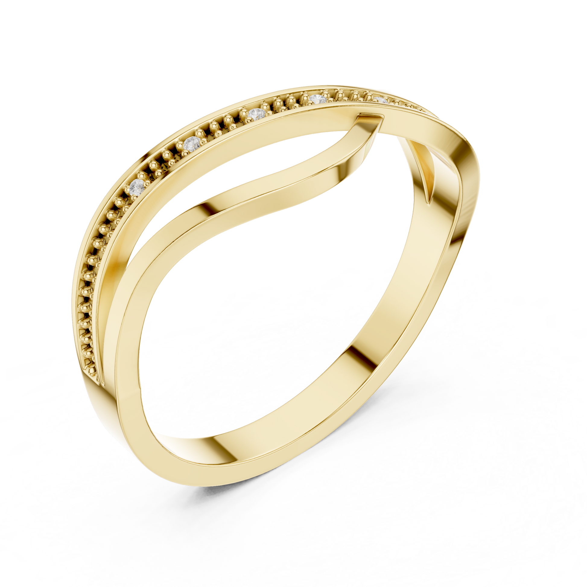 This graceful gold ring features a stylish crossover design paired with a delicate beaded diamond-accented band, creating a perfect blend of modern elegance and timeless charm. The intertwining curves add fluid movement, while the sparkling diamonds bring a subtle touch of brilliance. Lightweight, refined, and versatile, this ring makes a beautiful choice for everyday wear, stacking, or gifting.