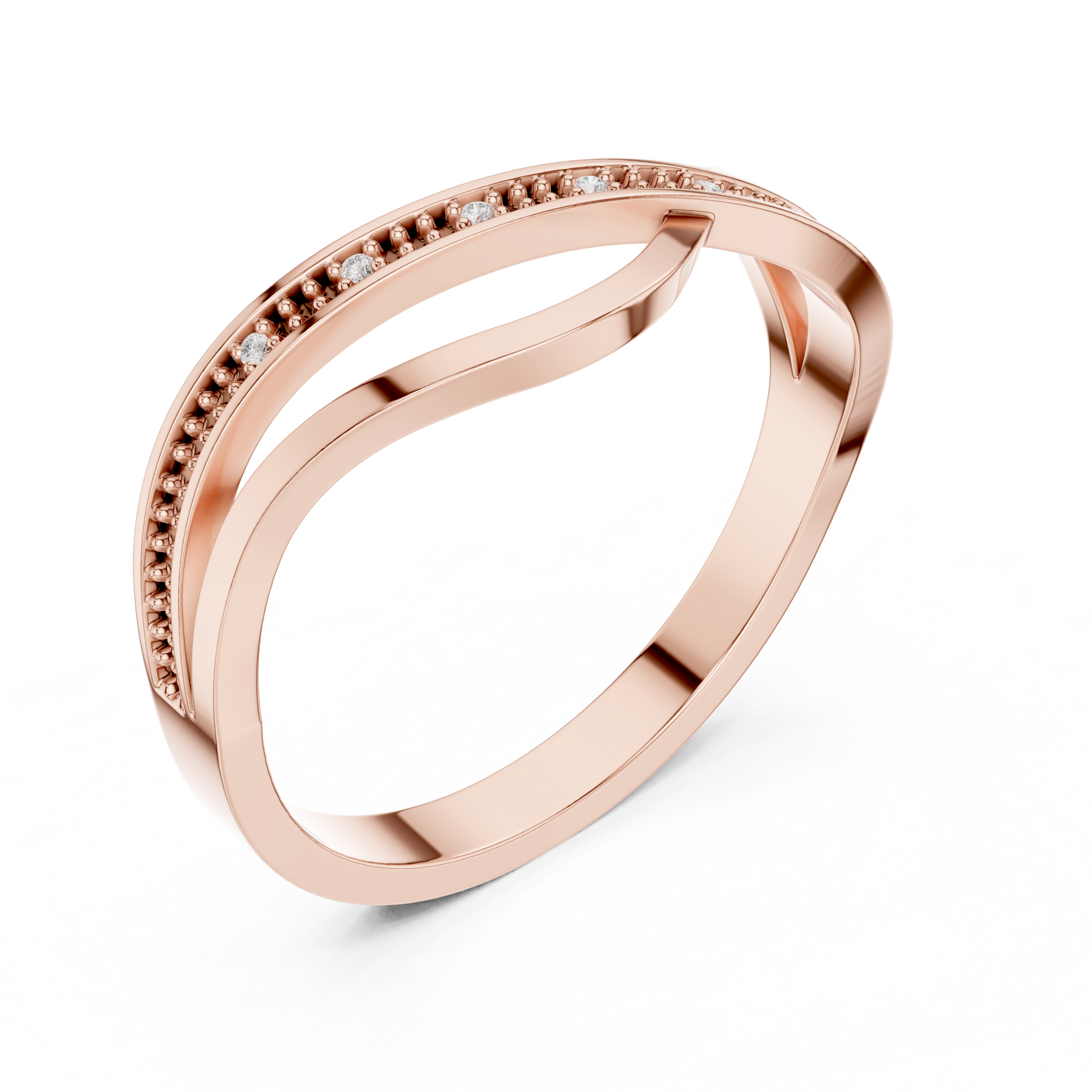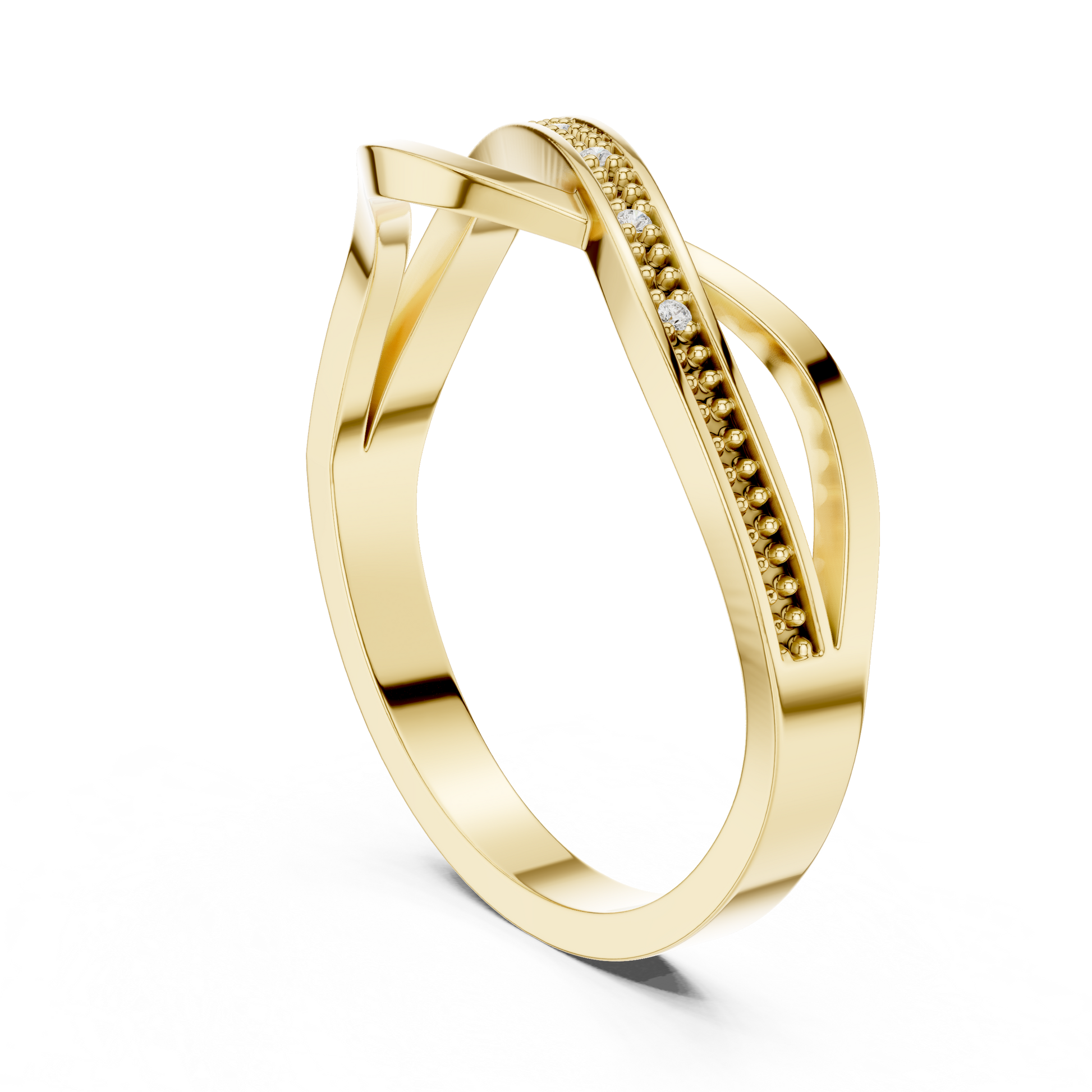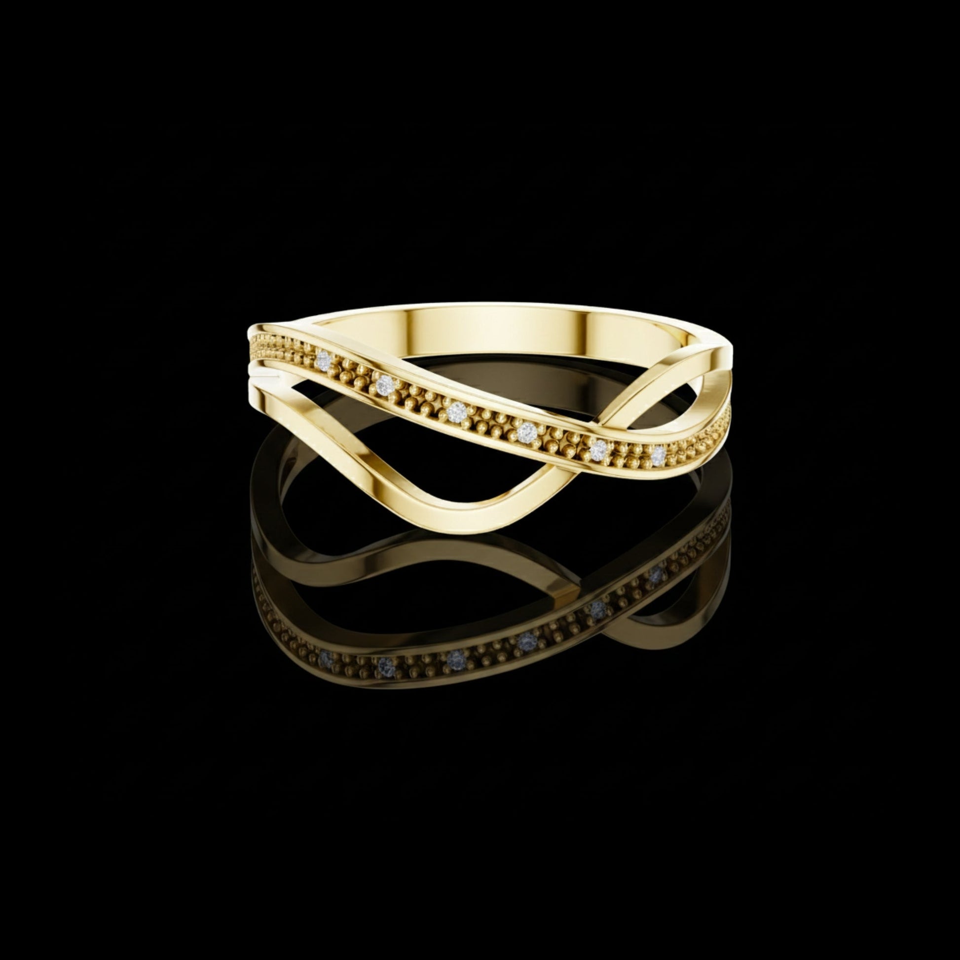 This graceful gold ring features a stylish crossover design paired with a delicate beaded diamond-accented band, creating a perfect blend of modern elegance and timeless charm. The intertwining curves add fluid movement, while the sparkling diamonds bring a subtle touch of brilliance. Lightweight, refined, and versatile, this ring makes a beautiful choice for everyday wear, stacking, or gifting.