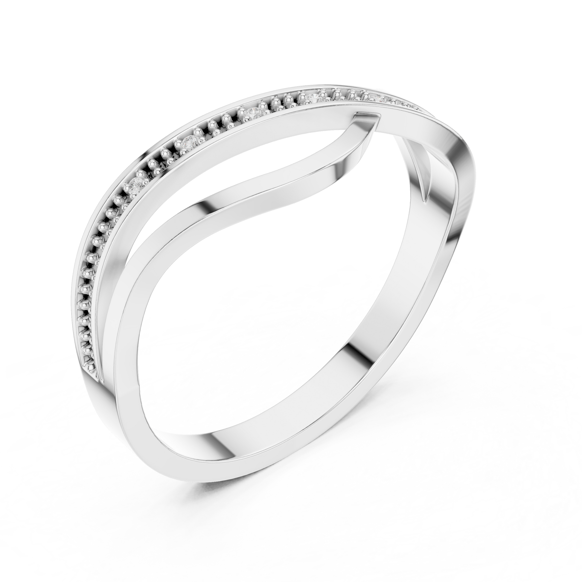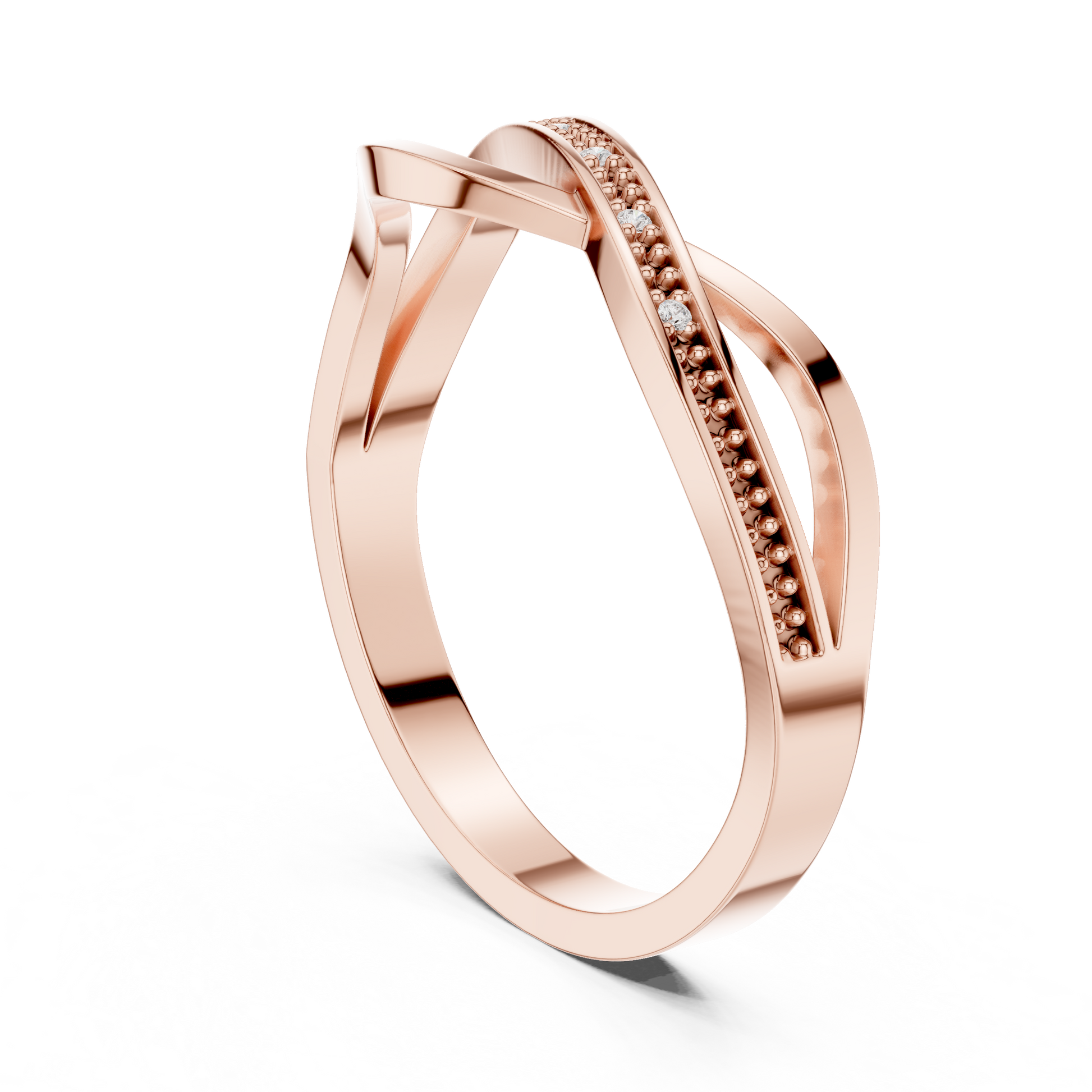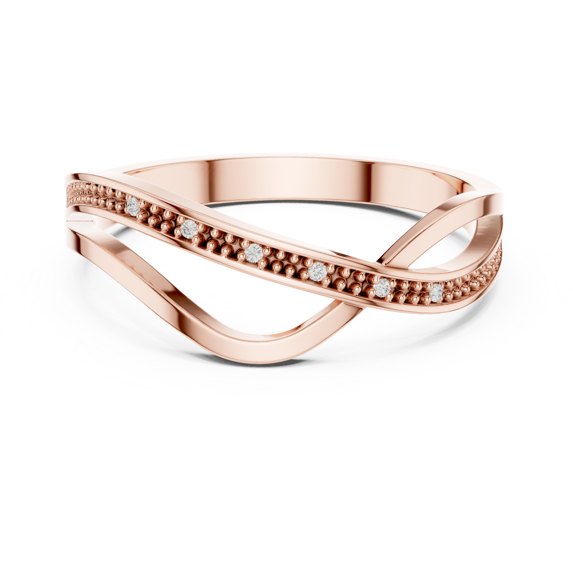 This graceful gold ring features a stylish crossover design paired with a delicate beaded diamond-accented band, creating a perfect blend of modern elegance and timeless charm. The intertwining curves add fluid movement, while the sparkling diamonds bring a subtle touch of brilliance. Lightweight, refined, and versatile, this ring makes a beautiful choice for everyday wear, stacking, or gifting.