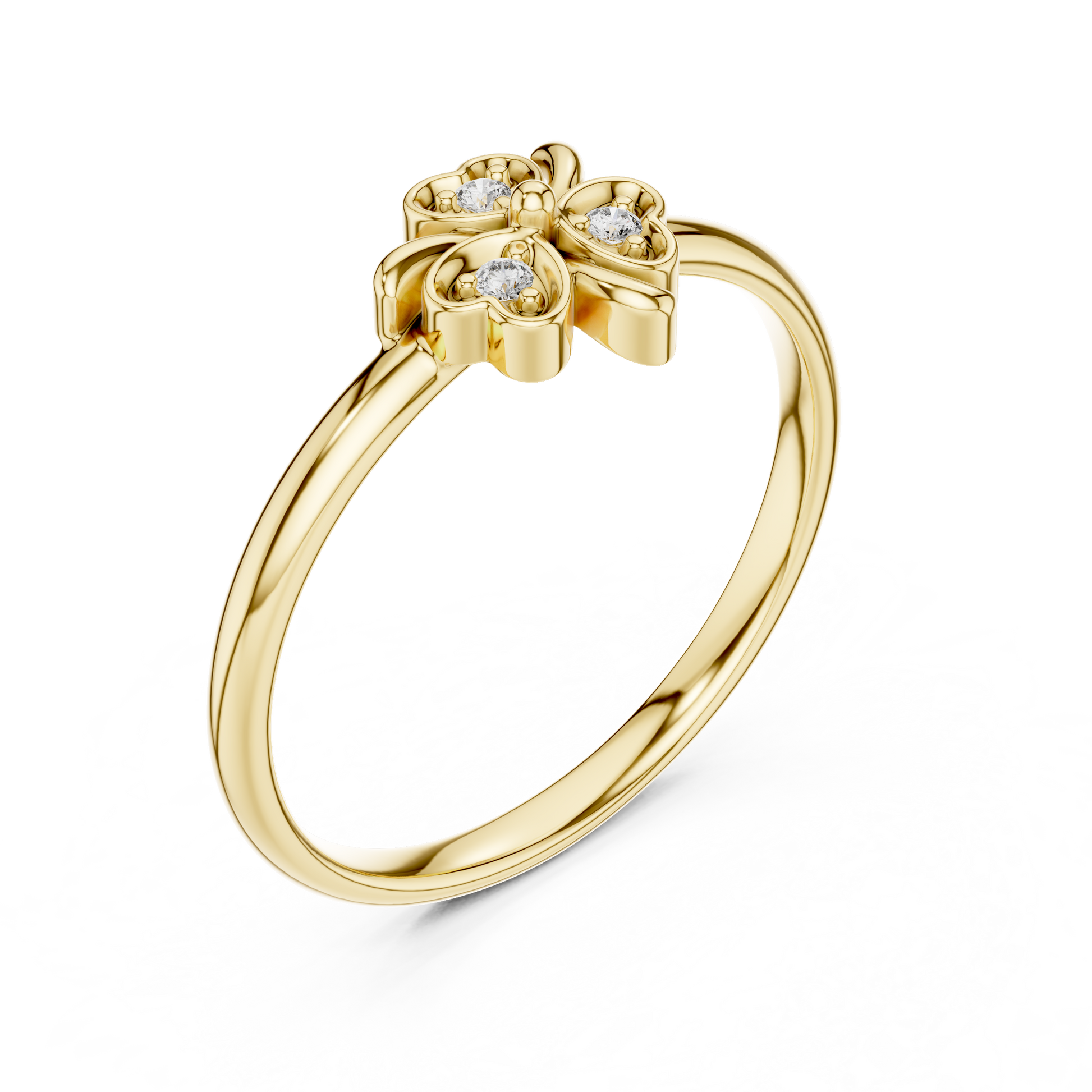 This elegant ring features a delicate three-leaf clover design crafted from polished gold, with each heart-shaped petal accented by a sparkling round diamond at its center. Its slim, refined band enhances the charm of the clover motif, creating a look that is both whimsical and timeless. Symbolizing luck, love, and positivity, this piece makes a meaningful gift or a graceful everyday accessory, adding a touch of brilliance and warmth to any jewelry collection.