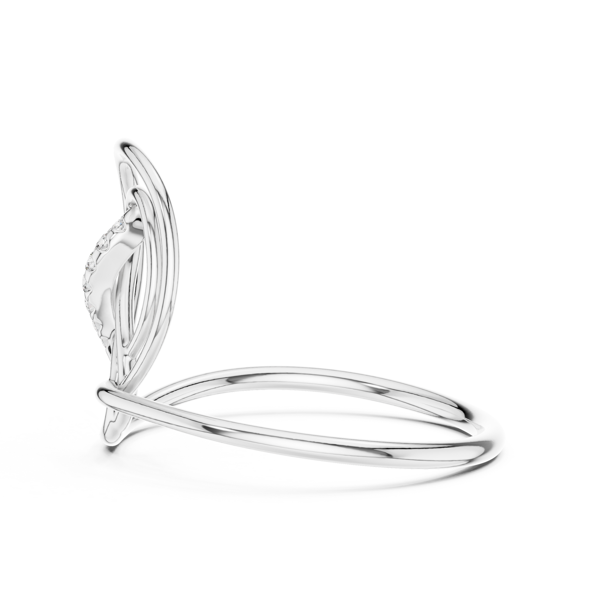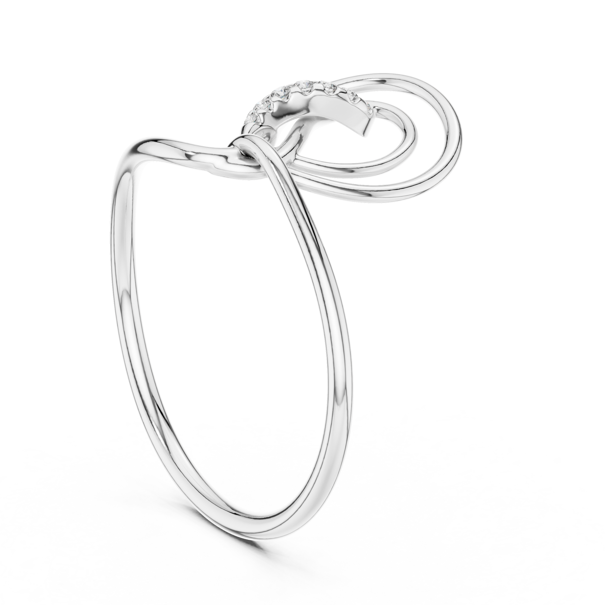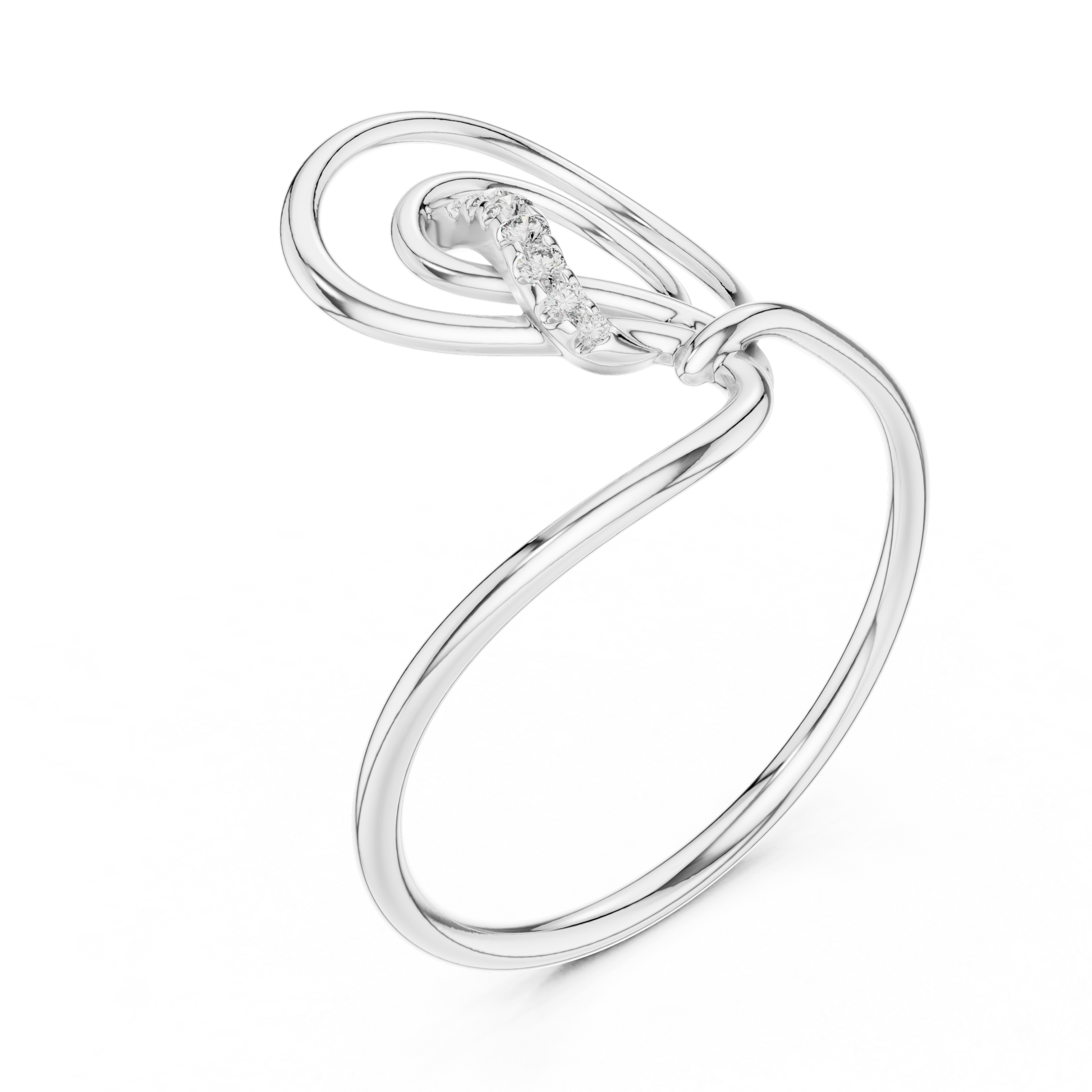 This captivating ring features an artistic arrangement of fluid loops, forming a graceful abstract silhouette that looks both modern and effortlessly organic. A delicate row of pavé-set round diamonds curves through the center, adding a ribbon of sparkling brilliance that enhances the flowing design. Crafted this piece blends simplicity with sculptural sophistication, offering a perfect balance of elegance, movement, and creative expression. A stunning choice for those who appreciate jewelry that feels truly unique and artfully designed.