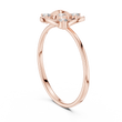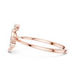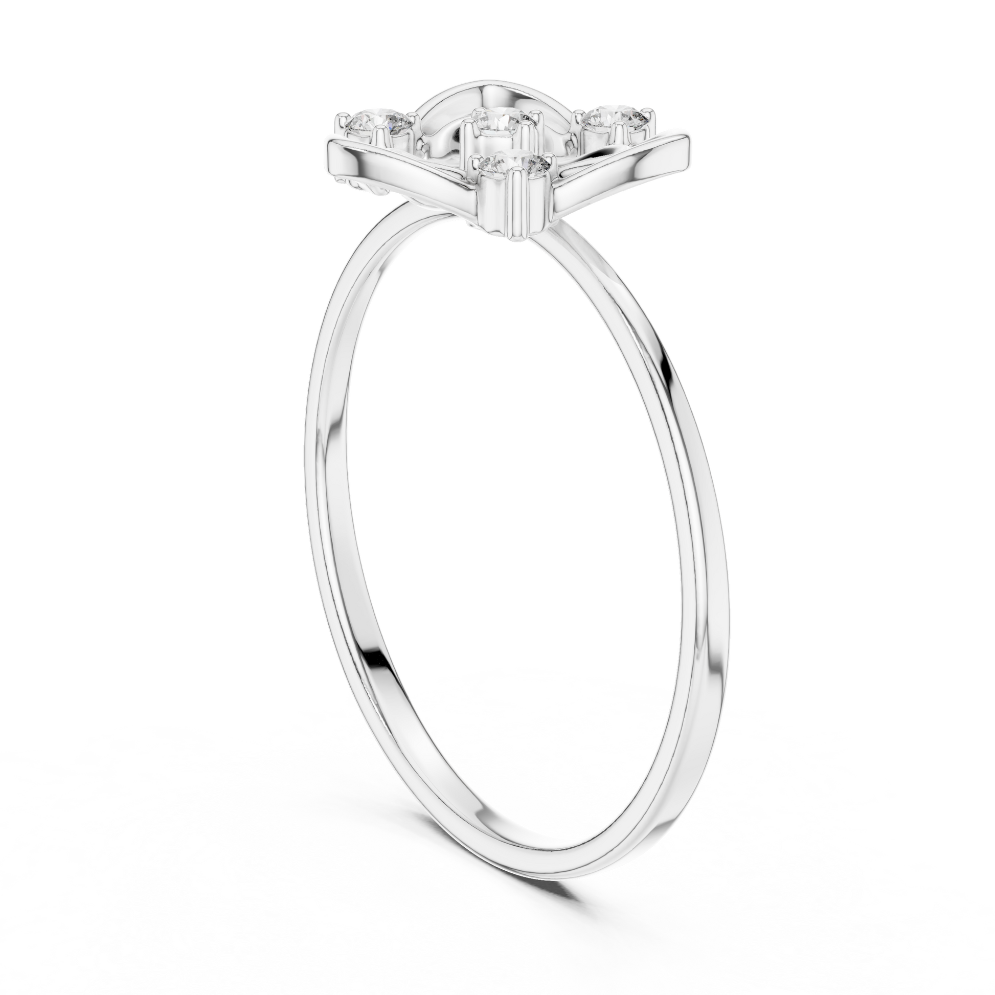 This striking ring showcases a radiant shield motif enriched with soft, organic curves that evoke the elegance of a blossoming flower. At its heart rests a brilliant round diamond, surrounded by three additional sparkling diamond accents that enhance its luminous symmetry. The airy, open-frame structure and dual-band design create a perfect harmony between strength and delicacy, making this piece a symbol of grace, confidence, and refined artistry.