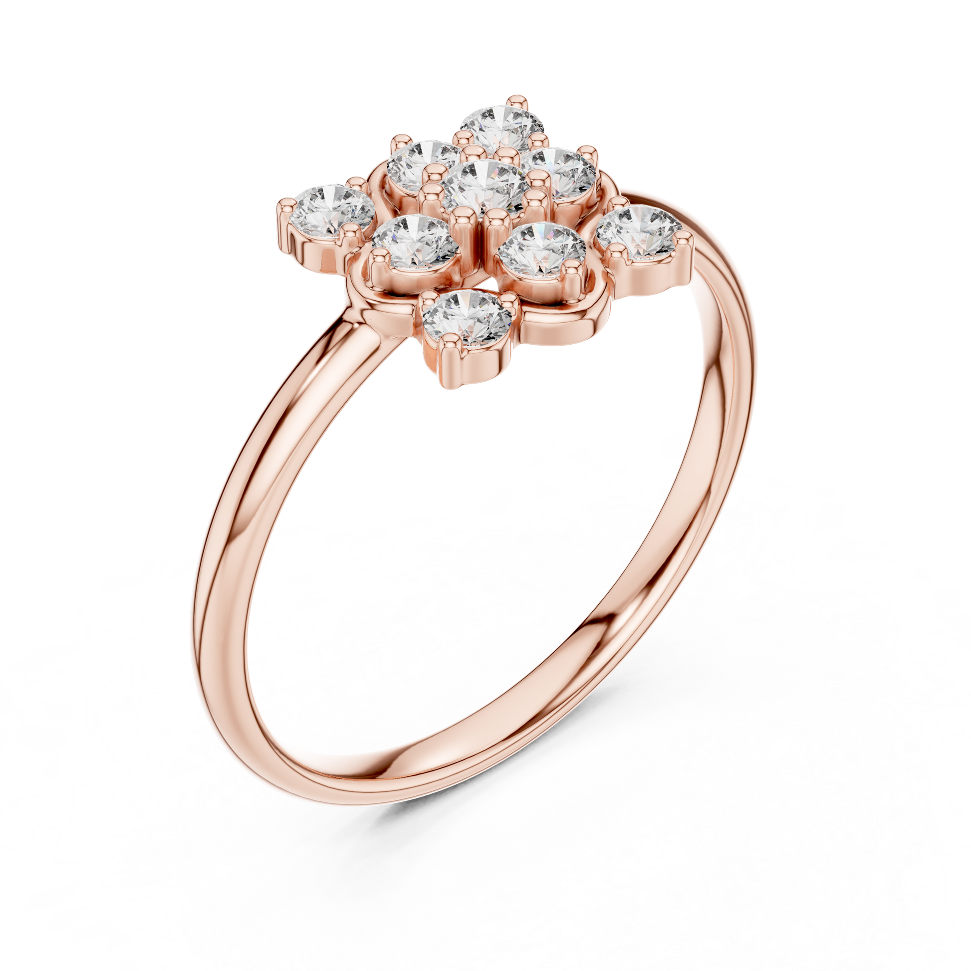 This beautifully crafted ring showcases an intricate floral cluster design made up of multiple brilliant Round cut diamonds, all set in band. The symmetrical flower-like arrangement creates a captivating sparkle from every angle, making it a standout piece for any jewelry lover. Its refined silhouette and luxurious craftsmanship make it ideal for special occasions, gifting, or elevating your everyday style. A perfect choice for those who appreciate elegance, shine, and artistic detailing.