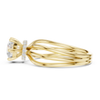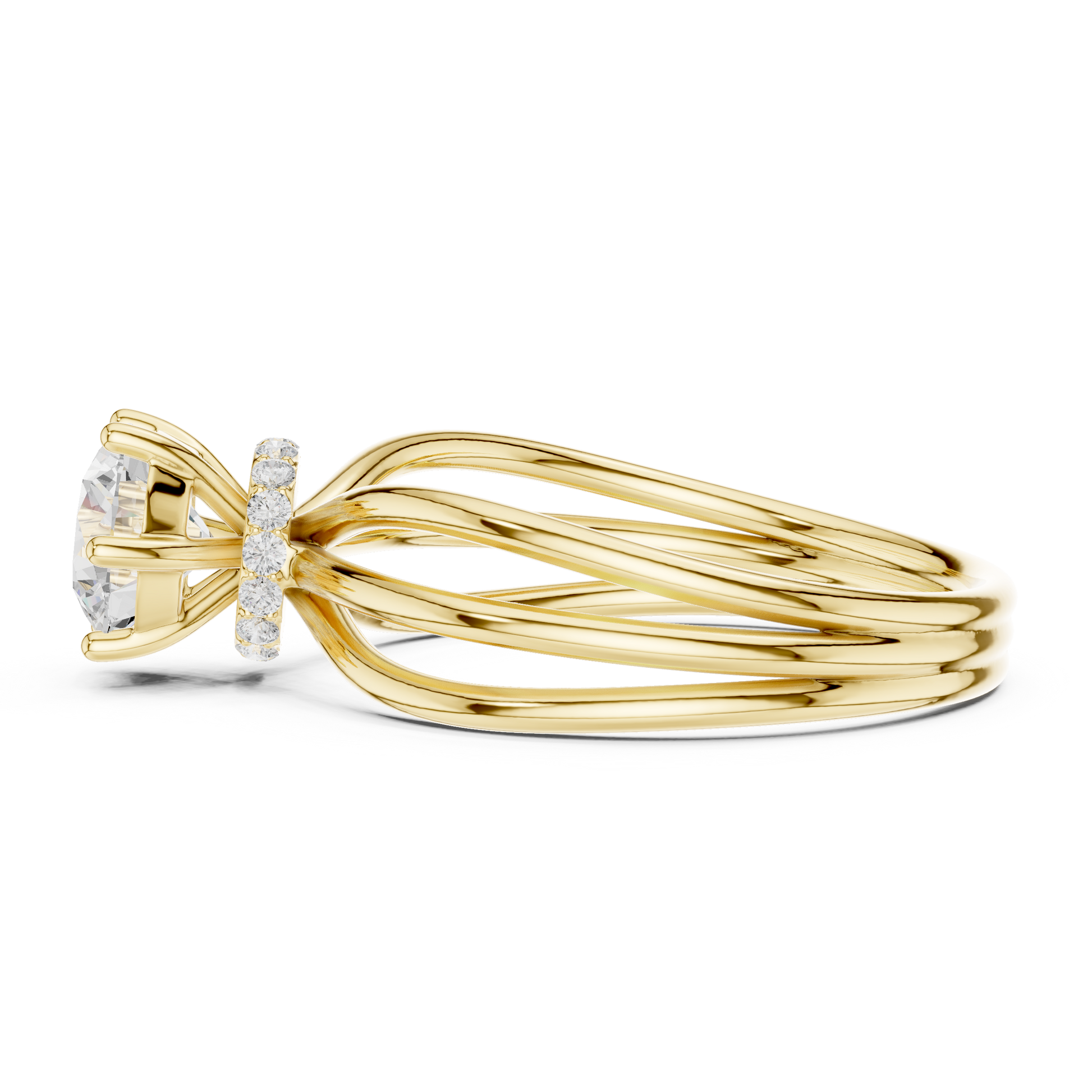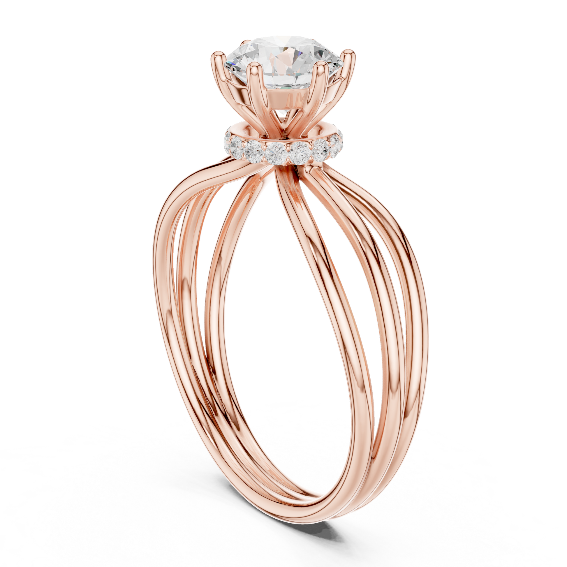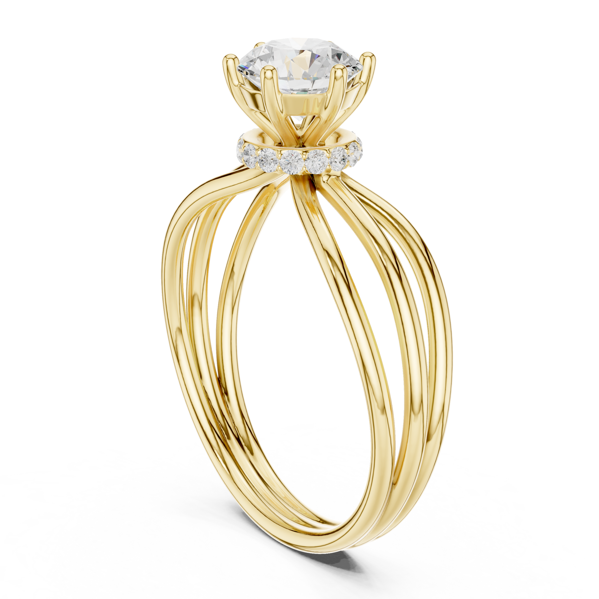 This exquisite ring showcases a Brilliant Round Solitaire set at the center, radiating exceptional sparkle. The stone is secured by a refined four-prong setting, accented with subtle micro diamonds at the base for an added touch of shimmer. Three sleek, bands gracefully merge into one, creating a modern yet timeless silhouette. Designed for those who appreciate both simplicity and sophistication, this piece offers a perfect blend of minimalist elegance and luxurious craftsmanship—an eye-catching statement for any occasion.