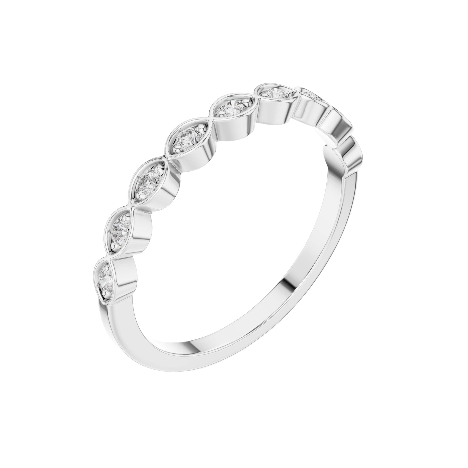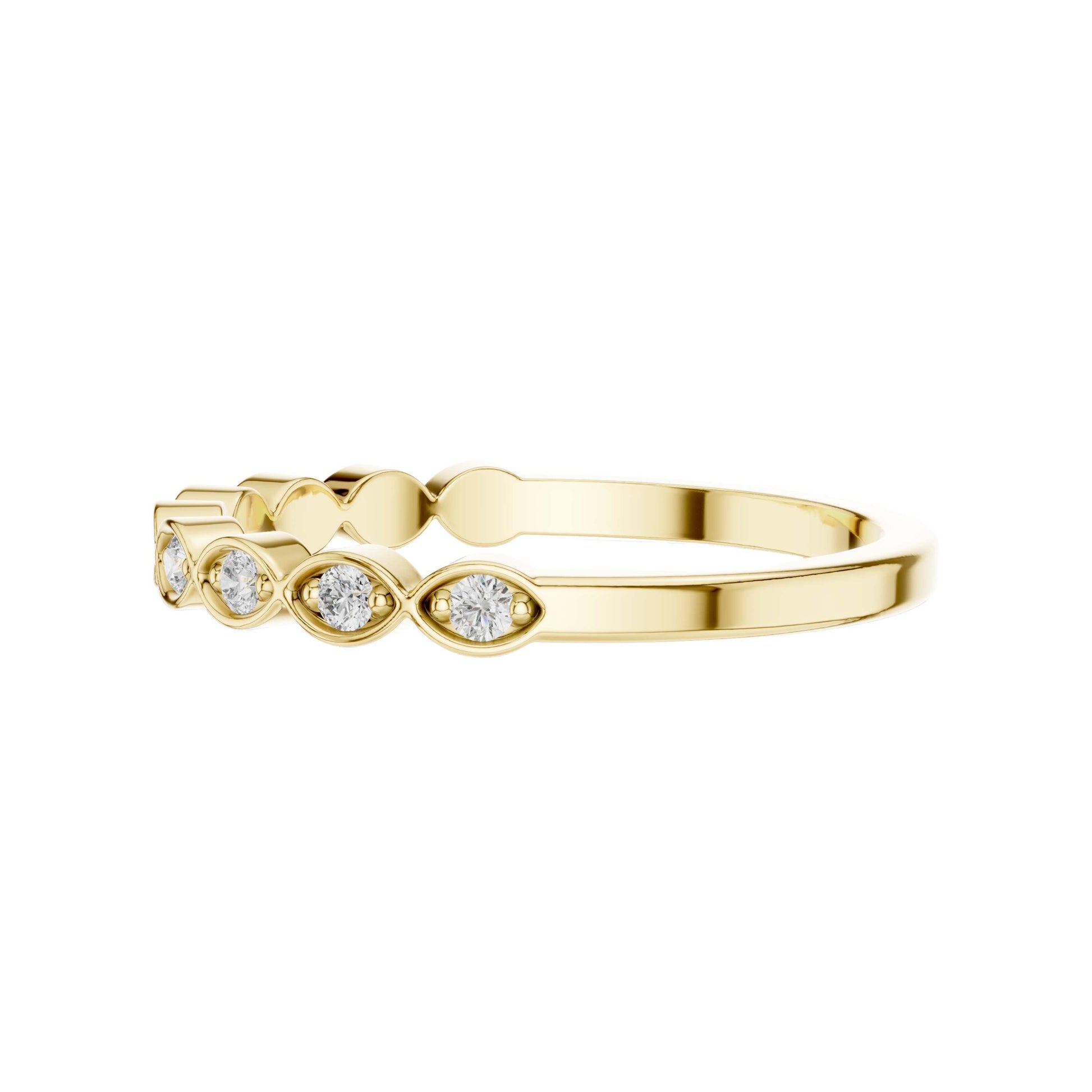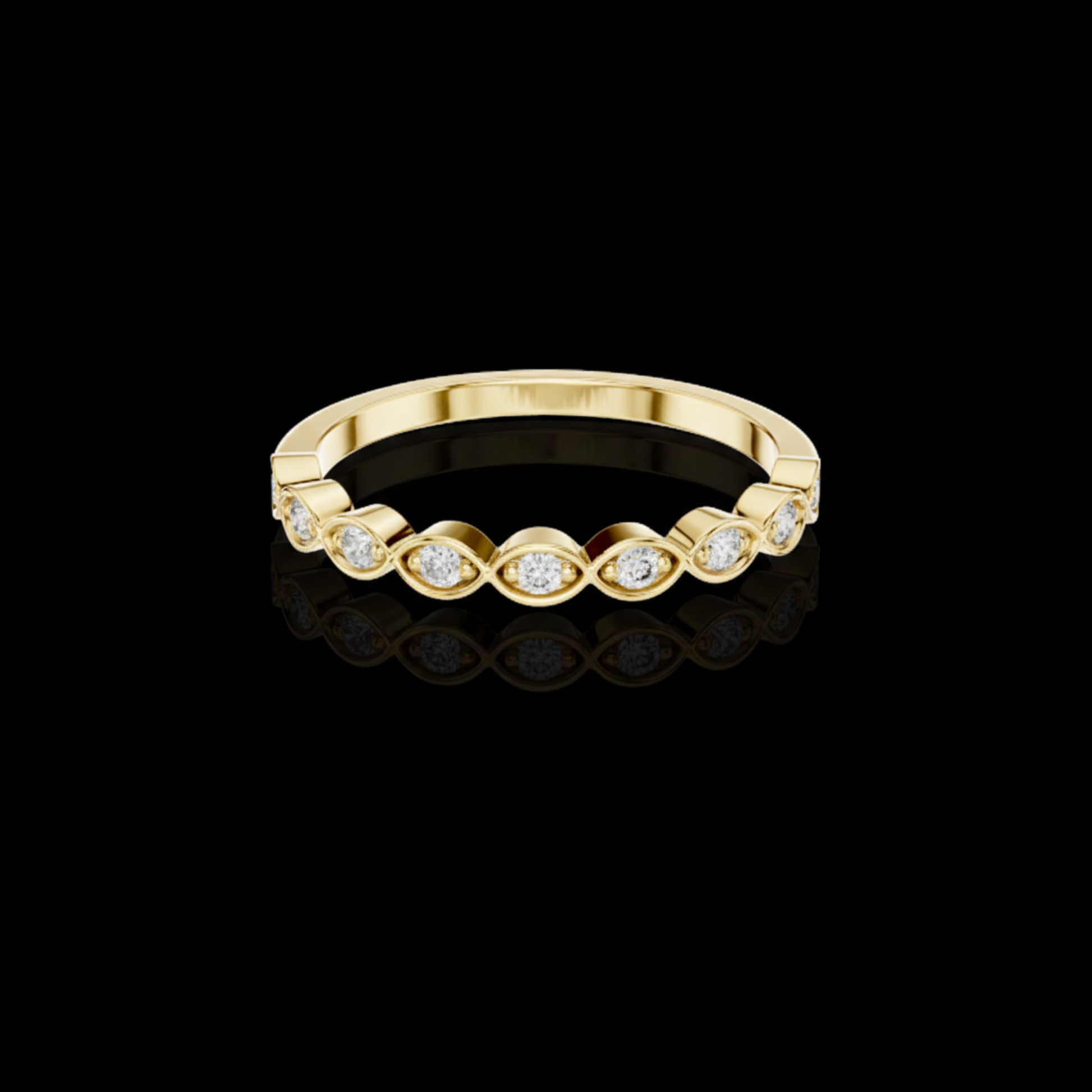 This elegant gold ring features a graceful row of round brilliant diamonds, each securely bezel-set within softly sculpted marquise-inspired frames. The flowing design creates a refined rhythm of light and shine, blending classic craftsmanship with a modern silhouette. Polished to a high luster, the band offers a smooth, comfortable fit, making it perfect as a wedding band, anniversary ring, or a sophisticated stacking piece for everyday luxury.