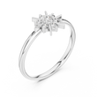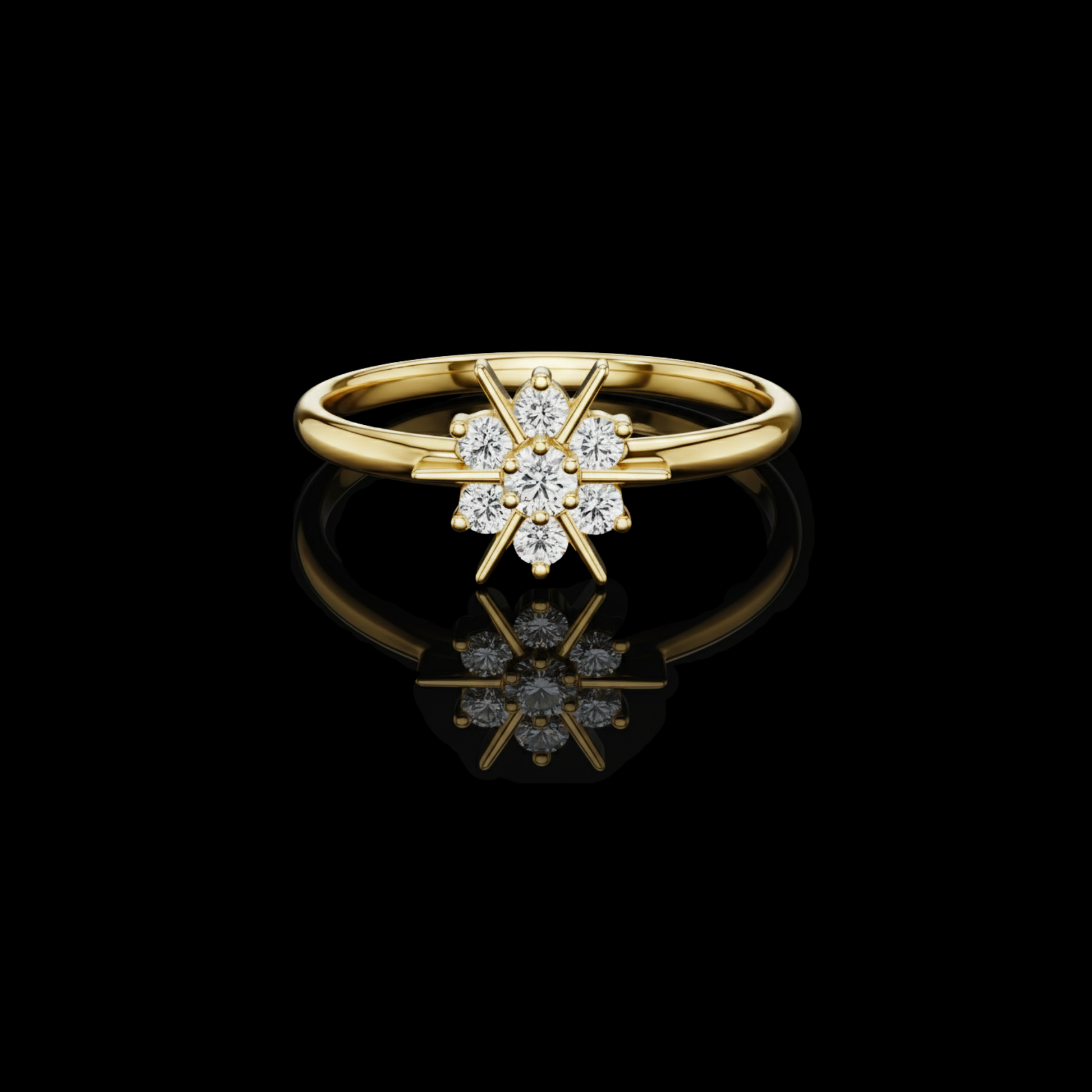 This captivating diamond ring showcases a stunning starburst motif, formed by a brilliant cluster of round-cut diamonds arranged in a radiant, symmetrical pattern. Sleek golden rays extend outward, enhancing its celestial charm. The band adds a luxurious touch, making this piece perfect for those who adore sparkling, artistic, and timeless jewelry with a modern celestial twist.