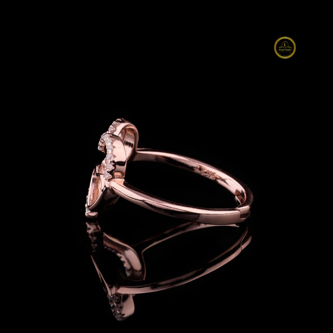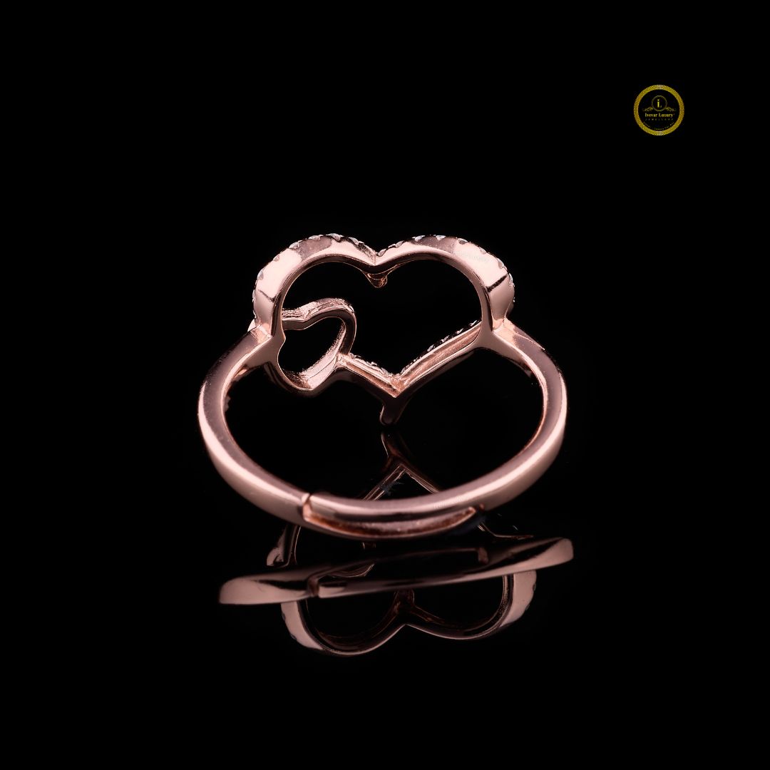 This elegant rose gold ring features a stunning double heart design, symbolizing love and connection. The larger heart is beautifully encrusted with sparkling round diamonds, while the smaller polished heart nestles gracefully within it, creating a timeless and romantic aesthetic. Perfect for anniversaries, engagements, or as a gift of affection, this piece combines sophistication, shine, and sentimental value in one captivating design.