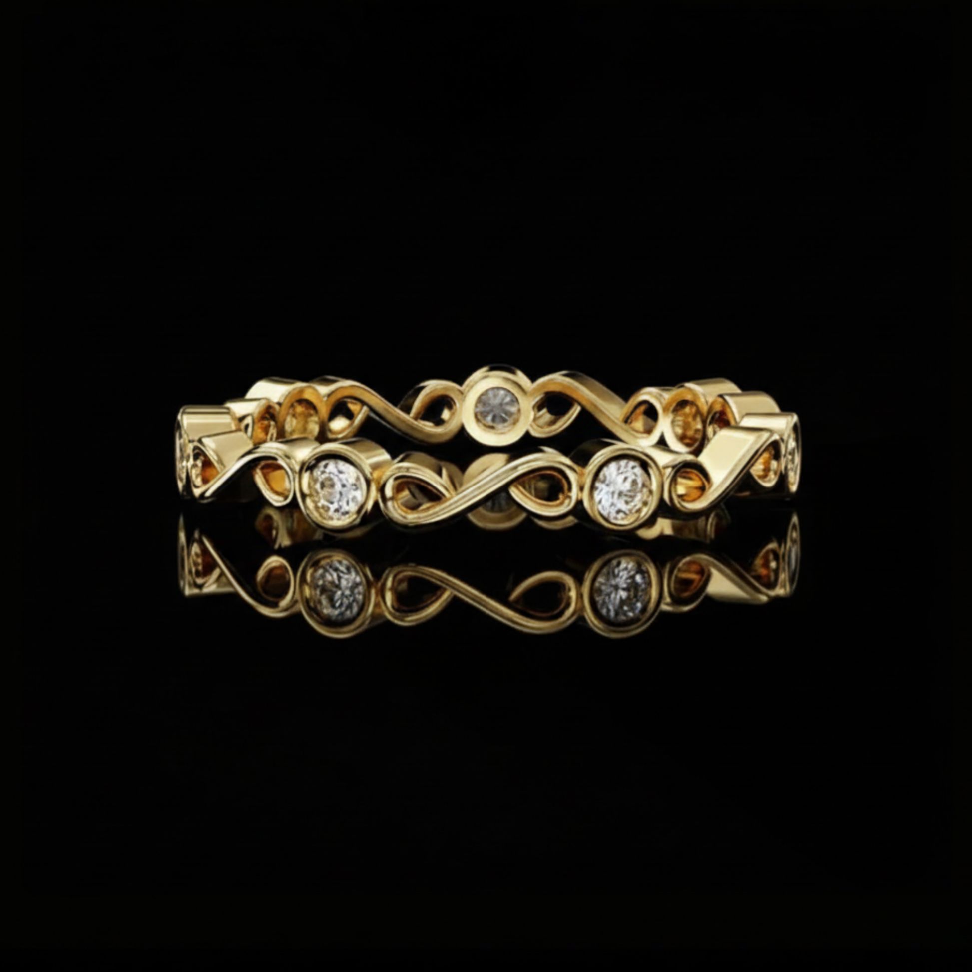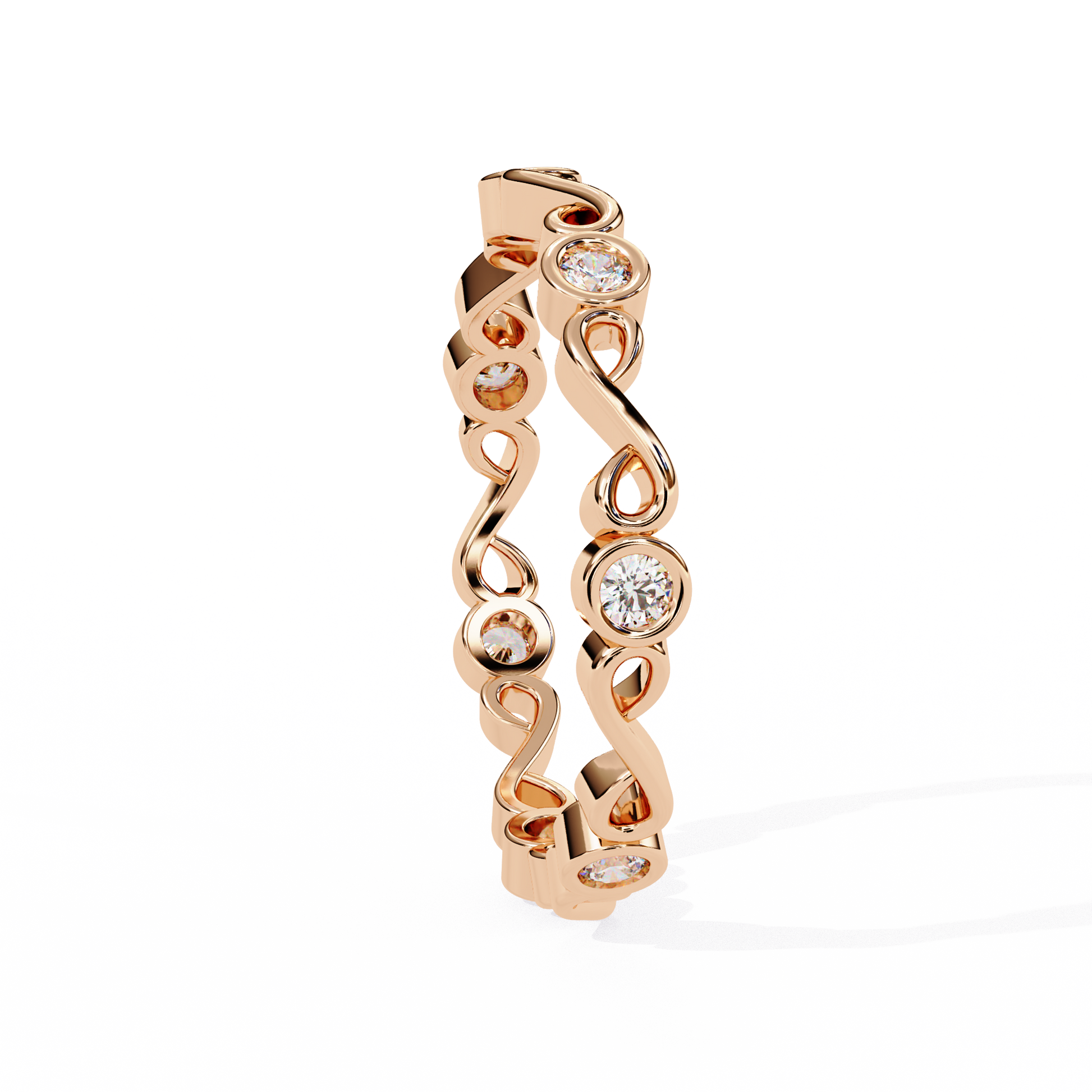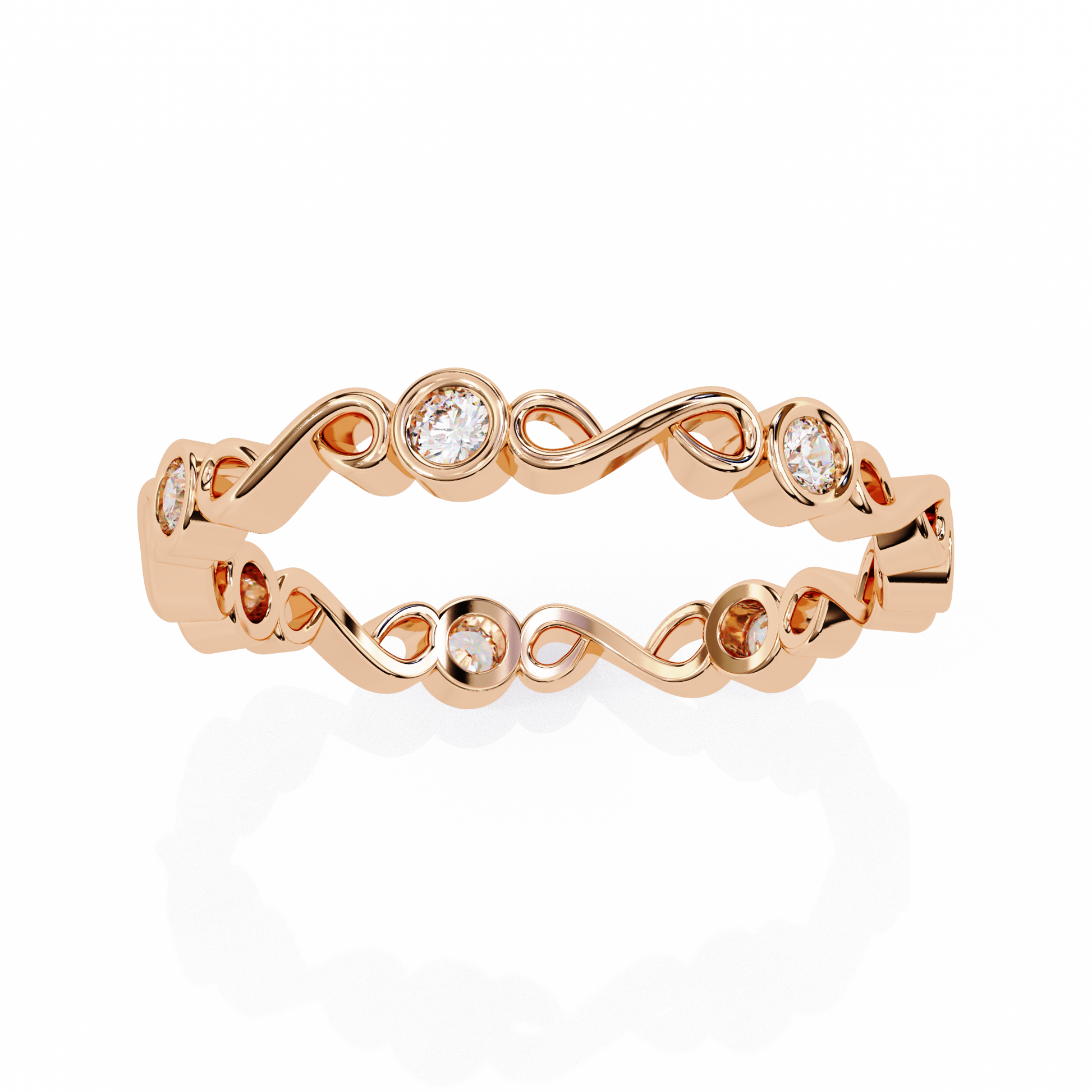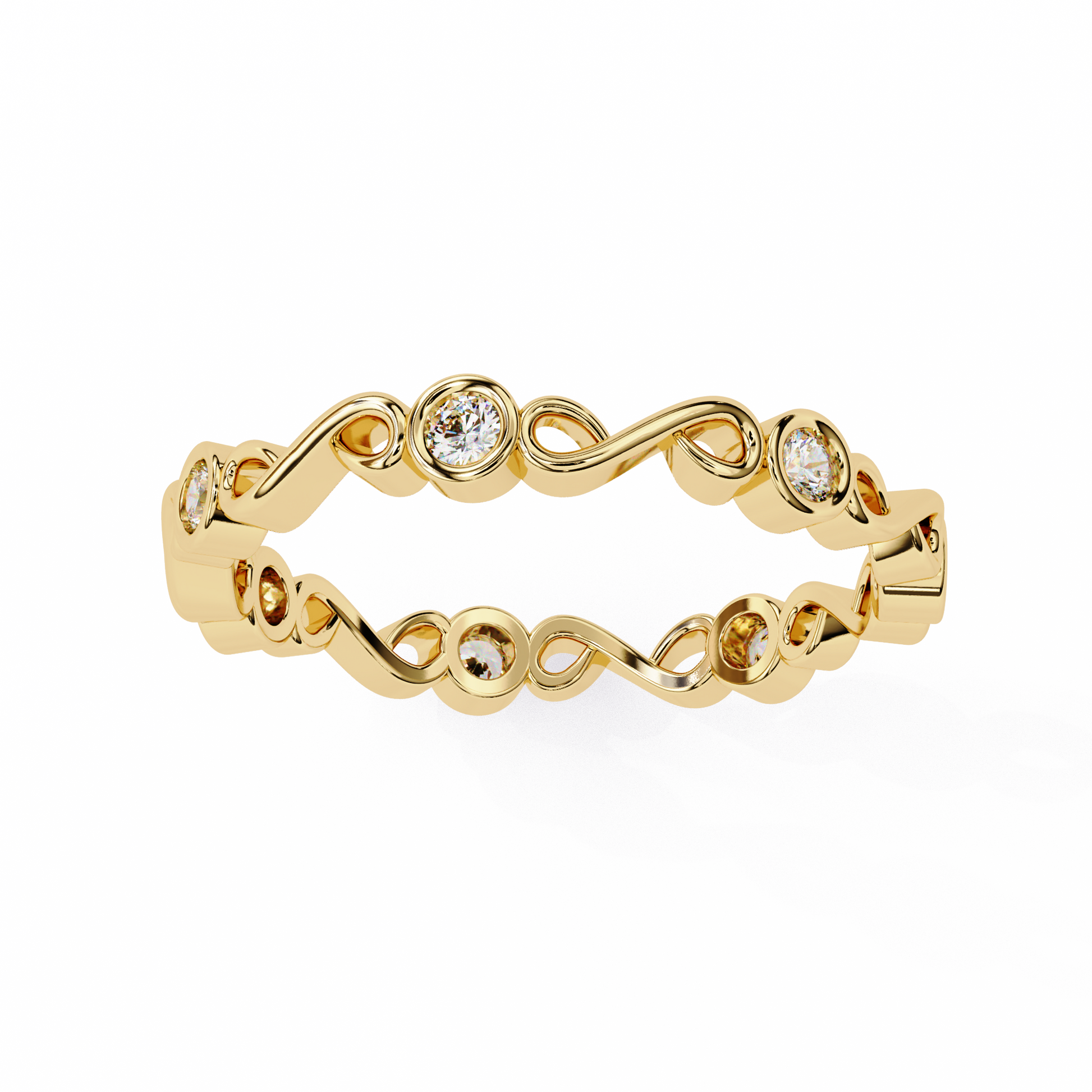 This exquisite ring features an unbroken infinity design crafted in Round gold, symbolizing everlasting love and timeless beauty. Each loop of the band is adorned with brilliant-cut diamonds set in smooth bezel settings, adding a touch of sparkle from every angle. Perfect as a promise ring, wedding band, or a meaningful anniversary gift, this piece blends delicate artistry with luxurious shine. Its intricate pattern and continuous diamond arrangement make it a truly unique and eye-catching accessory for any jewelry collection.