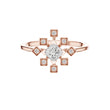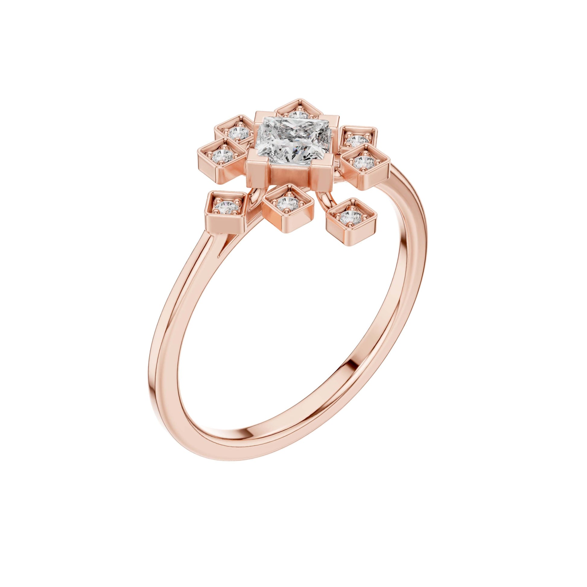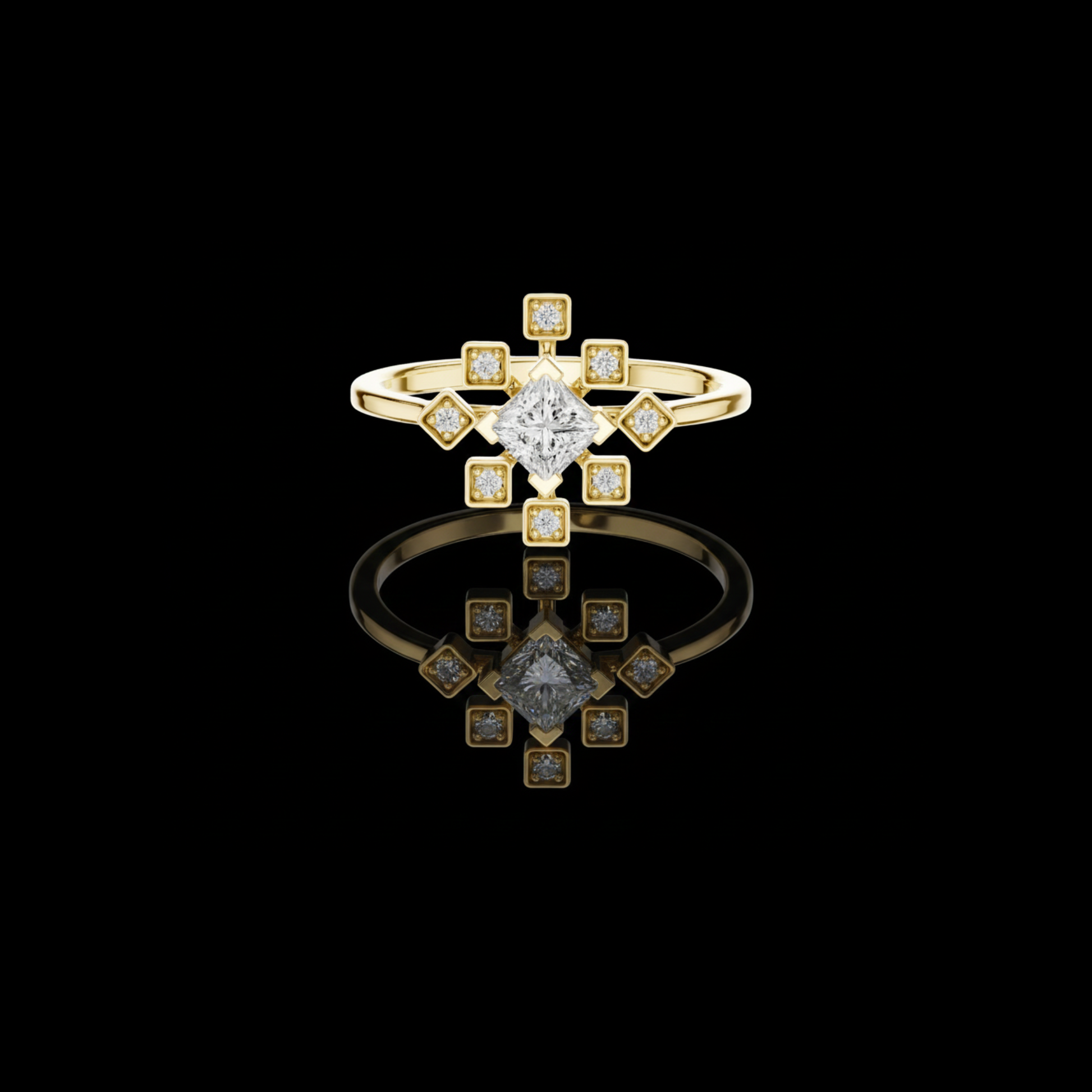 This elegant gold ring showcases a striking princess-cut center diamond framed by a radiant starburst of bezel-set accent diamonds, creating a perfect balance of modern geometry and timeless luxury. The polished gold band provides a warm, refined backdrop, while the symmetrical square motifs add depth, brilliance, and architectural charm. Designed to sparkle from every angle, this ring is a captivating statement piece—ideal for an engagement, anniversary, or a meaningful celebration of love and individuality.