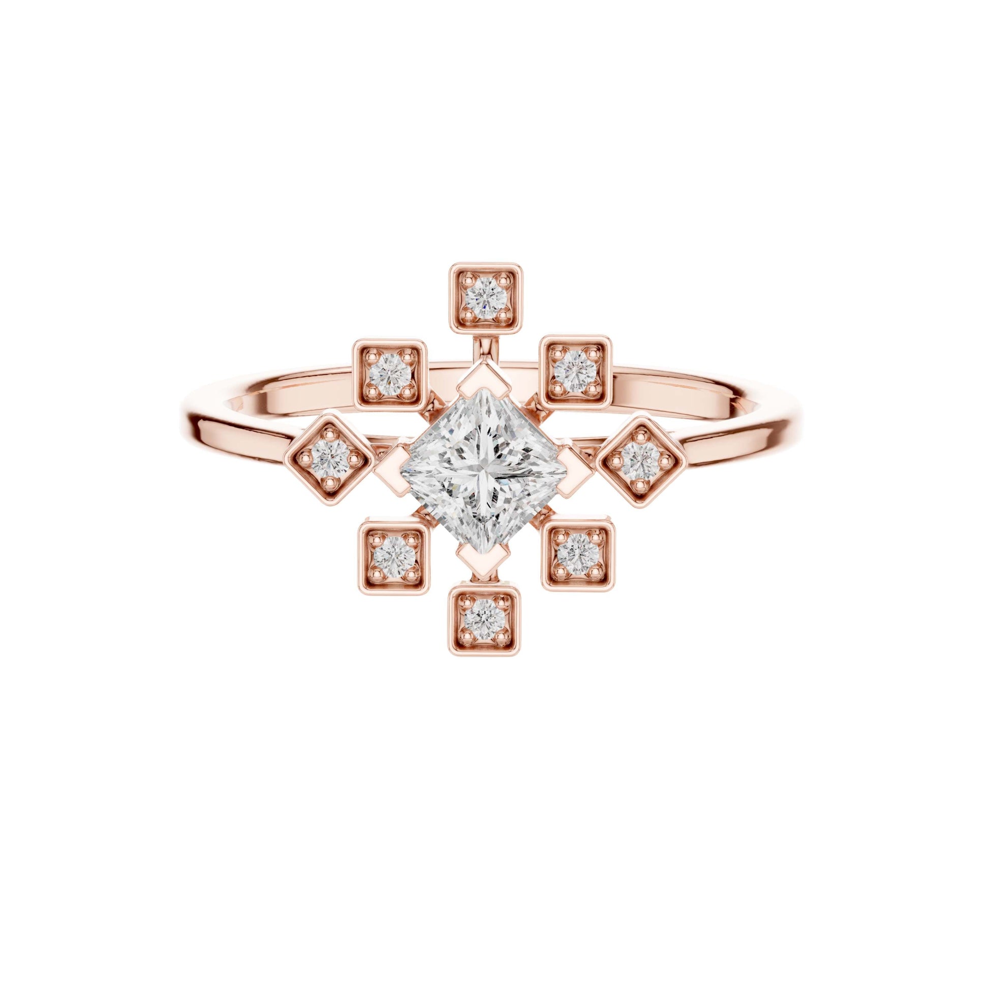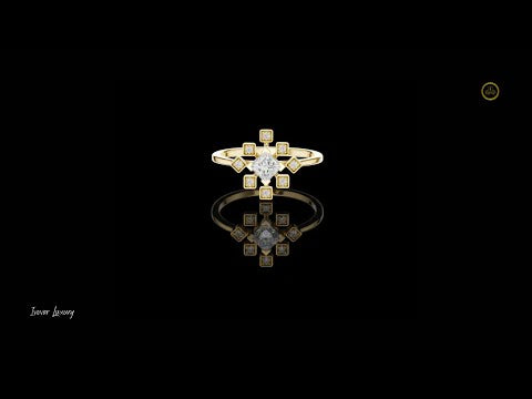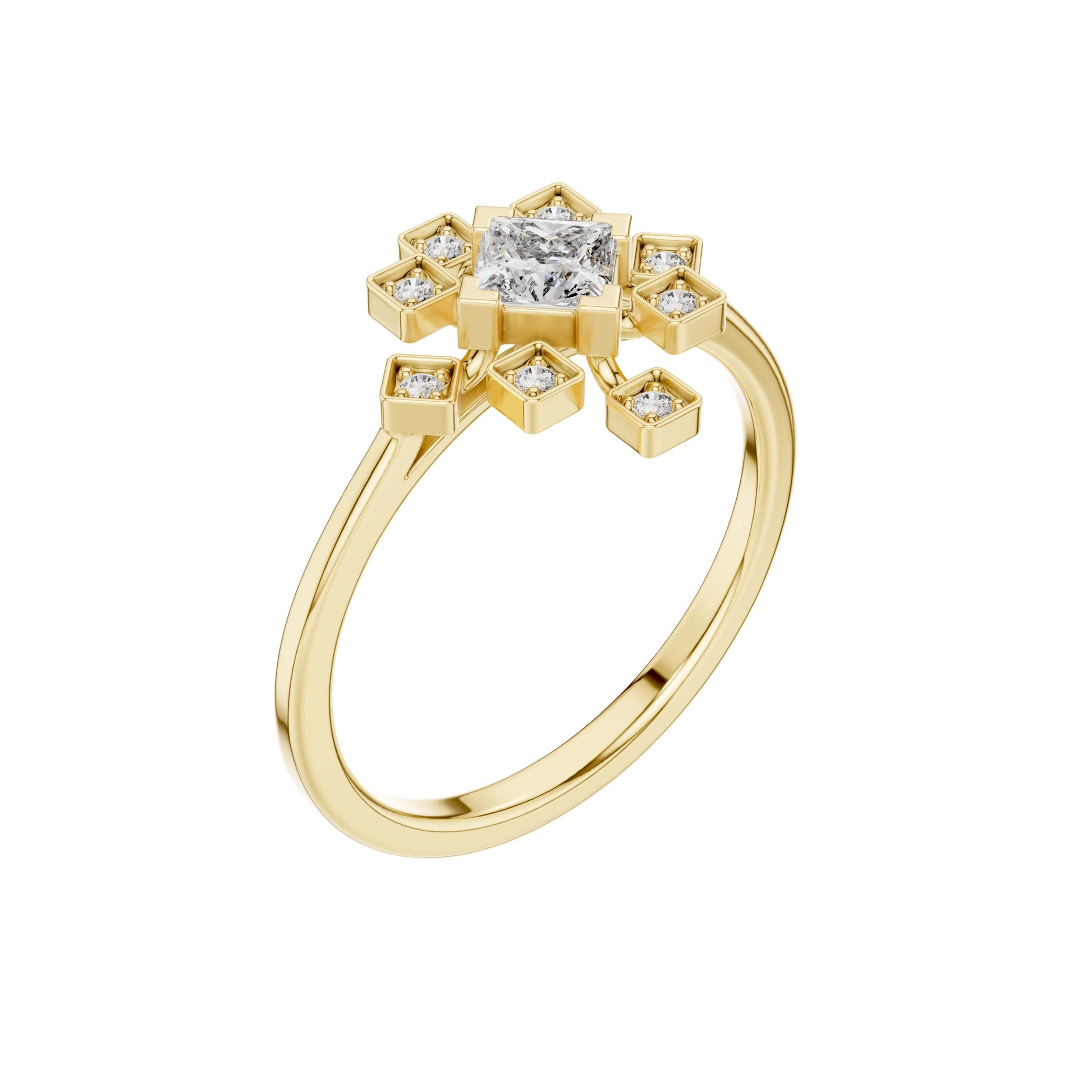 This elegant gold ring showcases a striking princess-cut center diamond framed by a radiant starburst of bezel-set accent diamonds, creating a perfect balance of modern geometry and timeless luxury. The polished gold band provides a warm, refined backdrop, while the symmetrical square motifs add depth, brilliance, and architectural charm. Designed to sparkle from every angle, this ring is a captivating statement piece—ideal for an engagement, anniversary, or a meaningful celebration of love and individuality.