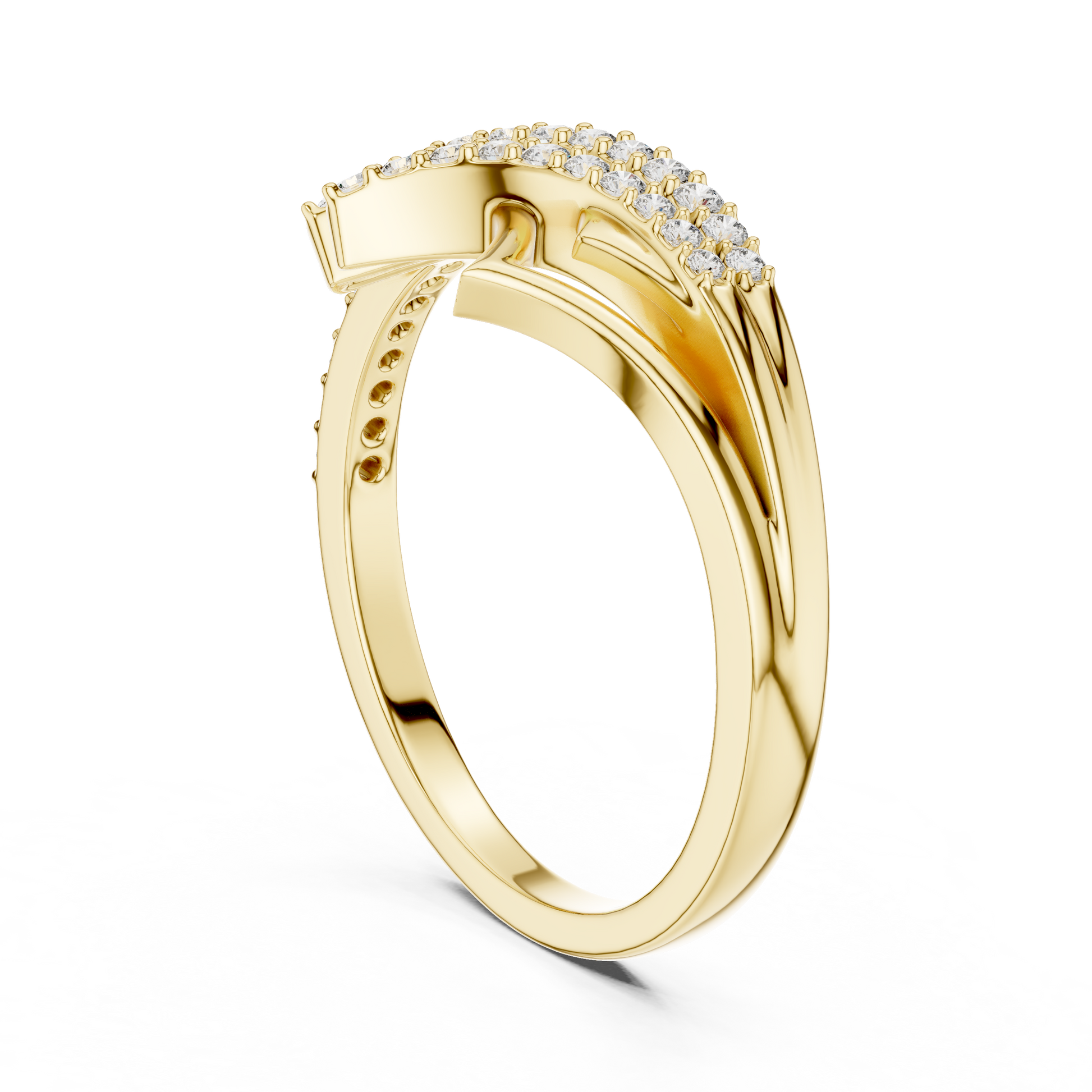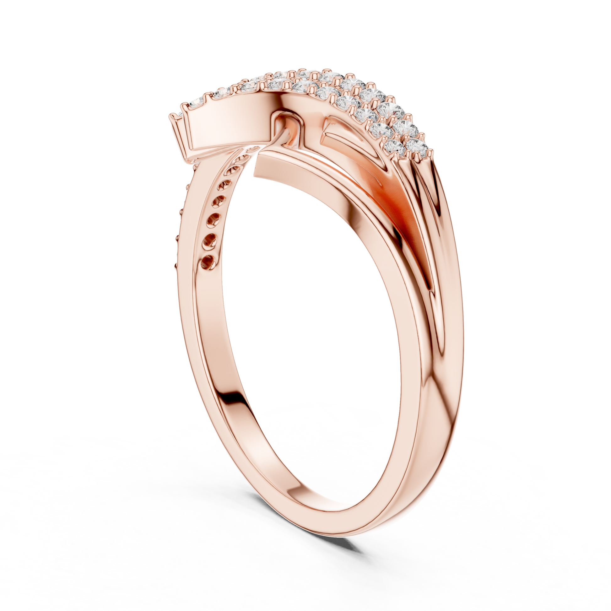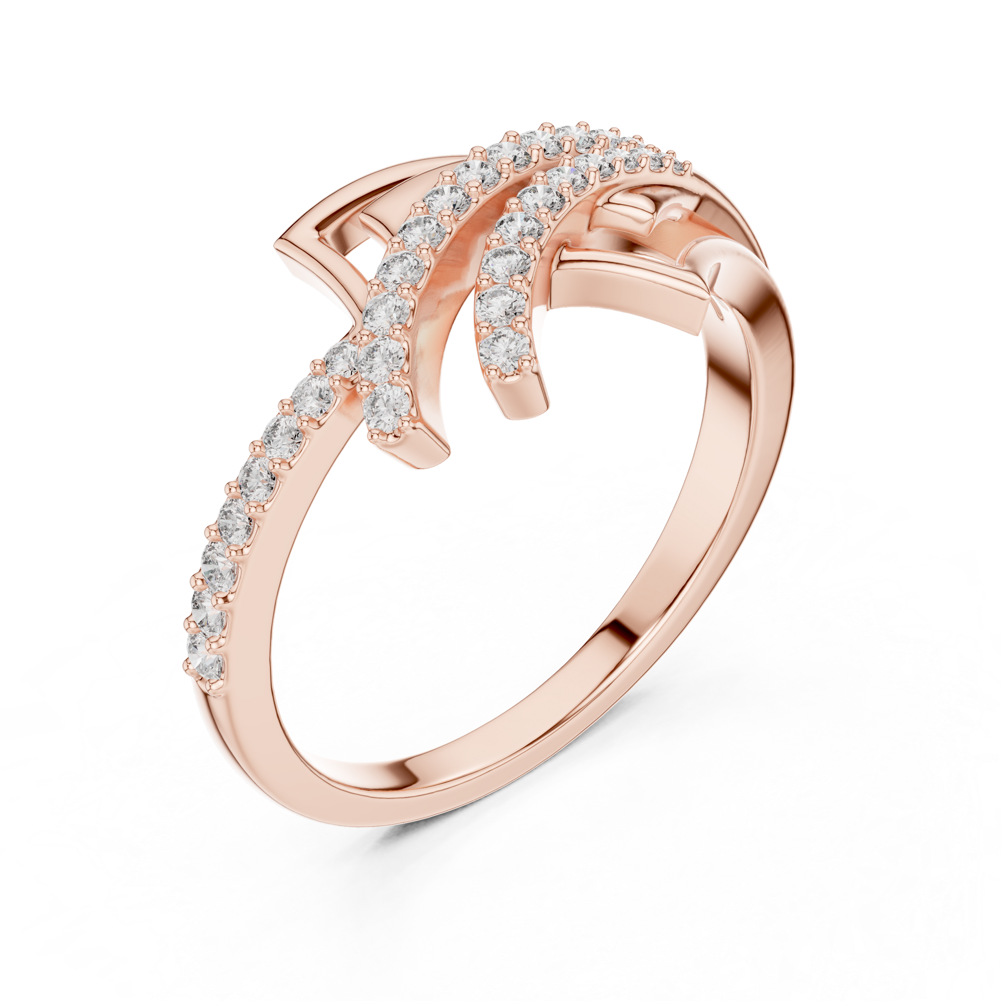 This striking geometric crossover ring is a refined expression of modern luxury and architectural beauty. Crafted in sleek angular forms intersect gracefully, creating a dynamic layered silhouette. Rows of brilliant-cut diamonds trace the flowing crossover lines, adding radiant sparkle and depth to the design. Perfect for those drawn to contemporary elegance with a bold edge, this ring is ideal as a statement piece, a celebration of milestones, or an elevated everyday luxury accessory.