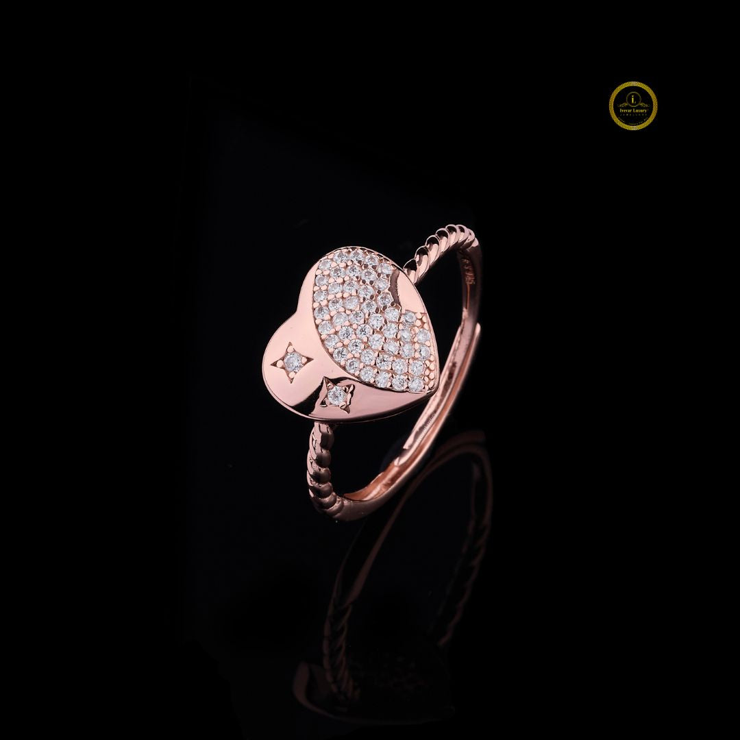 This exquisite rose gold heart ring embodies elegance and romantic charm. The heart centerpiece showcases a mesmerizing half-pavé diamond design paired with a smooth, high-polish finish, symbolizing the perfect balance between sparkle and simplicity. The twisted band adds a touch of sophistication, making it a beautiful expression of love, unity, and timeless beauty. Ideal for special occasions or as a meaningful gift, this ring captures the essence of refined luxury and grace by Ivevar.