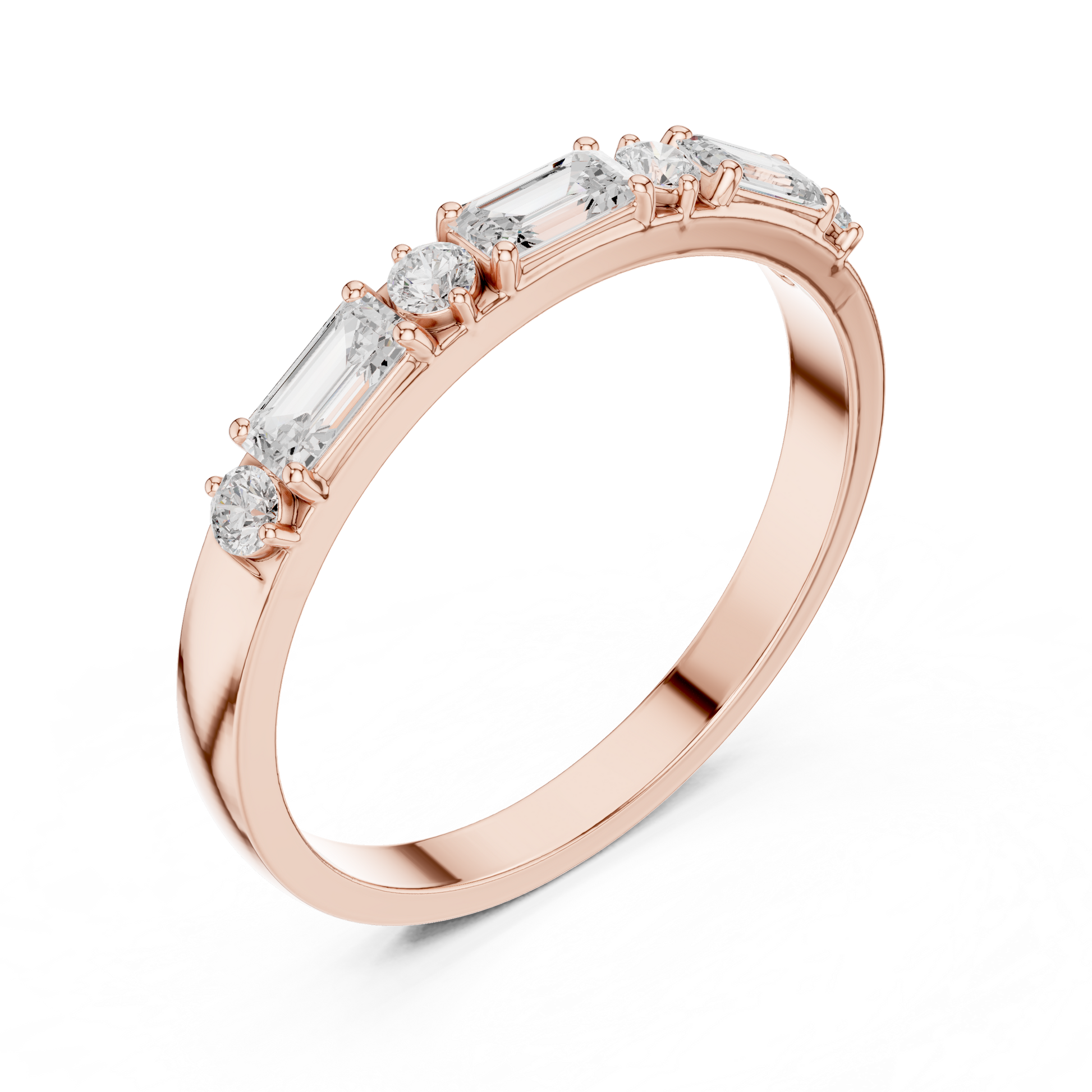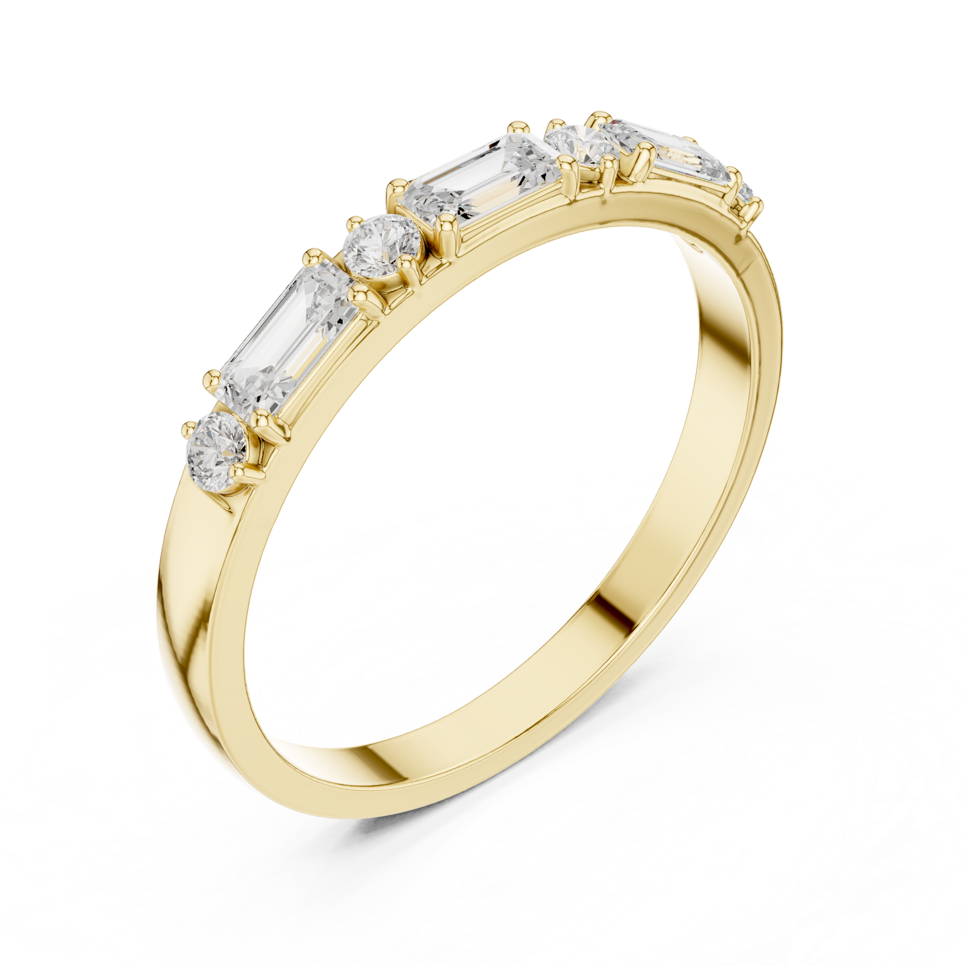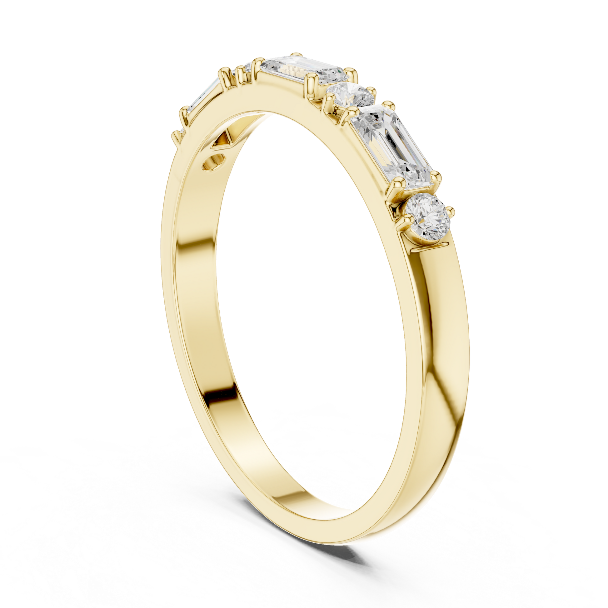 This refined gold band showcases a striking sequence of alternating baguette and round diamonds set in a sleek linear arrangement. The clean geometry of baguette cuts blends beautifully with the soft sparkle of round diamonds, creating a balanced and sophisticated design. Perfect for stacking, wedding wear, or modern luxury styling, this ring delivers timeless elegance with contemporary precision.