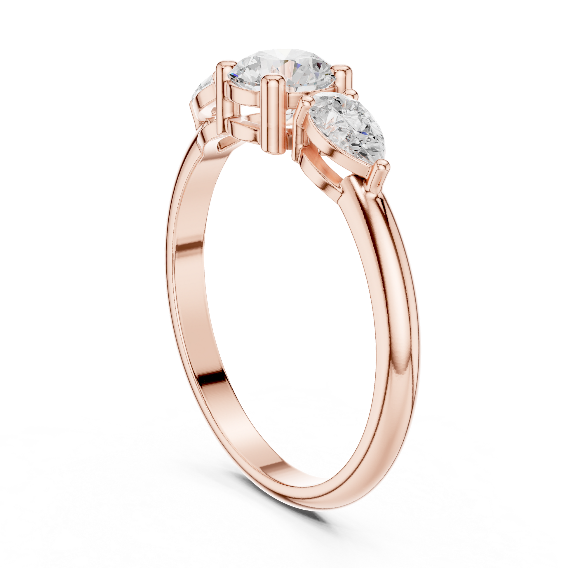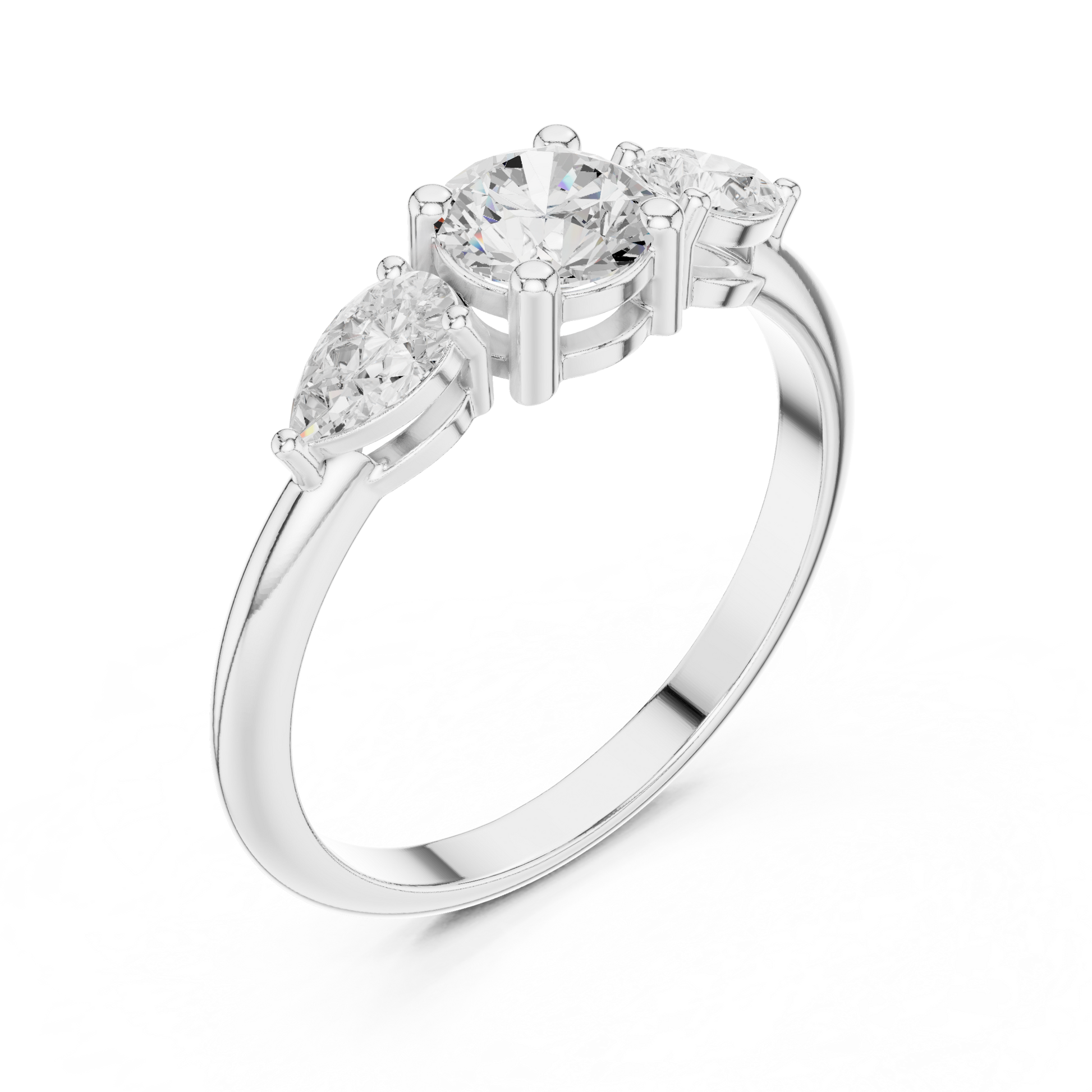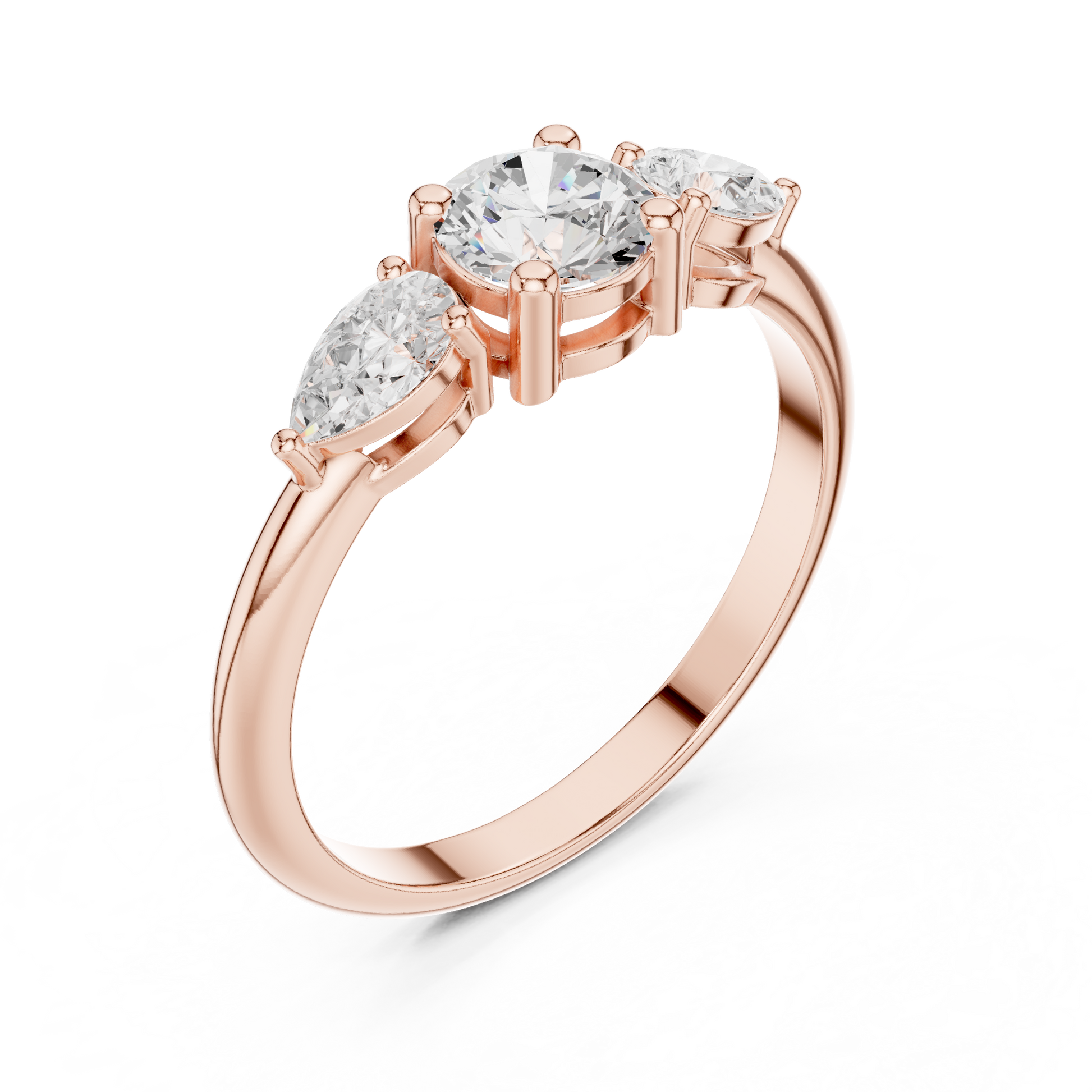 The Petal Grace Diamond Ring captures the poetry of nature and the elegance of fine craftsmanship. At its center shines a brilliant round-cut diamond, gracefully embraced by pear-shaped side diamonds that resemble delicate petals in bloom.Crafted in high, the smooth band enhances the diamonds’ radiance while offering timeless comfort and durability. The three-stone design symbolizes love’s past, present, and future, making this ring a meaningful choice for an engagement, anniversary, or milestone celebration.