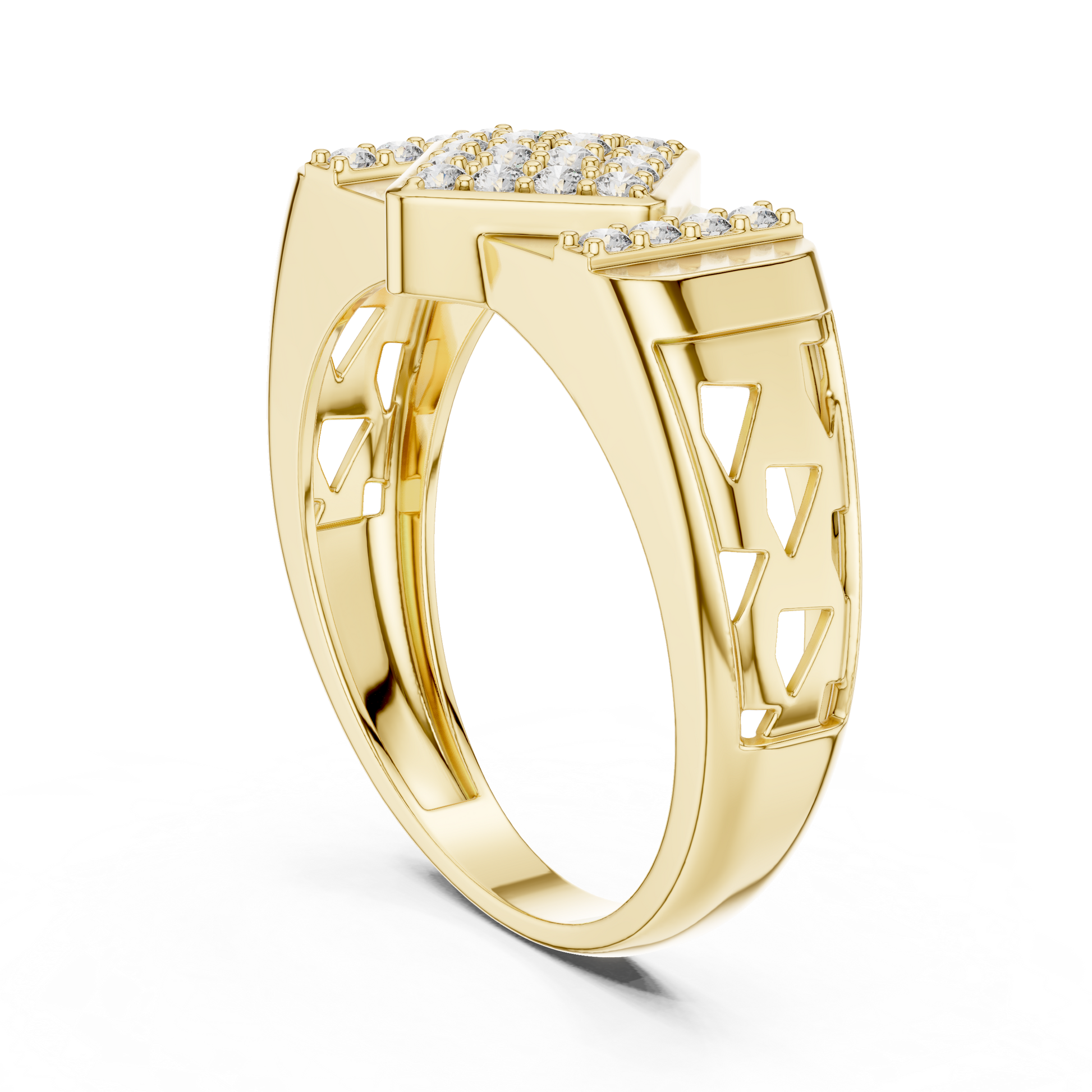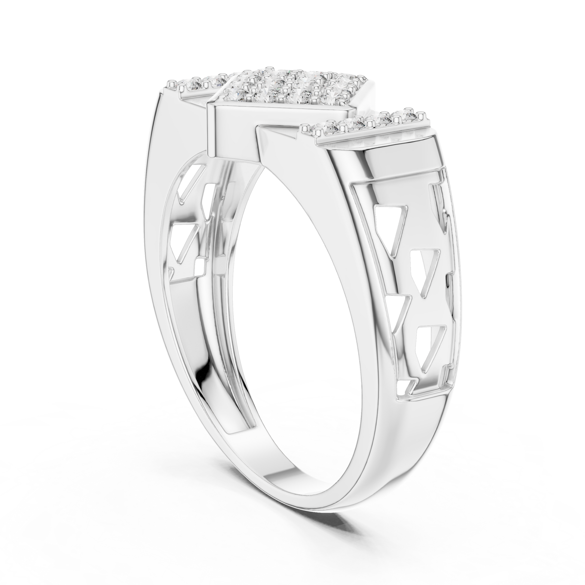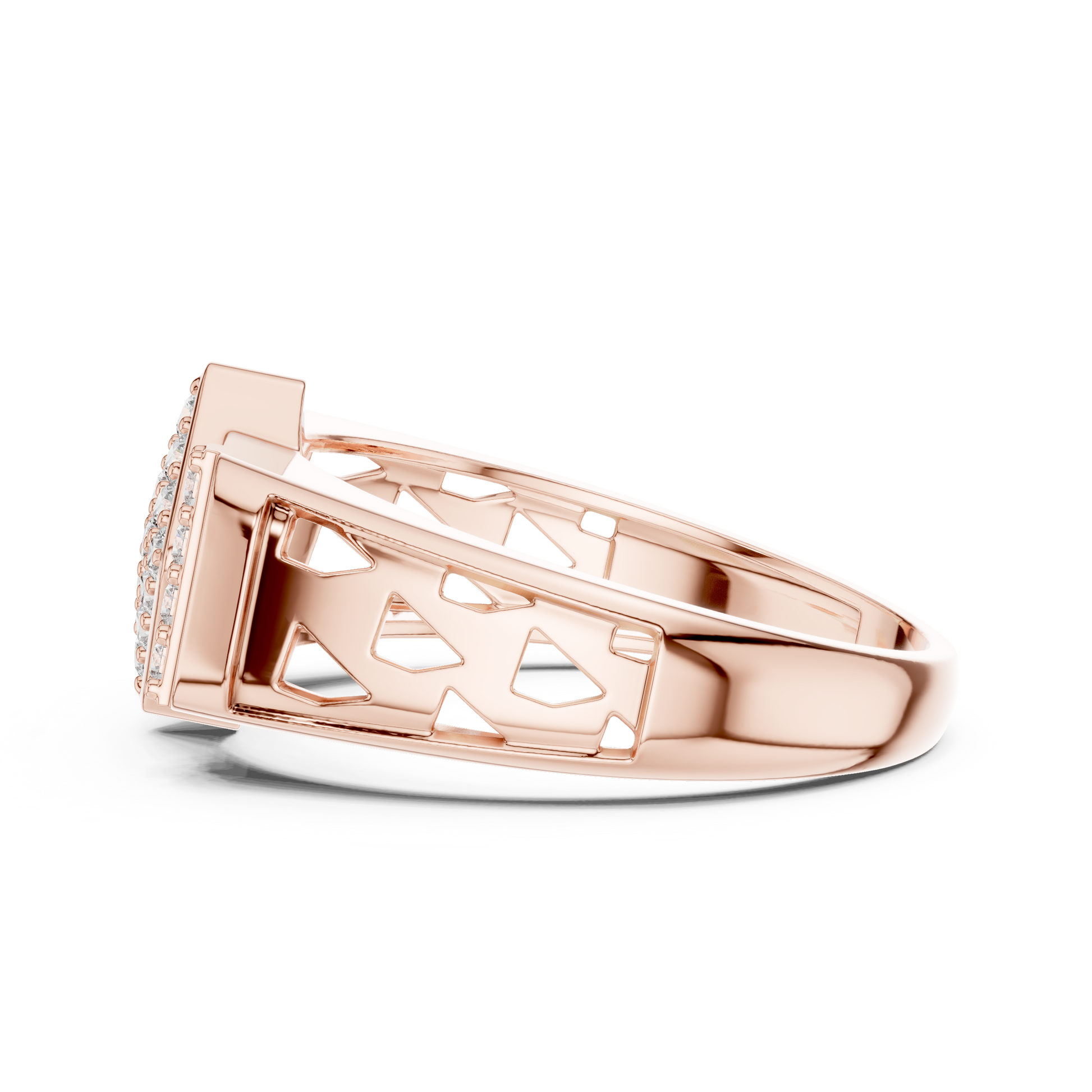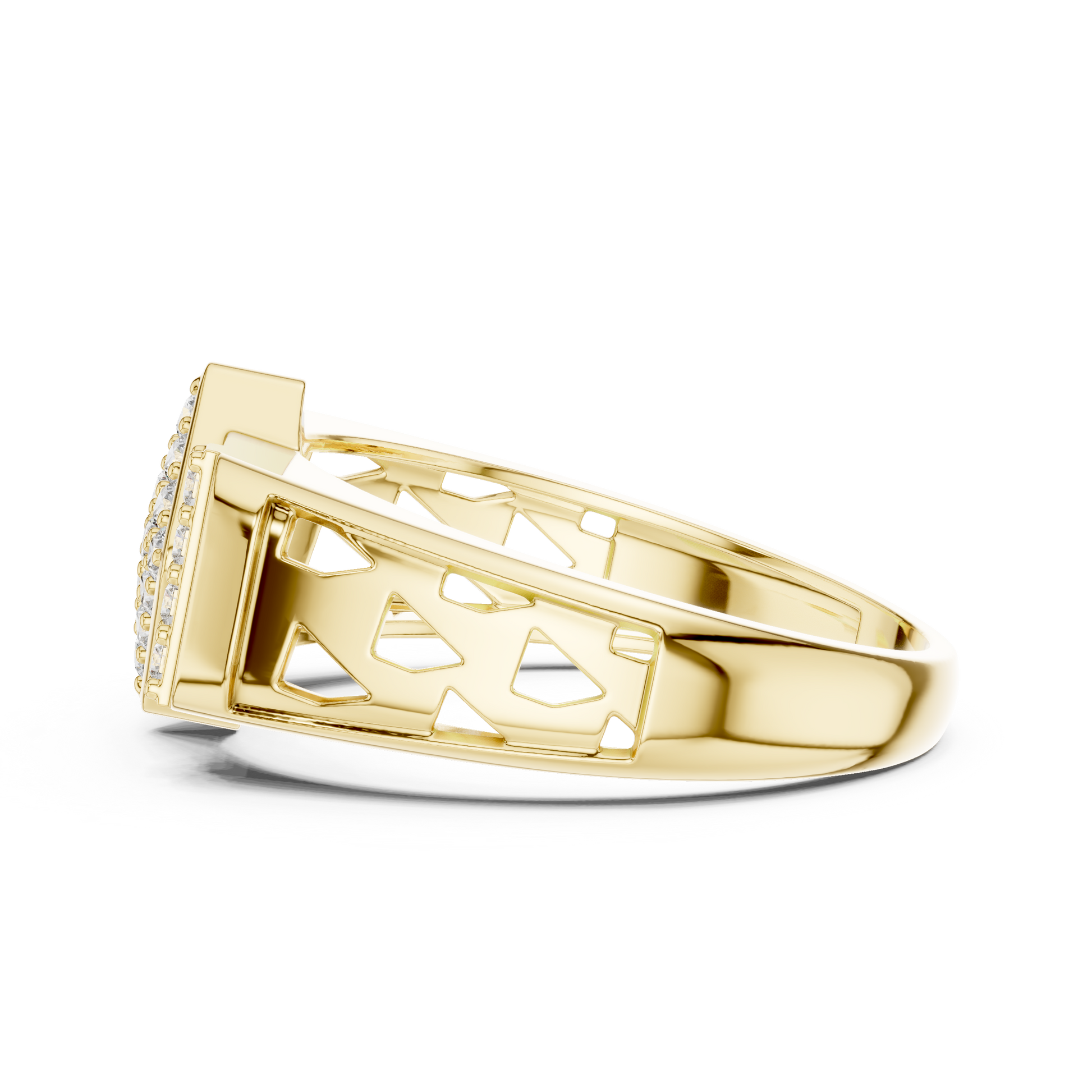 This bold geometric design from IVEVAR LUXURY features a striking square diamond cluster set in a square style orientation, creating a powerful and modern statement. The center is adorned with multiple round brilliant diamonds in a pavé setting, enhanced by diamond-accented side panels that add depth and symmetry. the wide band showcases elegant openwork cutout detailing along the sides, blending architectural beauty with refined luxury.