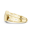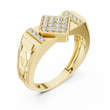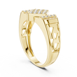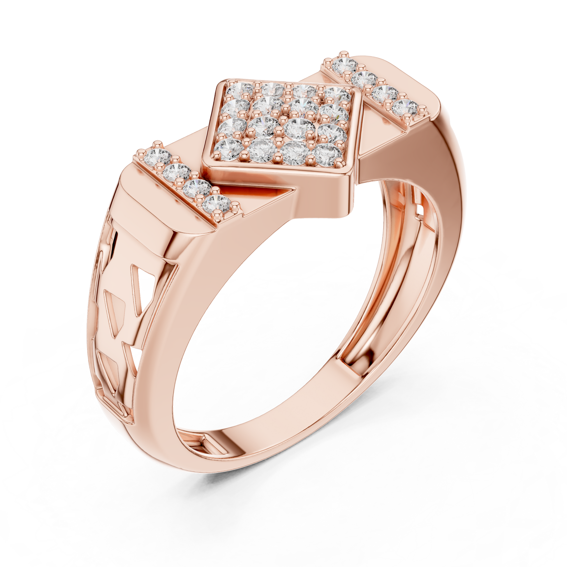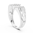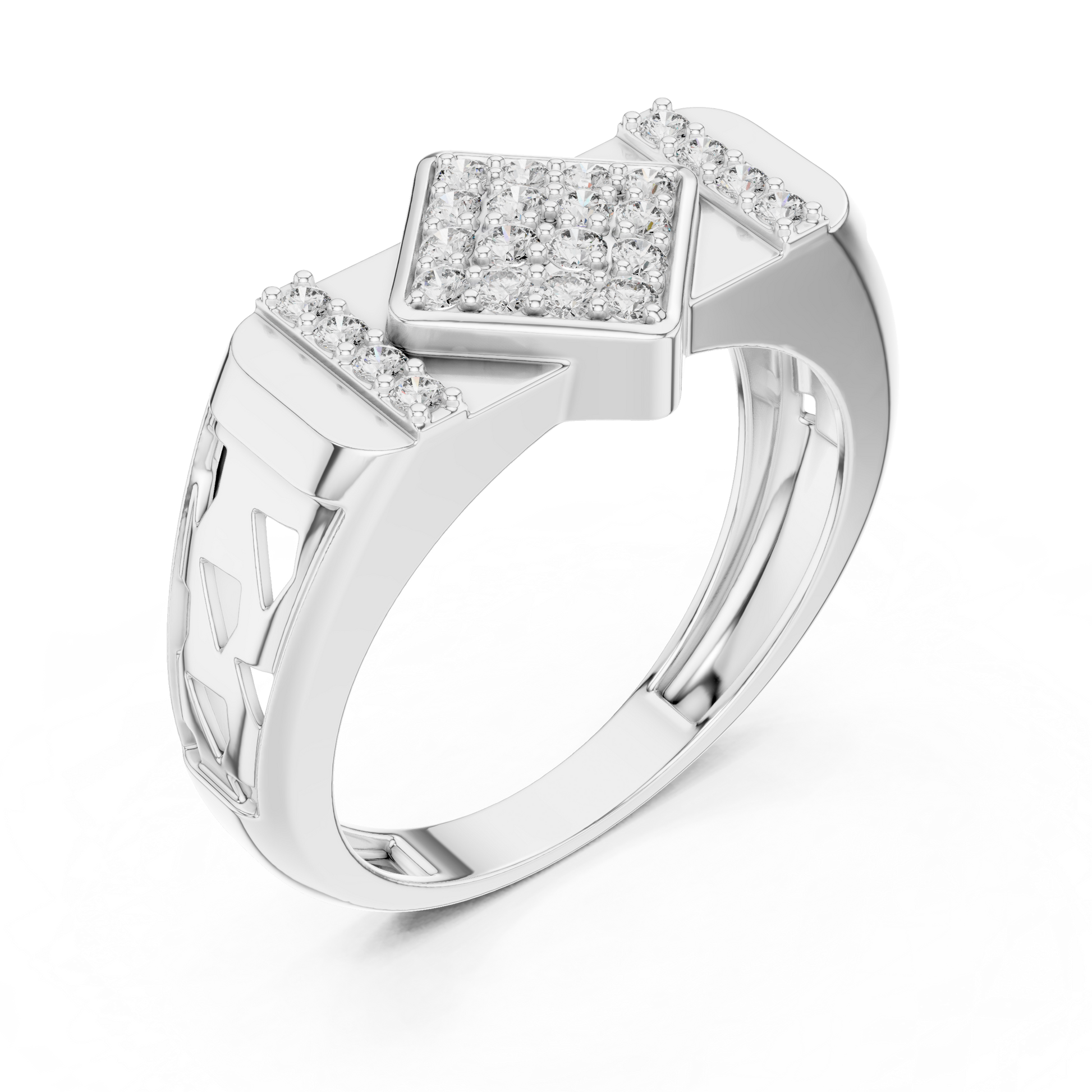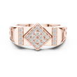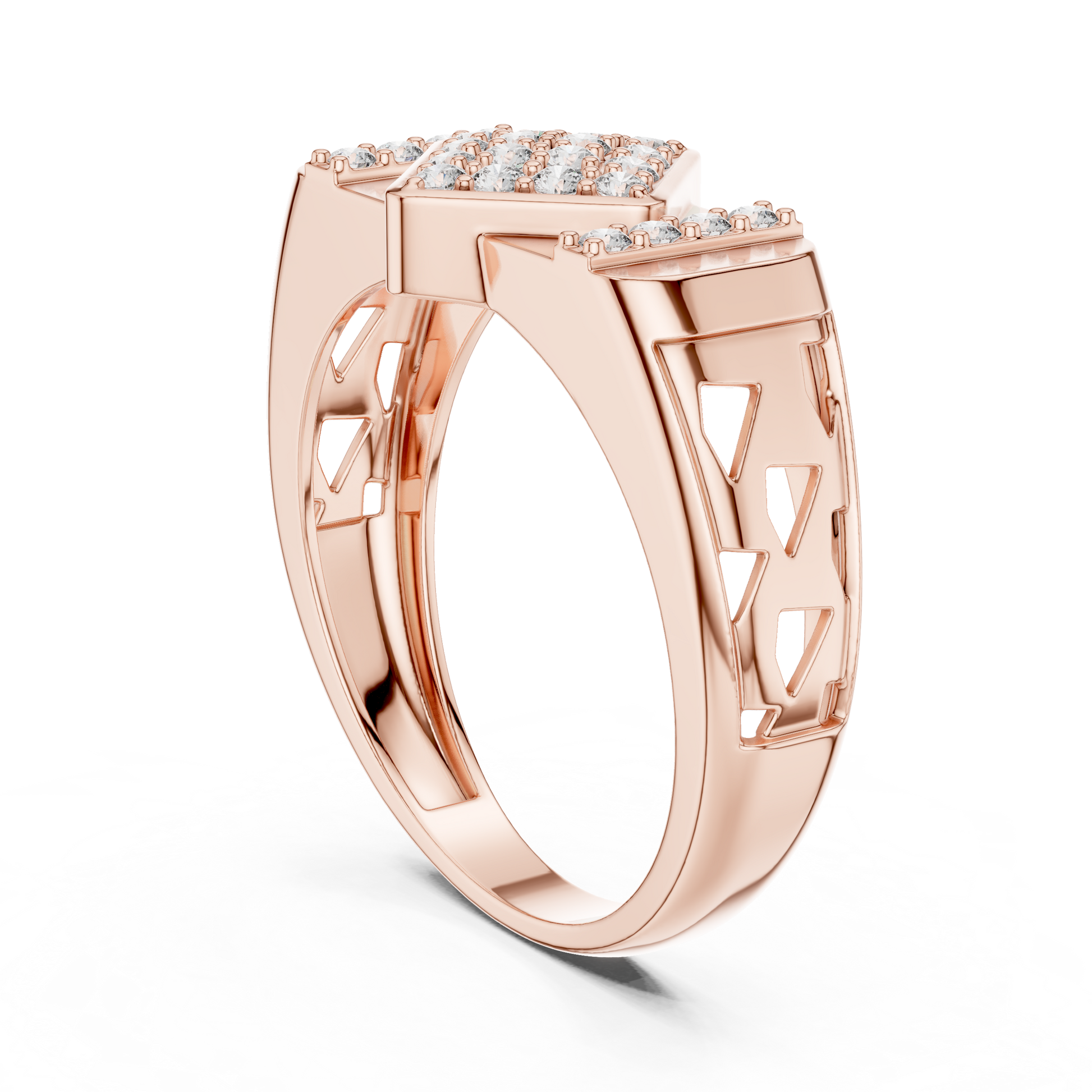 This bold geometric design from IVEVAR LUXURY features a striking square diamond cluster set in a square style orientation, creating a powerful and modern statement. The center is adorned with multiple round brilliant diamonds in a pavé setting, enhanced by diamond-accented side panels that add depth and symmetry. the wide band showcases elegant openwork cutout detailing along the sides, blending architectural beauty with refined luxury.