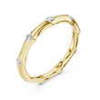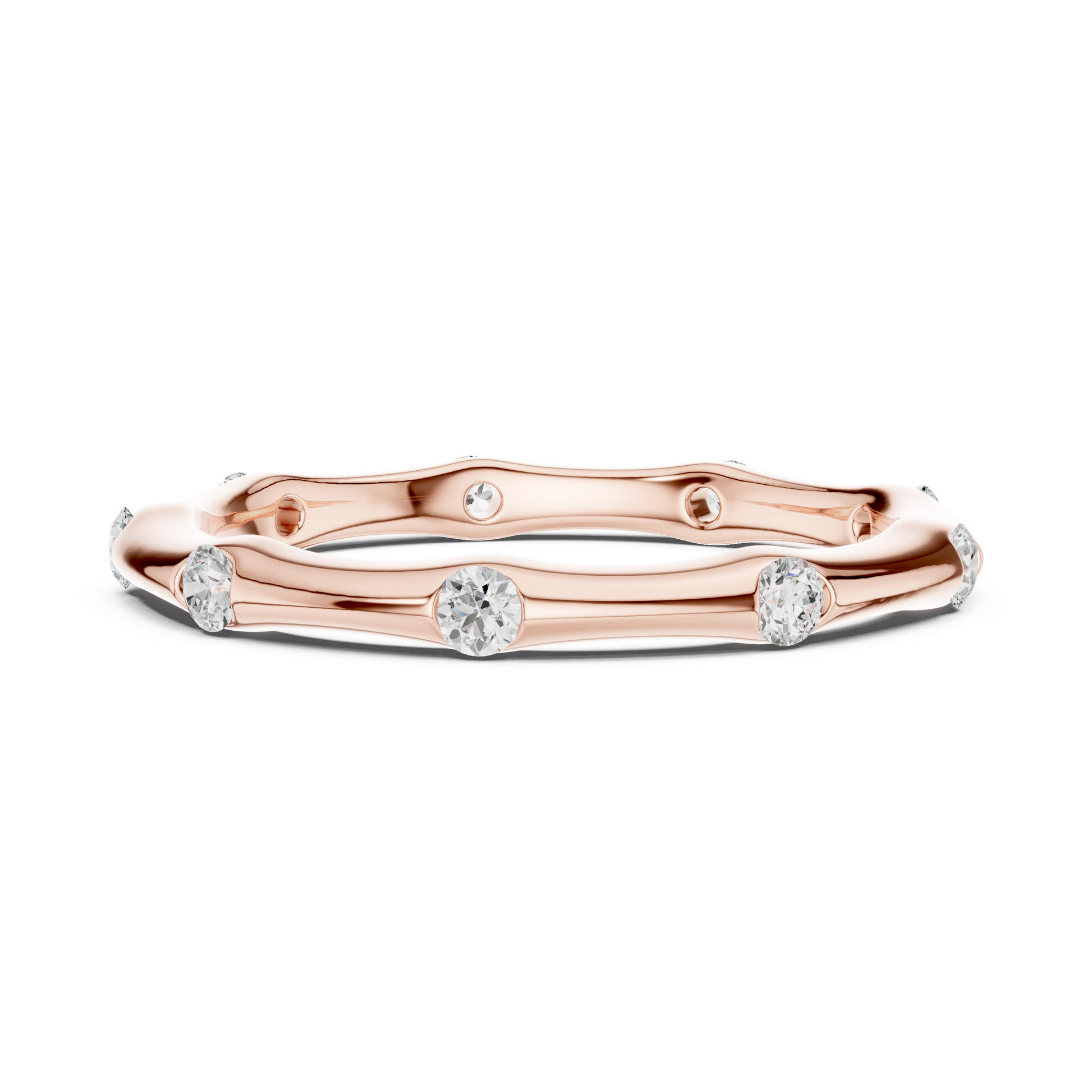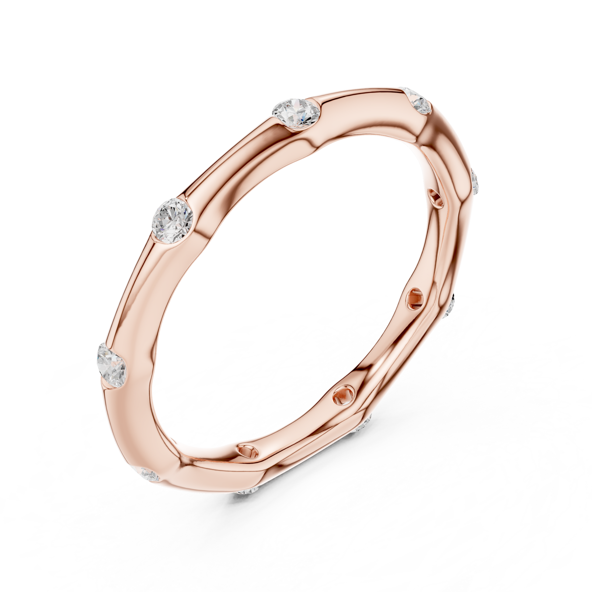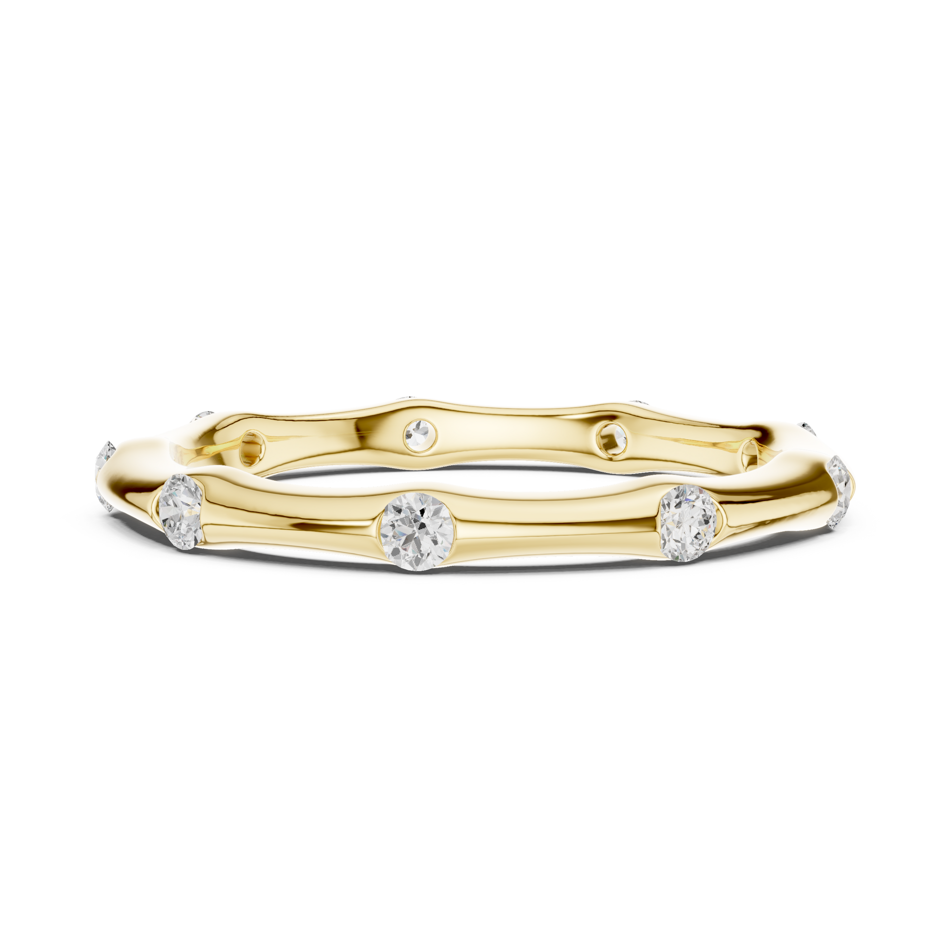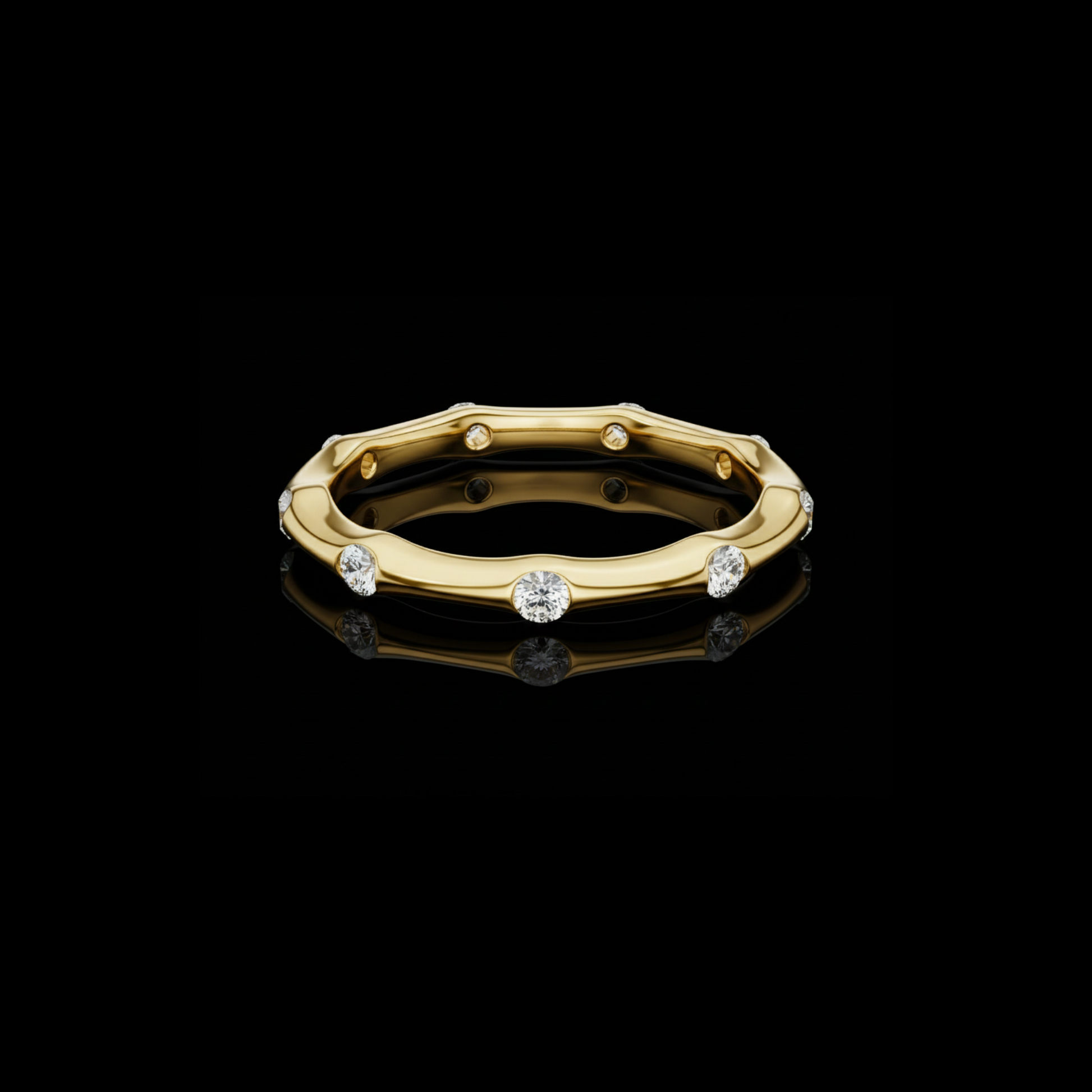 sleek and modern gold band features a unique, softly undulating design accented by evenly spaced round diamonds set flush into the metal. The subtle sparkle of the diamonds combined with the polished gold creates a refined and sophisticated look that works perfectly as a standalone statement or paired with other rings for a layered effect. Its minimalist yet elegant style makes it ideal for everyday wear or special occasions.