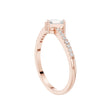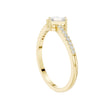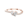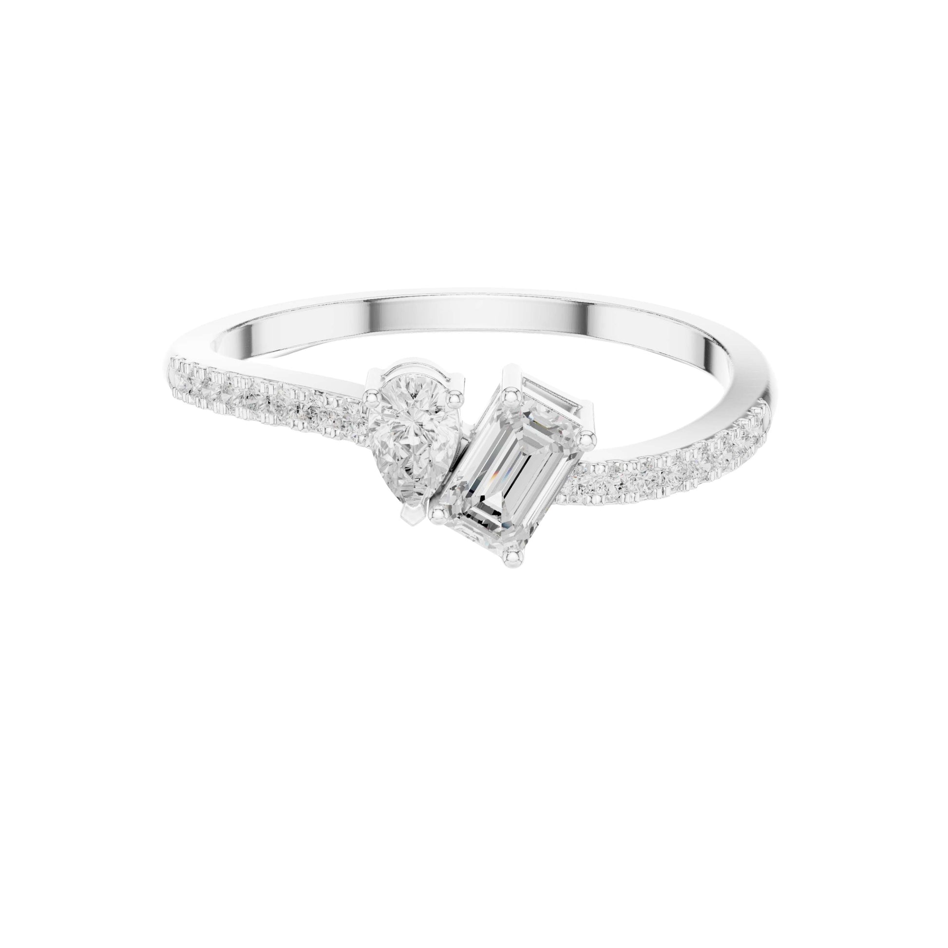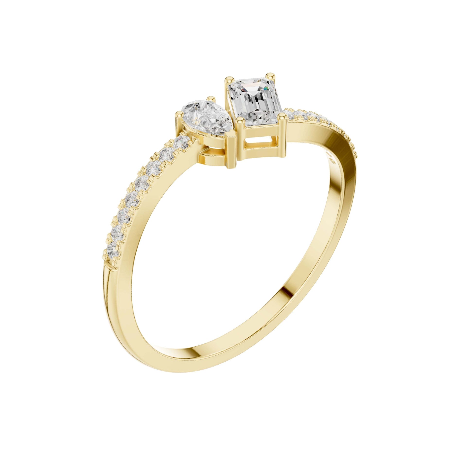 This refined Toi et Moi ring showcases a striking pairing of a pear-cut diamond and a sleek emerald-cut diamond, symbolizing two paths beautifully joined as one. Set in warm gold, the slim band is adorned with delicate pave diamonds that add continuous sparkle without overpowering the center stones. The balanced contrast between the soft curves of the pear shape and the clean lines of the emerald cut creates a modern yet timeless design, perfect as an engagement ring or a meaningful statement of connection and love.