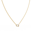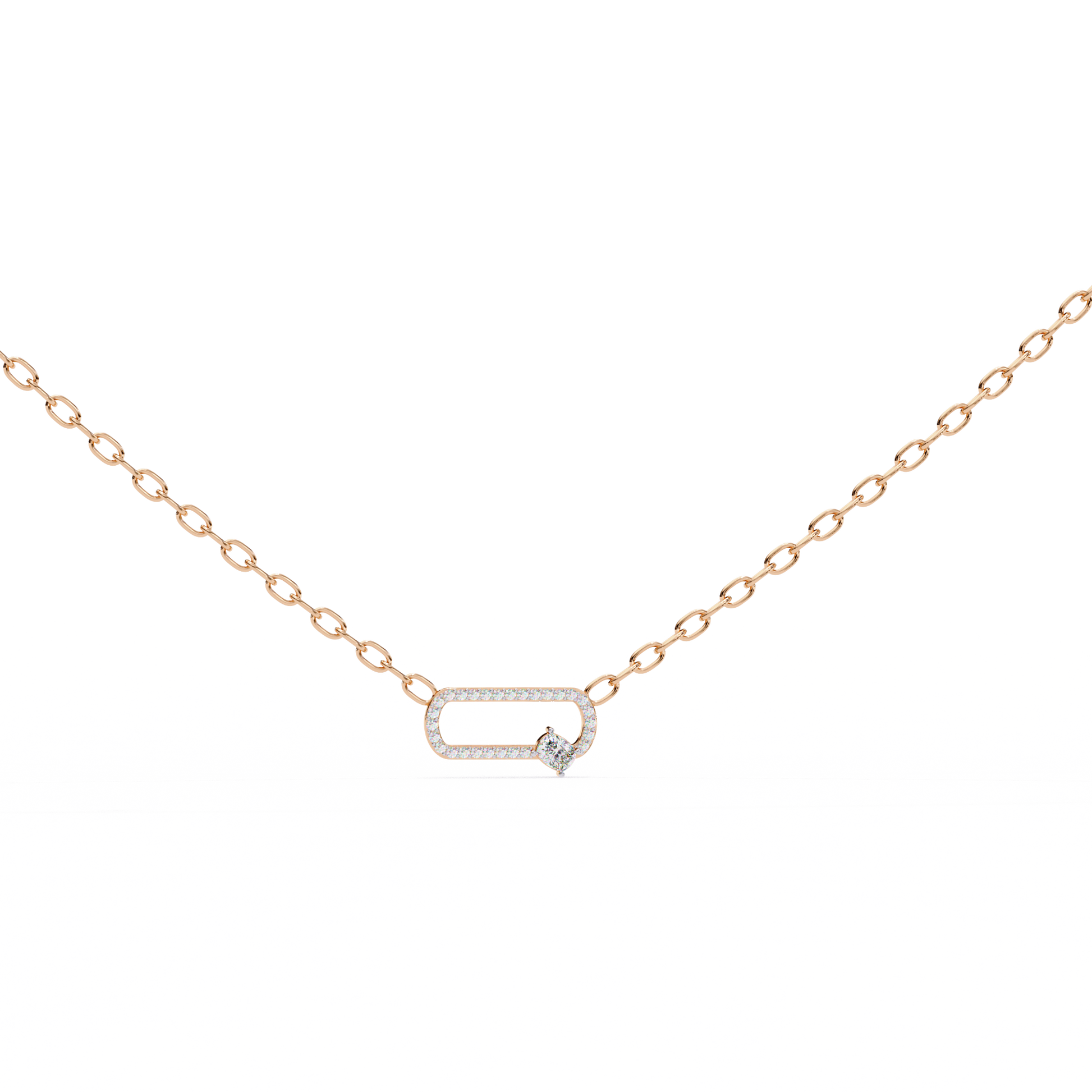 This pendant features a modern open-oval link design crafted in polished gold and fully accented with shimmering pave-set round stones, giving it a sleek, contemporary sparkle. A single cushion square solitaire diamond is set along the lower edge, adding an elegant focal point and a touch of asymmetry that enhances the piece’s unique character. The pendant is suspended from matching gold links, creating a harmonious blend of sophistication and modern style, perfect for both everyday wear and refined occasions.