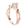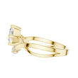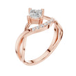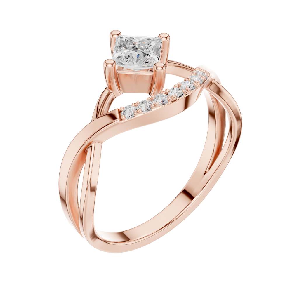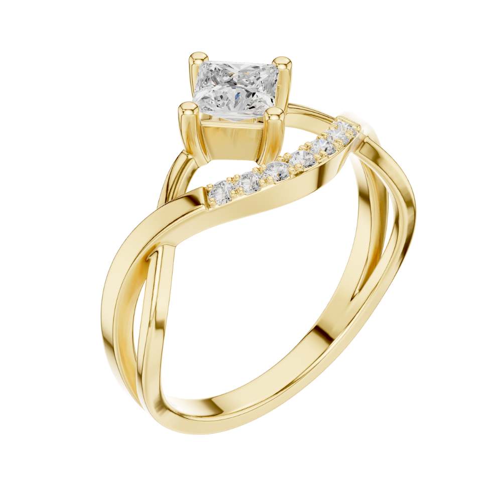 This elegant ring features a striking princess-cut diamond set in a unique floating-style frame, held securely by four rounded prongs that give the center stone a light, airy presence. Crafted from polished gold, the open, split-style band enhances the modern silhouette while a graceful curved row of pave-set diamonds adds brilliance and balance to the design. The combination of geometric precision and soft, sculpted lines creates a refined, contemporary piece perfect for anyone who loves distinctive yet timeless fine jewelry.