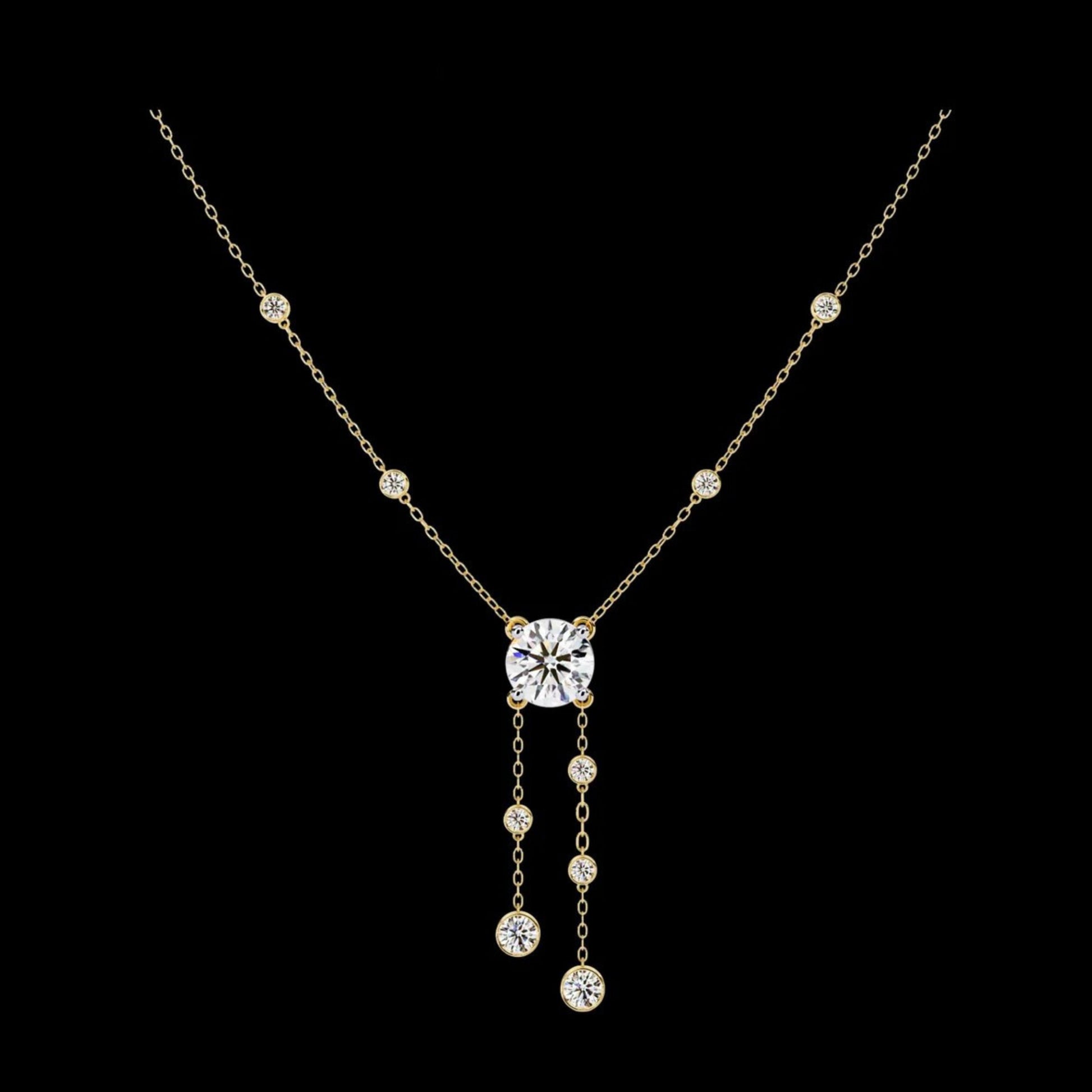 Step into pure elegance with Ivevar Luxury’s Round Cascade Diamond Necklace, where sophistication meets modern design. Featuring a central diamond that cascades into two shimmering drops, this necklace captures the perfect balance of grace and glamour. Each diamond is set on a delicate gold chain, reflecting light with every movement for a round, effortless glow. Handcrafted with precision and made from ethically sourced materials, this piece embodies luxury that feels both timeless and conscious.