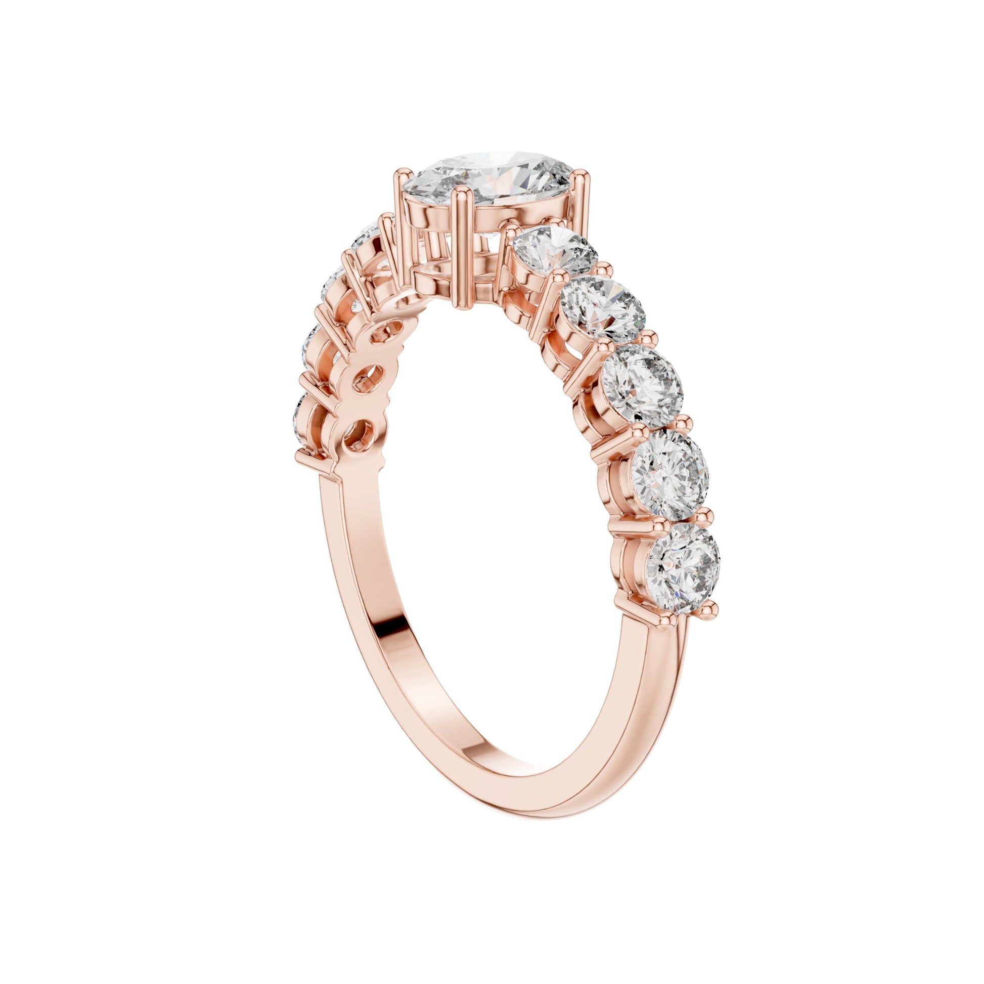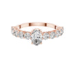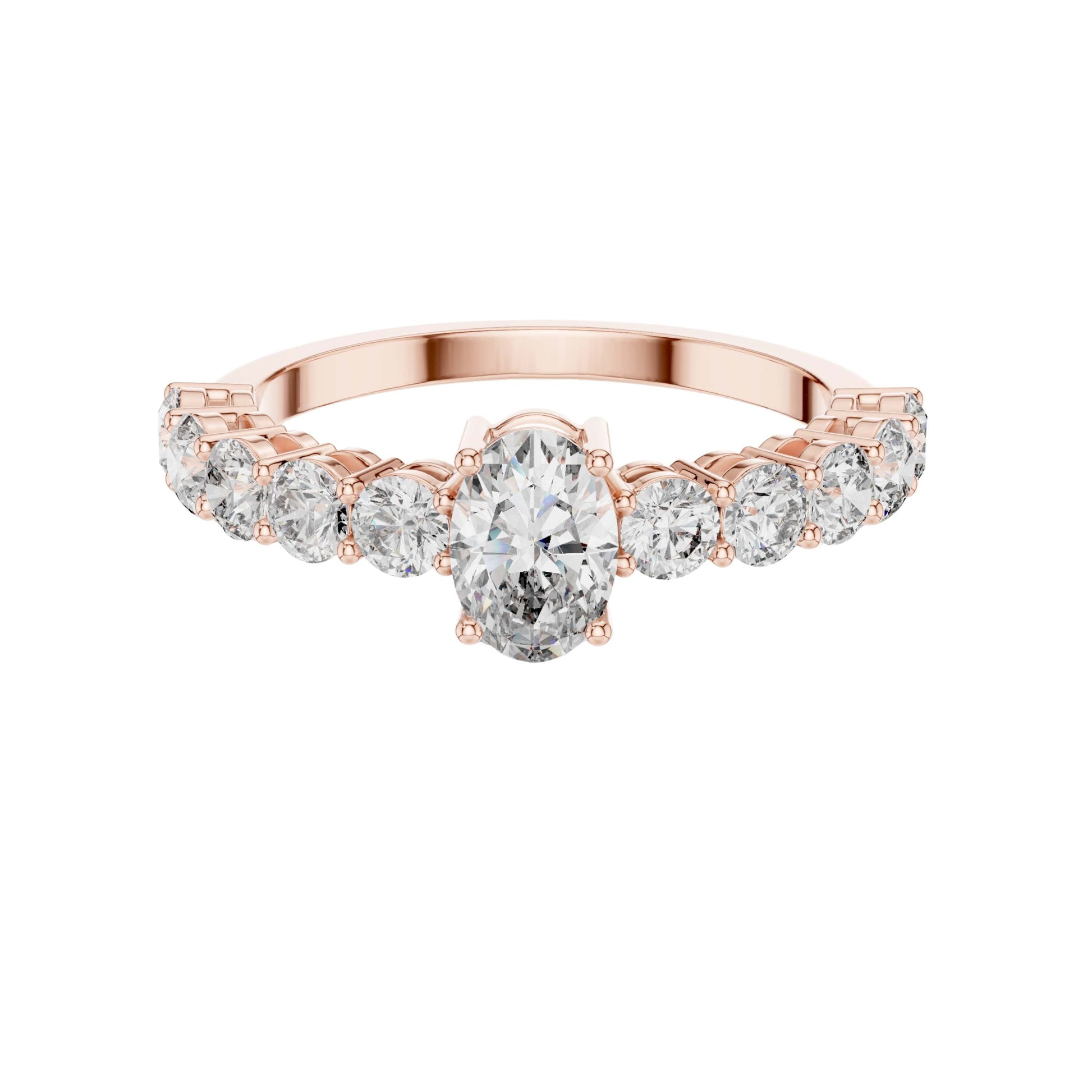 This stunning engagement ring features a captivating oval brilliant-cut center diamond, elegantly secured in a classic four-prong gold setting. A row of sparkling round brilliant diamonds adorns the band, adding depth and continuous shimmer that enhances the brilliance of the center stone. Crafted in polished gold with a refined silhouette, this timeless design blends classic romance with modern sophistication, making it a perfect symbol of enduring love and commitment by Ivevar Luxury.