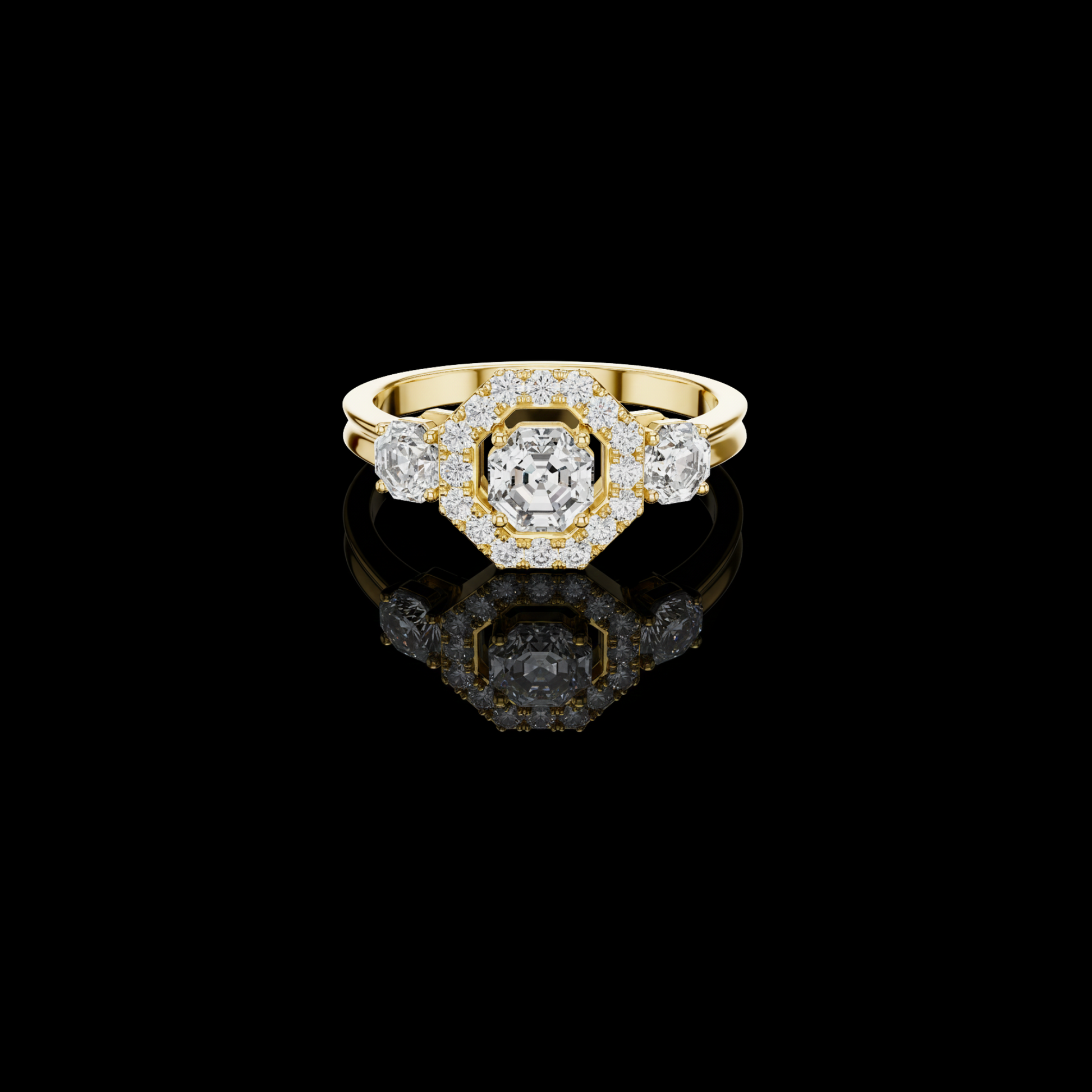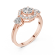 The Octavia Halo Diamond Ring is a striking blend of architectural elegance and timeless luxury. At its heart lies a radiant round-cut diamond, framed by an octagonal halo of shimmering pavé diamonds that adds depth, dimension, and exceptional brilliance.Flanked by beautifully matched side diamonds, the design creates a balanced silhouette that feels both bold and refined. The high band enhances warmth and sophistication while ensuring lasting comfort and durability.