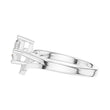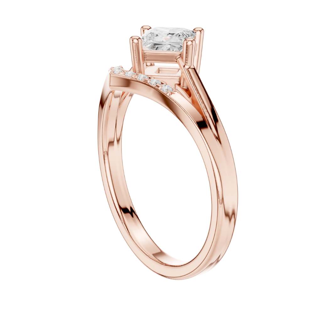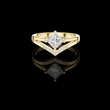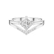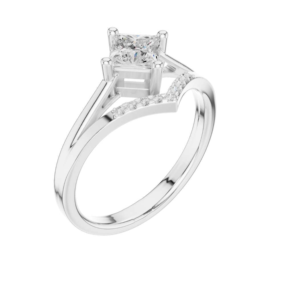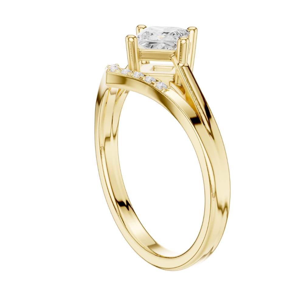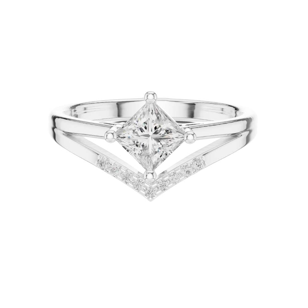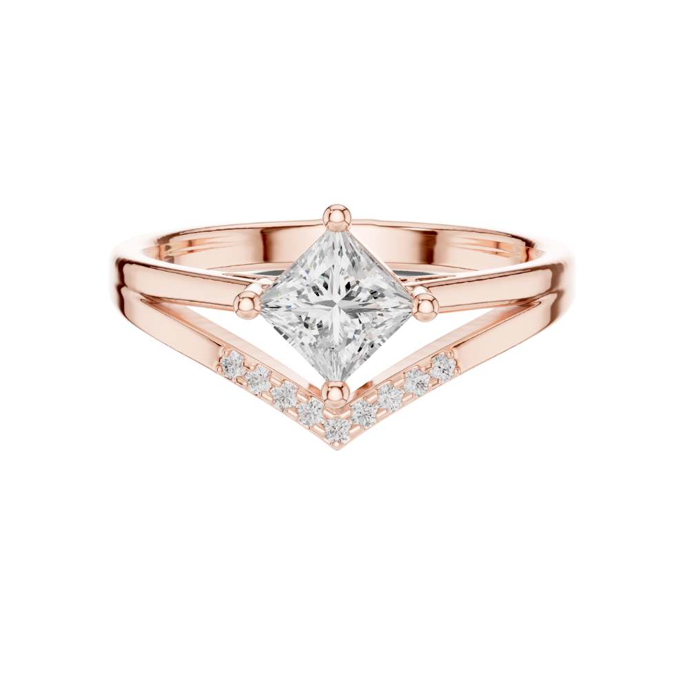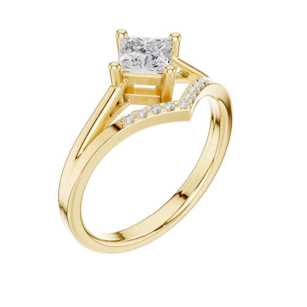 This elegant ring features a striking princess-cut center diamond set on its point for a modern geometric look, framed by a split gold band that creates a chic, open design. The lower band forms a graceful chevron shape accented with a row of small round diamonds, adding sparkle and sophistication. Bold yet refined, this piece blends contemporary style with timeless luxury, making it a captivating statement ring for any occasion by Ivevar.