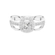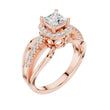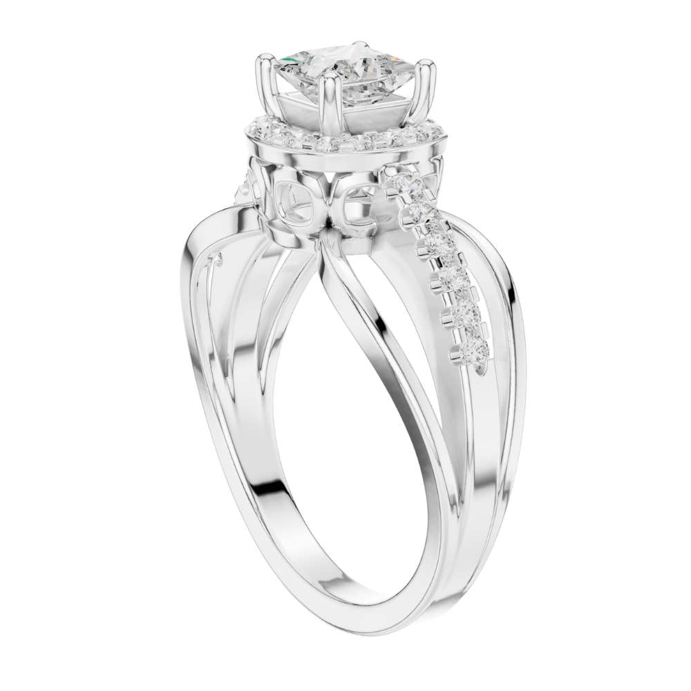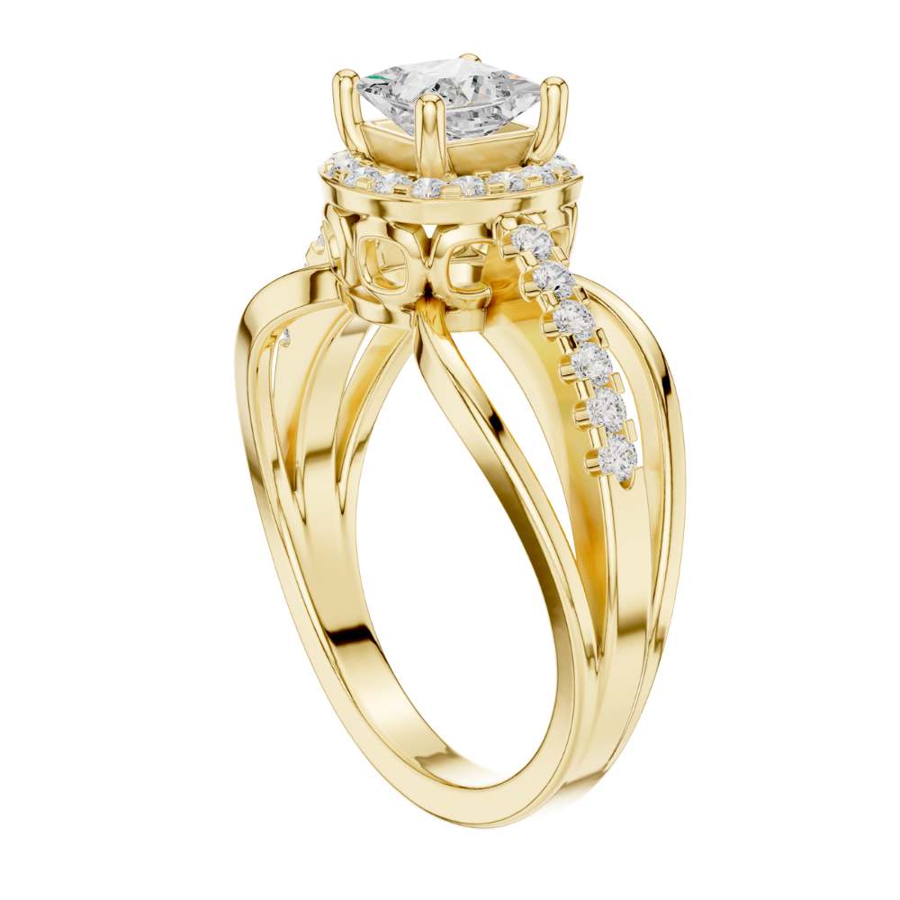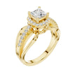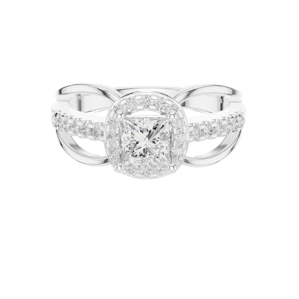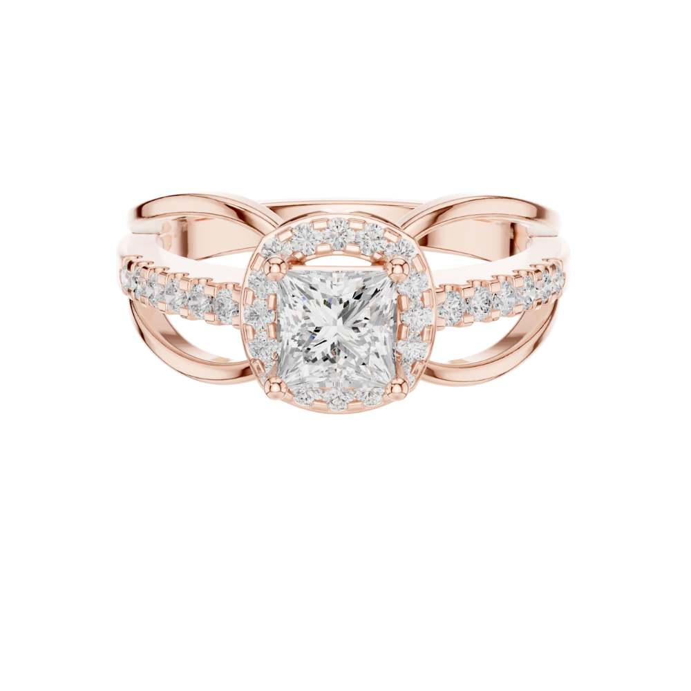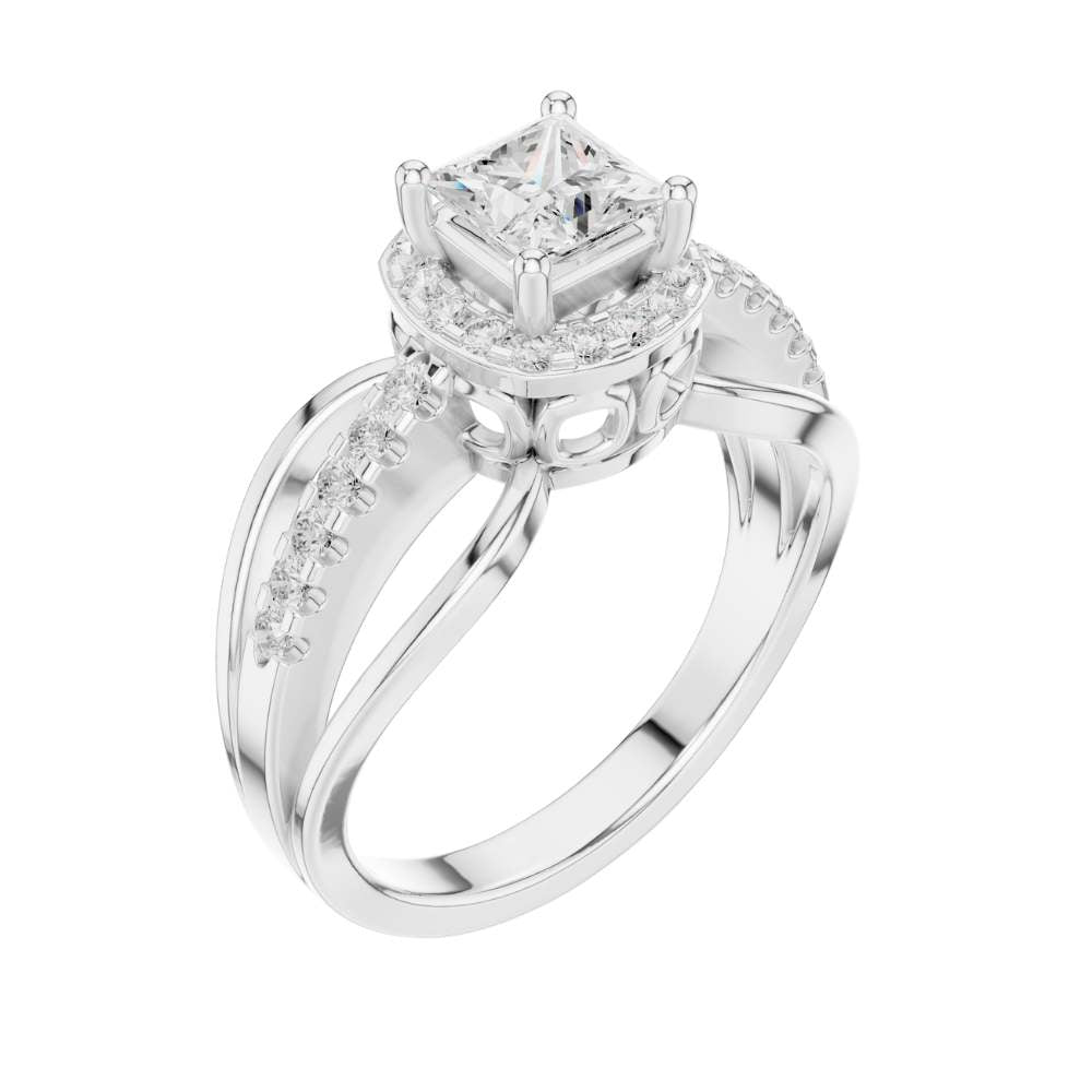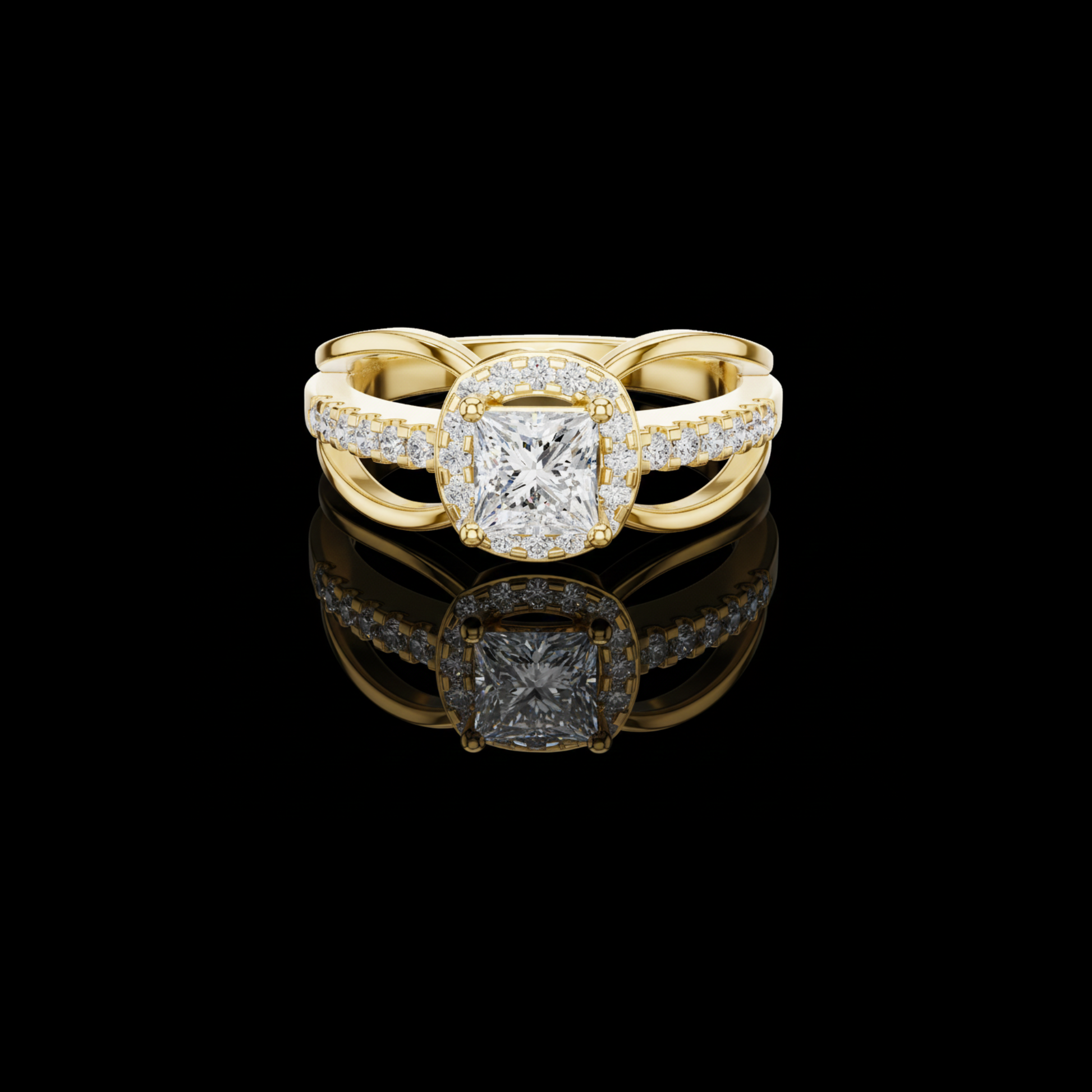 This elegant ring showcases a stunning princess-cut center diamond embraced by a brilliant halo of smaller diamonds, creating a radiant focal point that draws the eye. Set in polished gold, the split-shank band is adorned with shimmering accent diamonds, adding exceptional sparkle and dimension from every angle. The combination of the geometric center stone, halo detailing, and graceful band design gives this piece a luxurious and timeless appeal, perfect for engagements, anniversaries, or a meaningful gift of love.