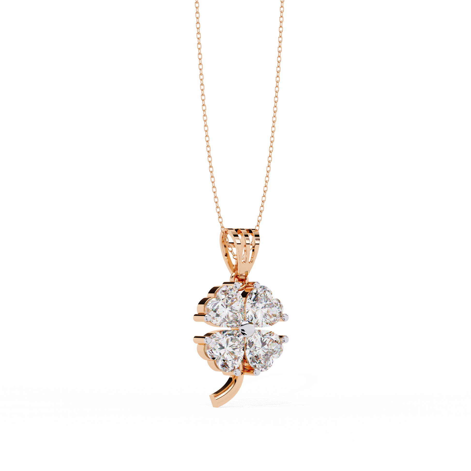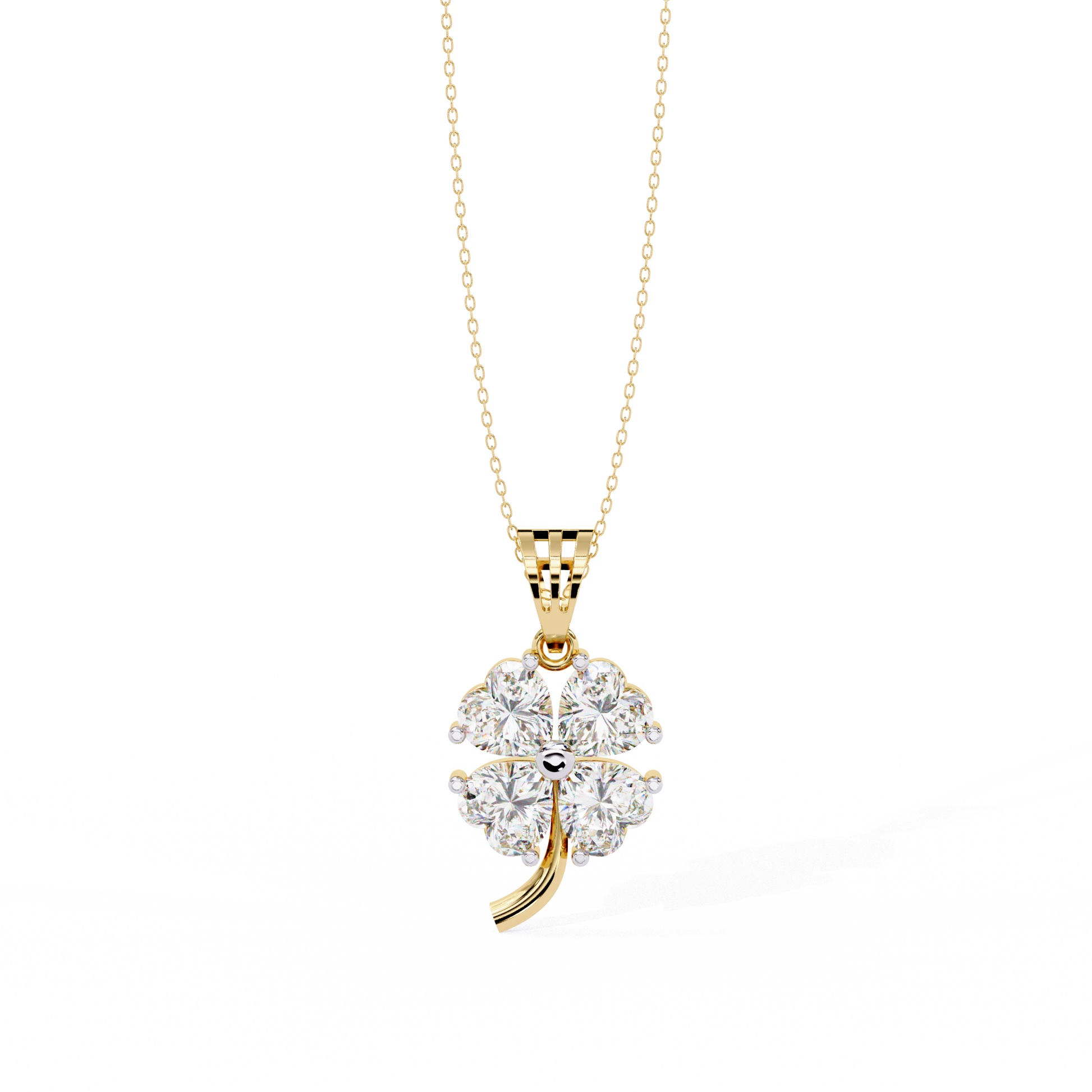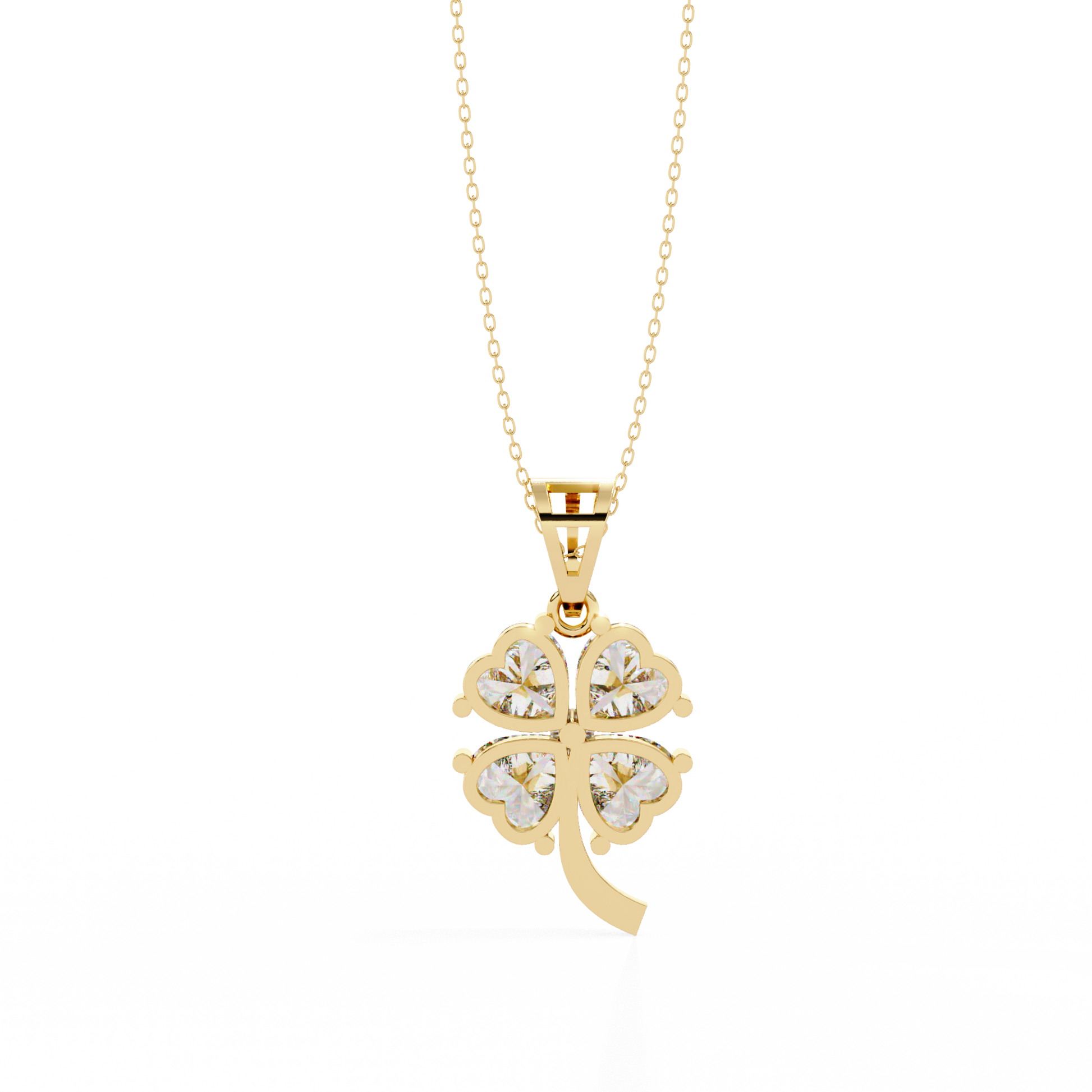 This stunning pendant features a Graceful Four Leaf Floral Design crafted in radiant gold and adorned with brilliant Heart Cut Gemstones that shimmer with exceptional clarity. Each petal sparkles elegantly, coming together to form a harmonious and luxurious composition that symbolizes luck and beauty by Ivevar. The gold stem detail adds a refined touch of sophistication, making this pendant a timeless piece perfect for elevating any look with its delicate charm and opulent brilliance.