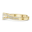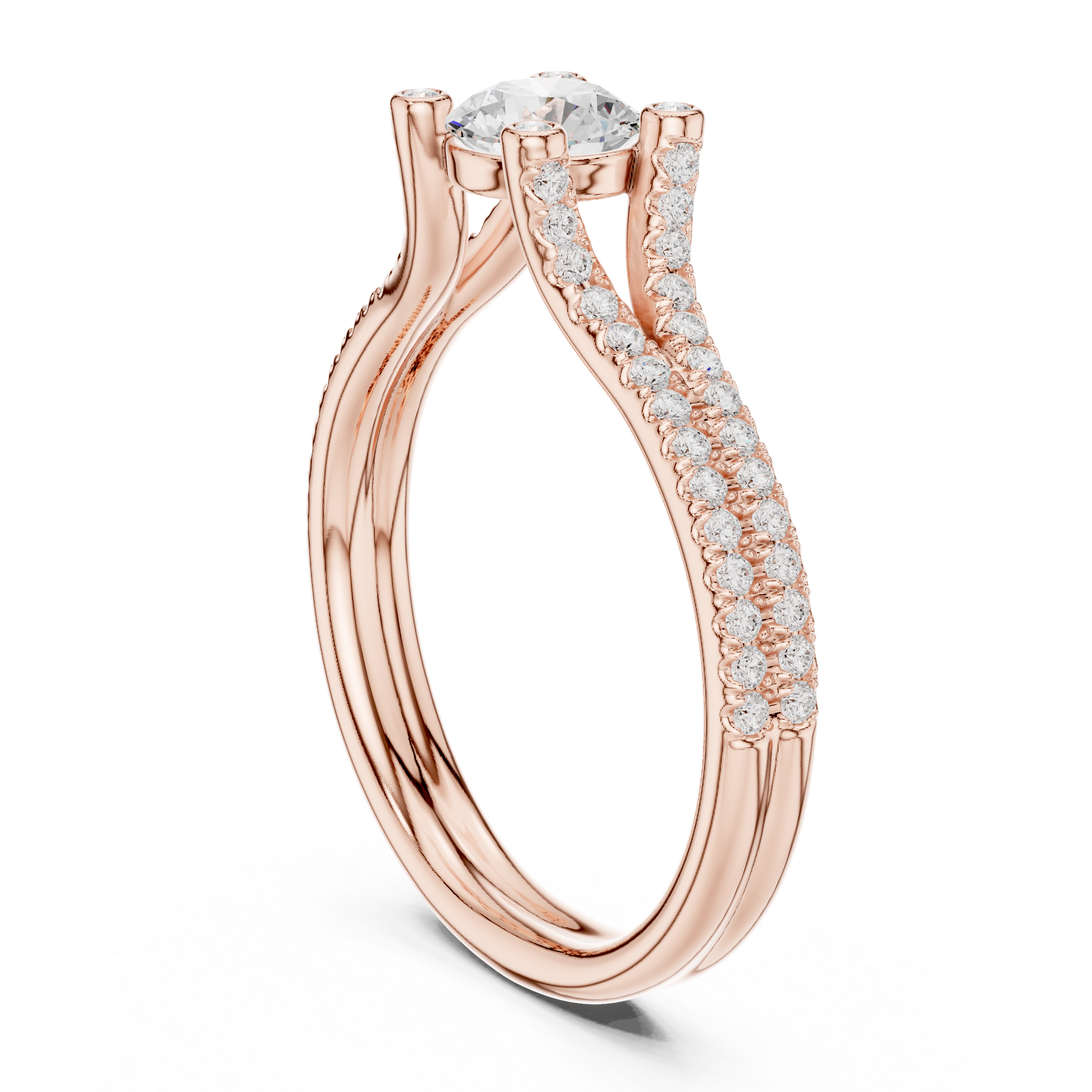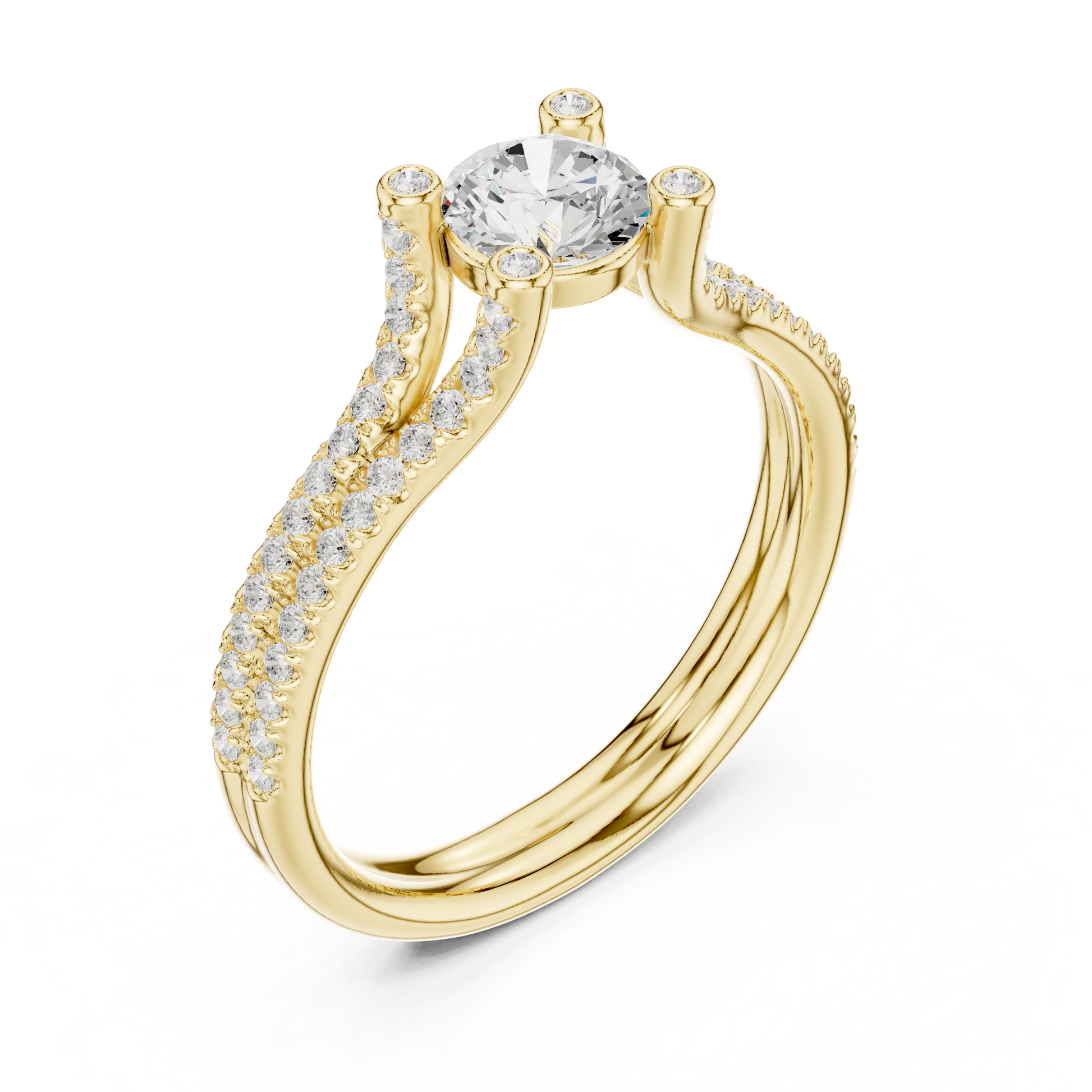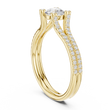 Radiating regal elegance, this round-cut diamond ring is designed to make a powerful yet graceful statement. The brilliant center diamond is elevated by a distinctive triple pavé-set band, creating layers of shimmering light that enhance its fire and brilliance. Sculpted prongs accented with bezel-set diamonds add depth, symmetry, and a touch of contemporary refinement.Crafted in luxurious gold, this ring blends architectural beauty with timeless sophistication.