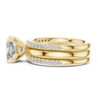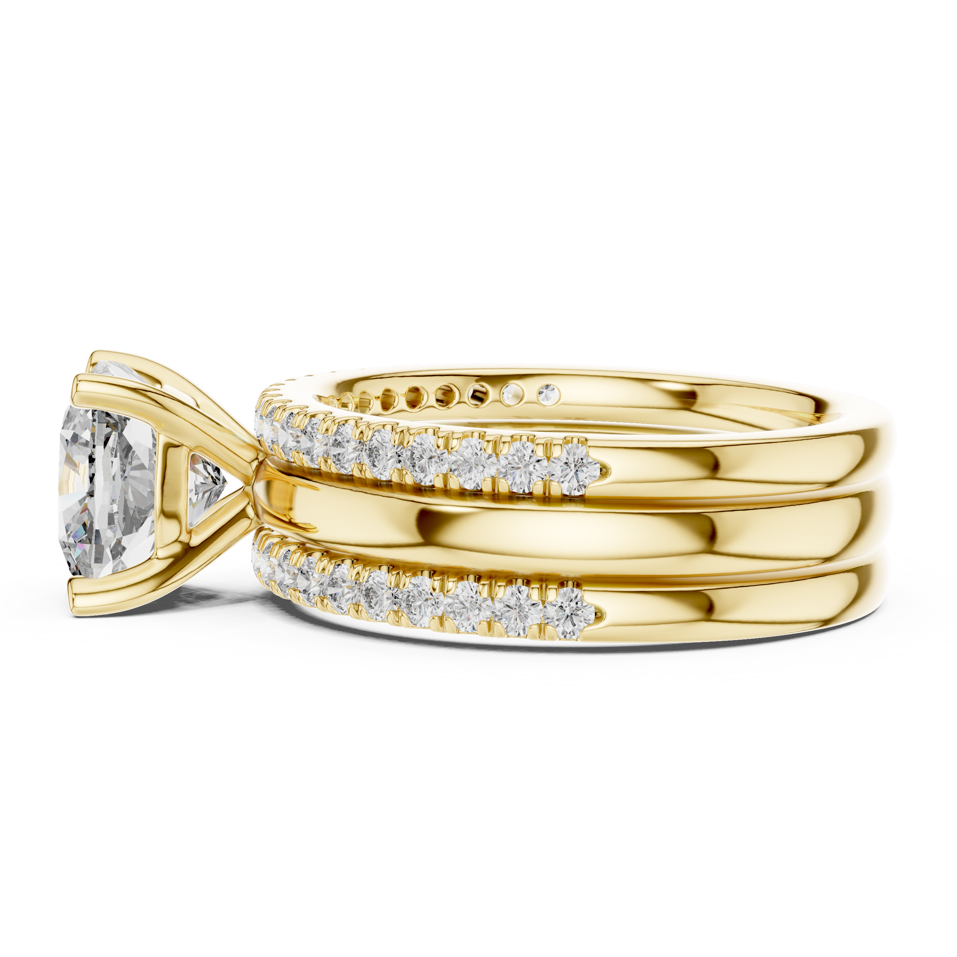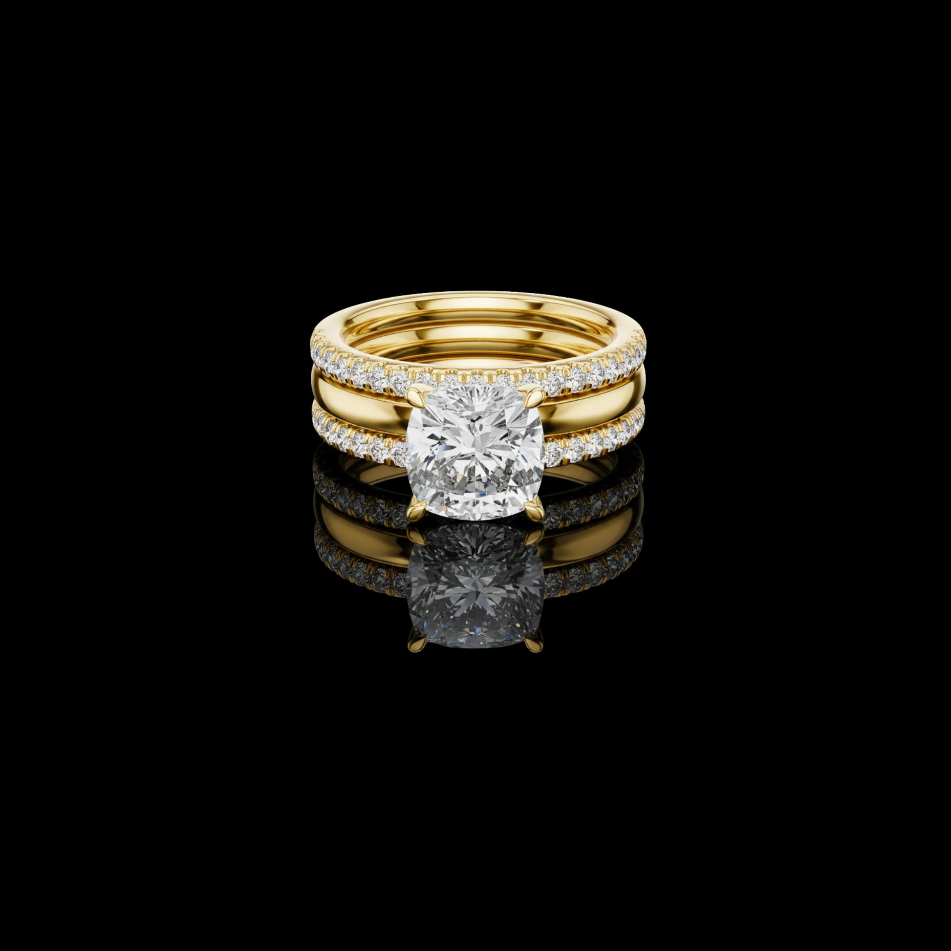 An exquisite symbol of balance and devotion, this cushion-cut diamond ring showcases a luminous center stone embraced by dual pavé-set gold bands that create a striking sense of symmetry and brilliance. The layered design enhances the diamond’s natural fire while adding depth and contemporary elegance.Crafted in rich, the smooth inner band contrasts beautifully with the sparkling pavé accents, offering both comfort and visual impact.
