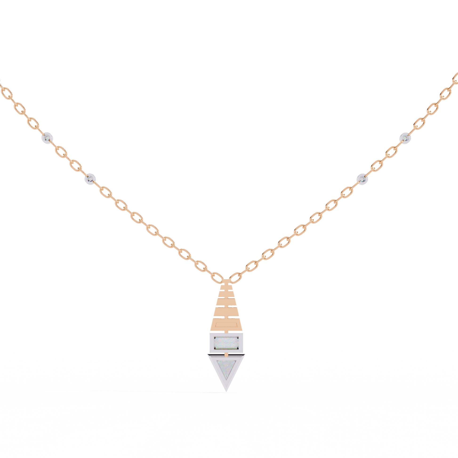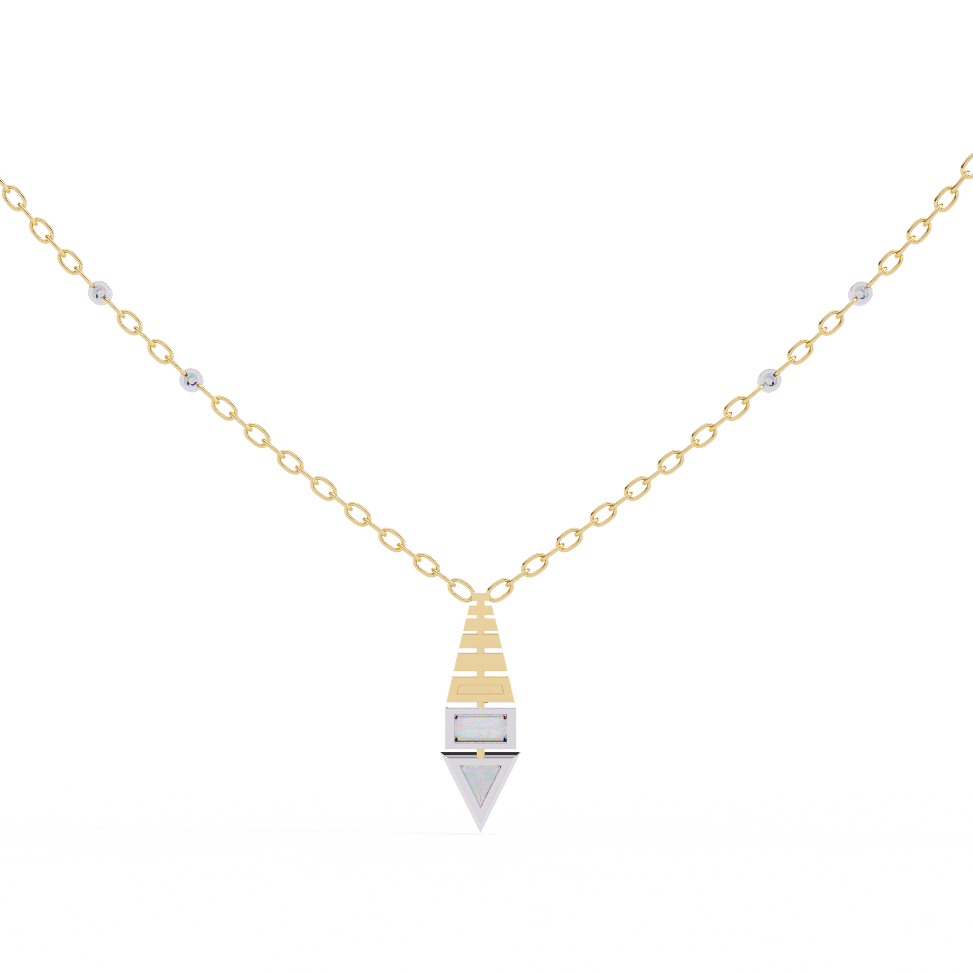 This elegant pendant features a striking geometric composition of triangle, baguette, and round diamonds, creating a modern yet timeless look. The diamonds are set within a sleek two-tone drop that combines polished gold with bright white metal accents, enhancing the crisp lines and unique shapes of each stone. Suspended from a delicate gold chain adorned with additional small round diamonds, the design offers a refined balance of sparkle and structure, making it a sophisticated statement piece for any jewelry collection.