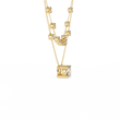 This elegant layered necklace features two delicate gold chains adorned with sparkling round-cut stones, creating a sophisticated, cascading look. The upper strand showcases evenly spaced bezel-set gems for a subtle shimmer, while the lower strand highlights a brilliant round central solitaire that adds a striking focal point. The combination of refined craftsmanship and radiant sparkle makes this piece perfect for both everyday elegance and special occasions by Ivevar.