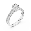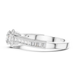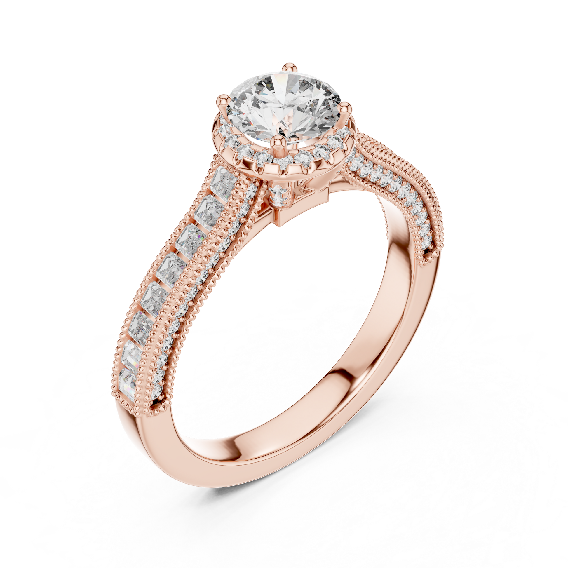 This refined ring features a brilliant round-cut center diamond that captures light beautifully, enhanced by graduated baguette diamonds along the band for a sophisticated architectural look. The delicately textured setting adds depth and character while maintaining a graceful profile. Designed for those who appreciate classic beauty with modern refinement, this ring is perfect for engagements, anniversaries, or special milestones, offering a lasting symbol of love, elegance, and craftsmanship.