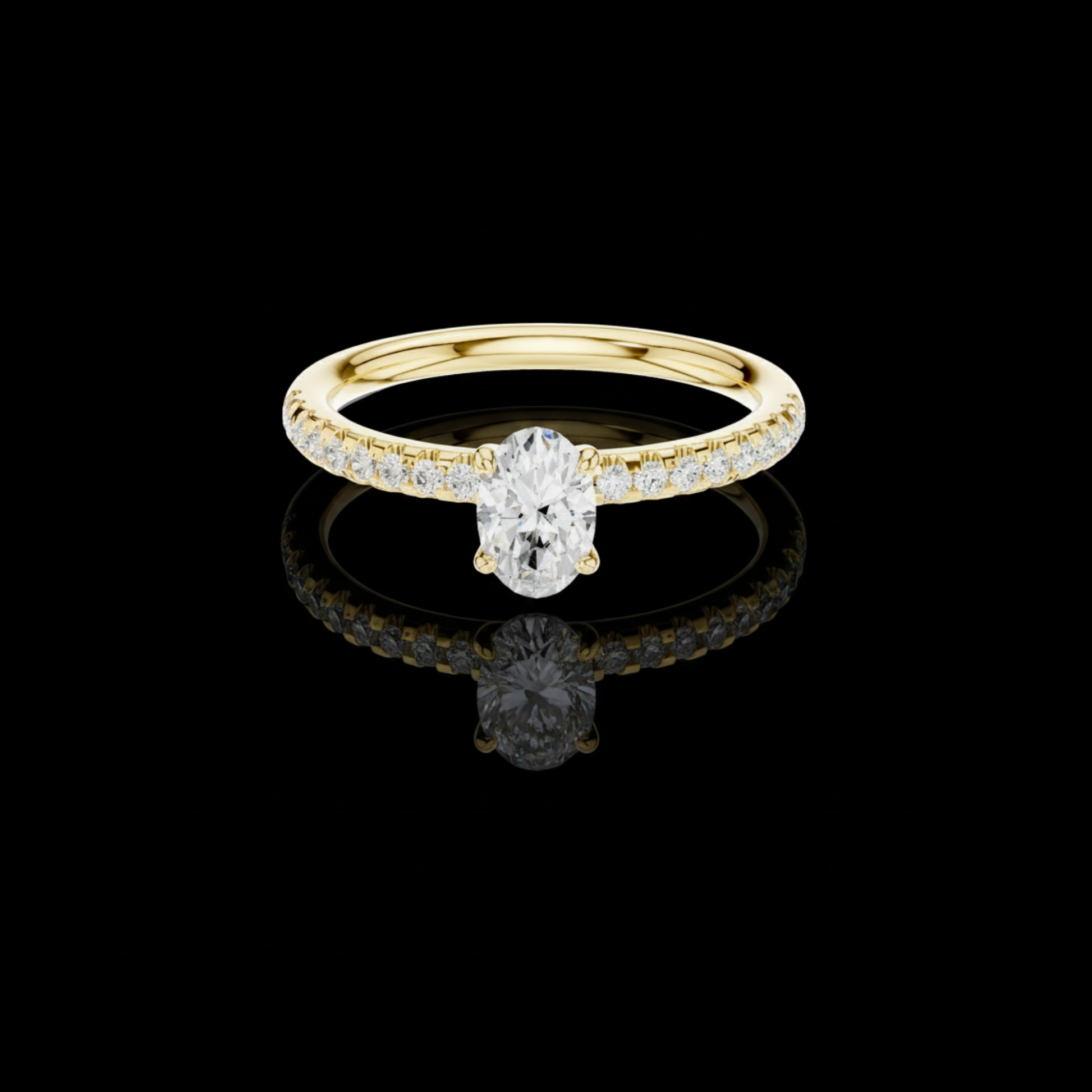 Introducing a stunning masterpiece from Ivevar Luxury, this design celebrates elegance through a beautifully crafted oval-cut center diamond that radiates brilliance from every angle. The shimmering pave-set diamonds on the band add a luxurious touch, enhancing the ring’s sparkle without overpowering its refined simplicity. Its high-polish gold band provides a warm, timeless foundation that elevates the overall grace of the piece.
