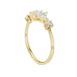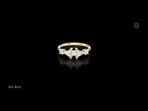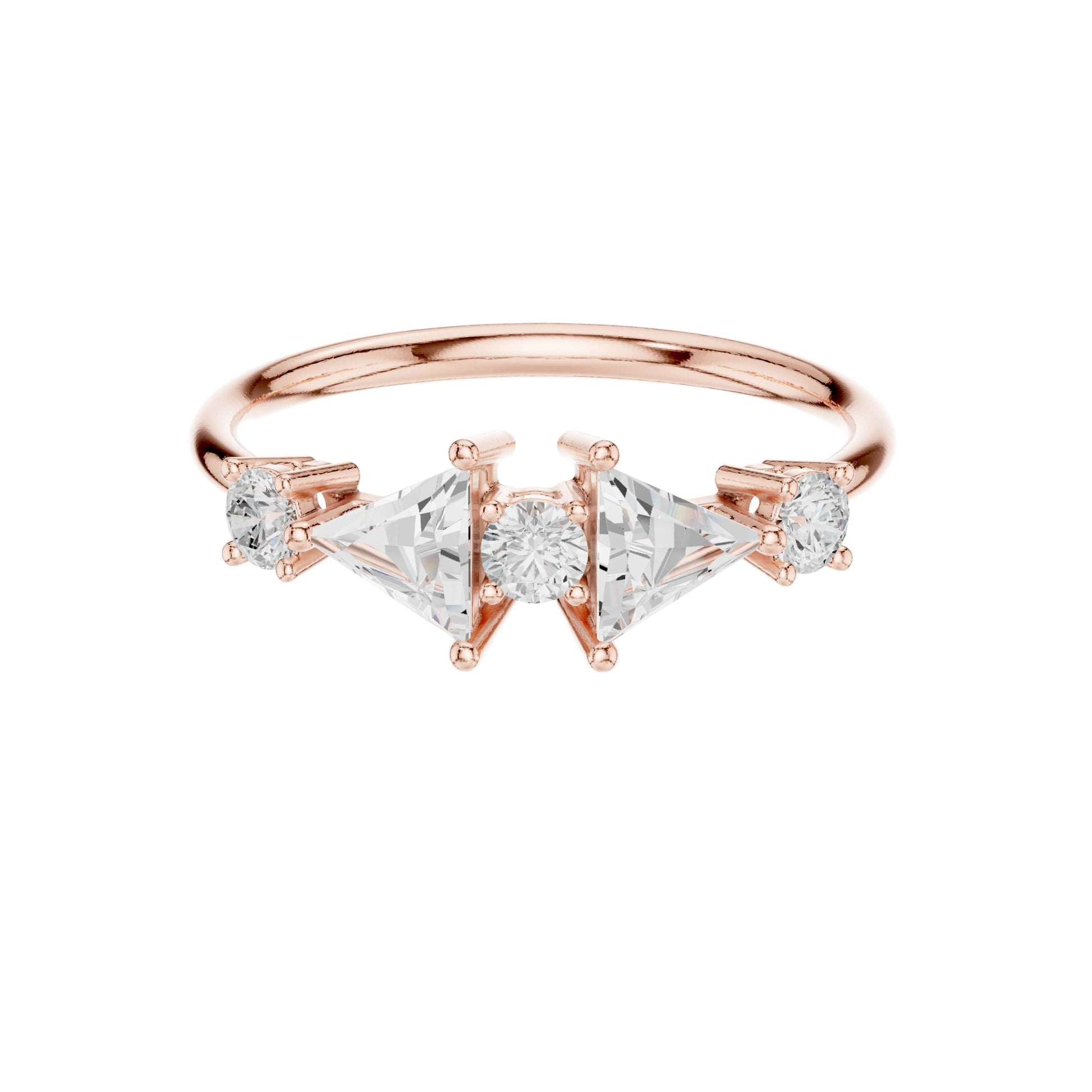 This stunning gold ring features a dazzling central round brilliant diamond flanked by two striking triangle cut diamonds on each side, creating a harmonious geometric balance. The delicate band enhances the eye-catching trio of stones, highlighting the unique blend of classic round brilliance and modern triangular facets. Ideal for those seeking a sophisticated and contemporary statement piece, this ring effortlessly combines elegance with bold design.