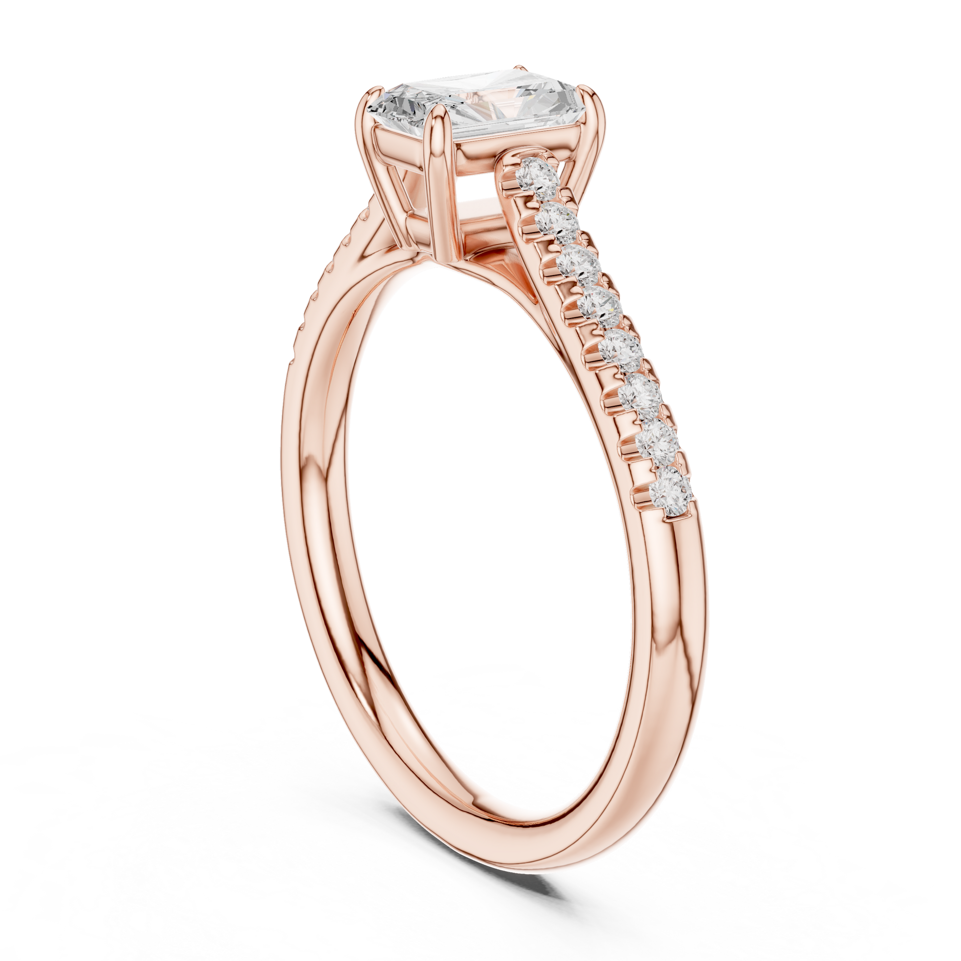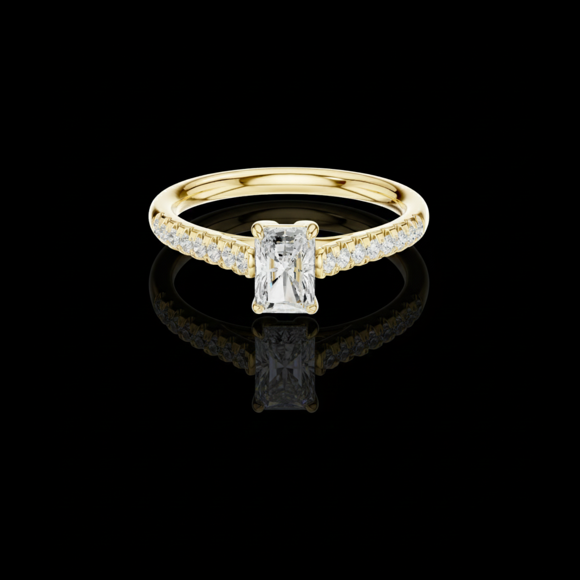 Introducing a refined masterpiece from Ivevar Luxury, this ring showcases the perfect blend of modern sophistication and classic radiance. At its center rests a stunning radiant-cut diamond, secured in a sleek four-prong setting that highlights its clean lines and unmatched clarity. The band is adorned with a brilliant pave row of round diamonds, offering continuous sparkle that enhances the center stone’s elegance.