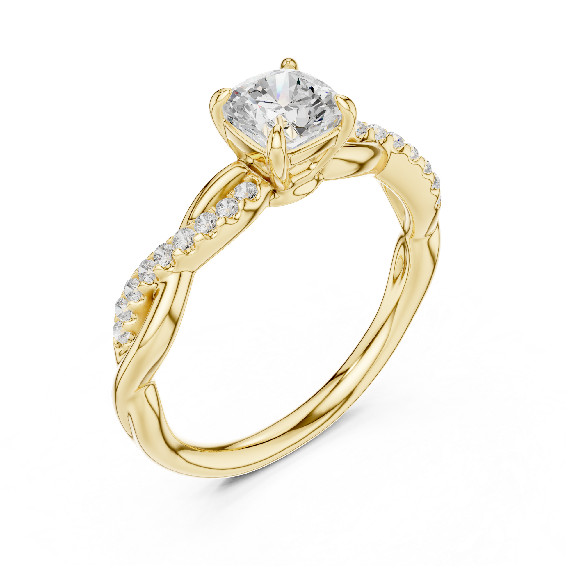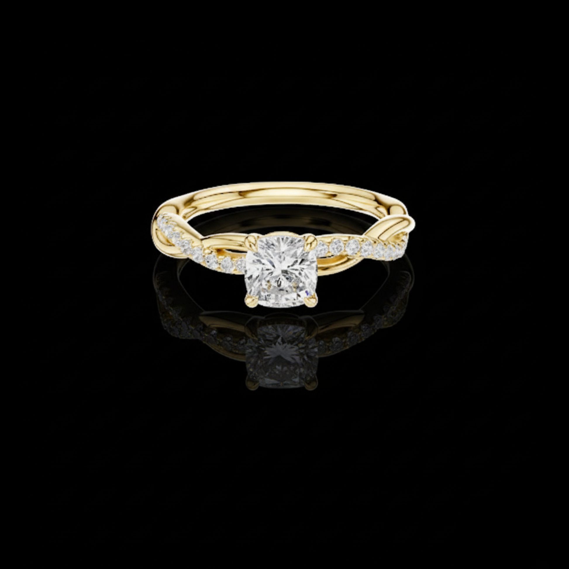 Introducing a breathtaking creation from Ivevar Luxury, this ring blends modern brilliance with timeless craftsmanship. The design features a radiant cushion-cut center diamond, secured in a refined four-prong setting that highlights its intense sparkle. A beautifully sculpted twisted gold band with pave diamonds creates a symbolic look of unity and elegance. Crafted for those who appreciate fine artistry, this piece is perfect for engagements, anniversaries, or meaningful celebrations.