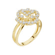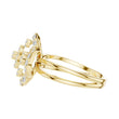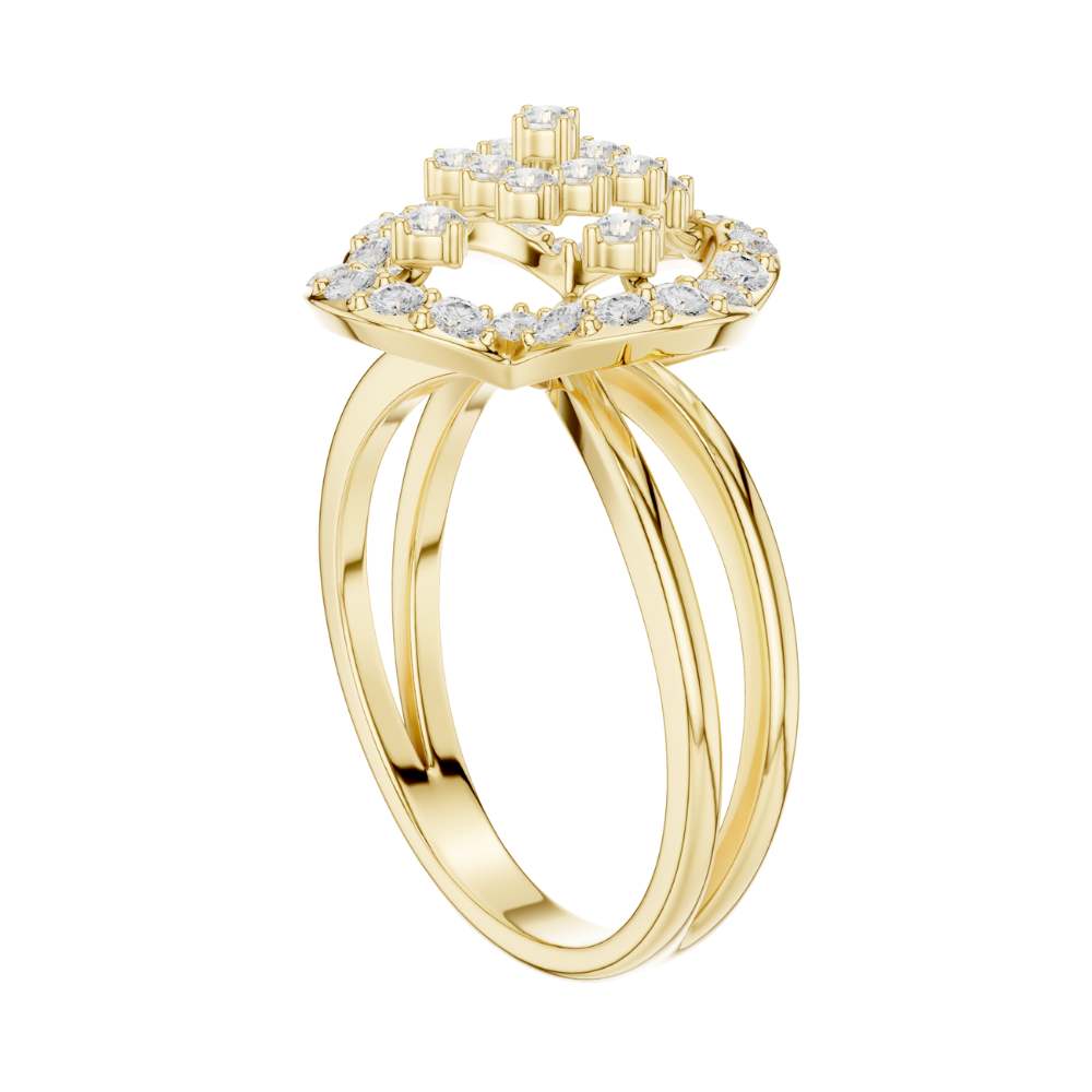 This stunning ring showcases a captivating four-petal floral motif crafted from brilliant round-cut diamonds, forming an elegant halo that radiates timeless sophistication. Set in polished gold, the design features a delicate split-shank band that enhances the ring’s airy, graceful silhouette while adding a touch of modern refinement. The intricate diamond arrangement creates a mesmerizing sparkle from every angle, making this piece a luxurious statement for special occasions or an exquisite addition to any fine jewelry collection.