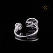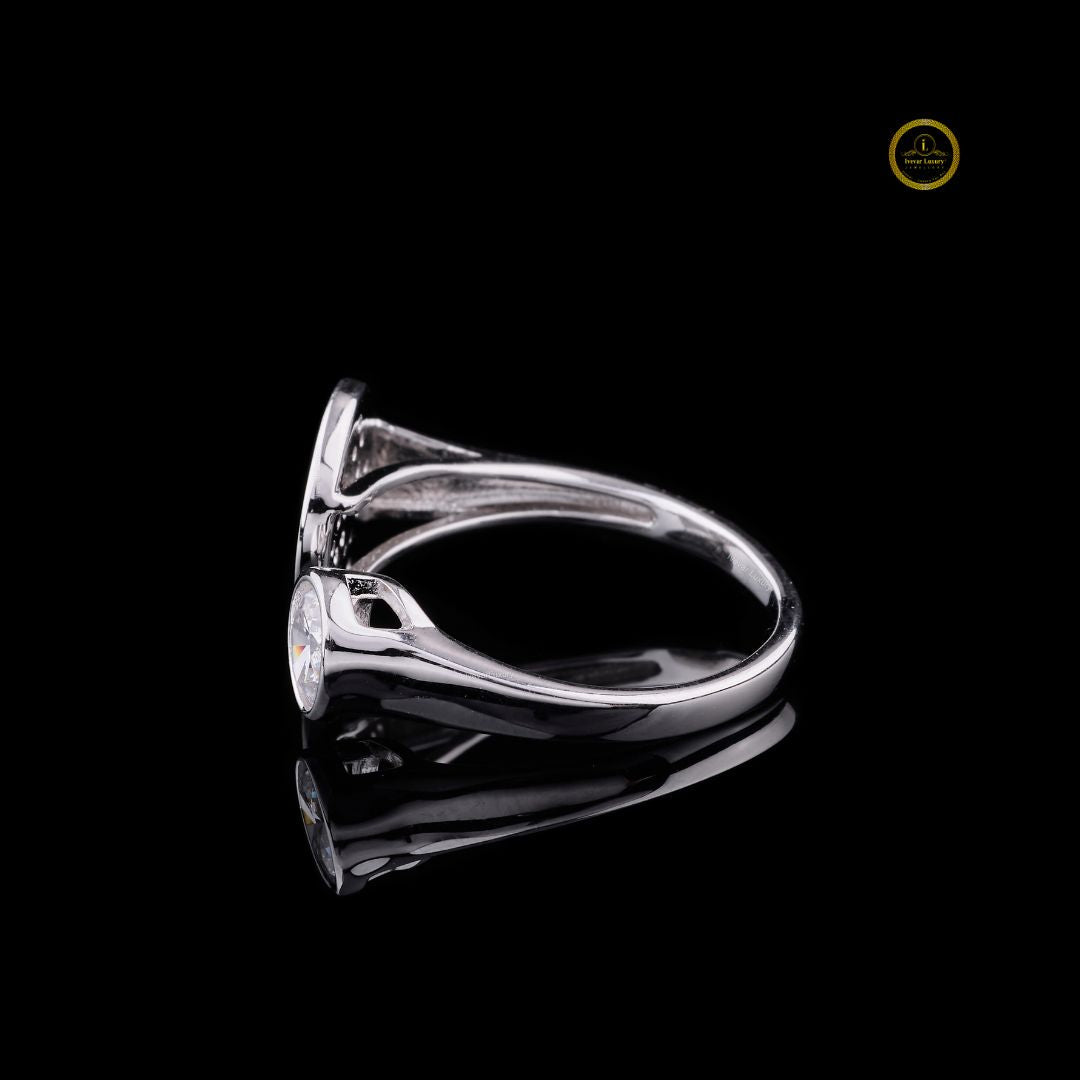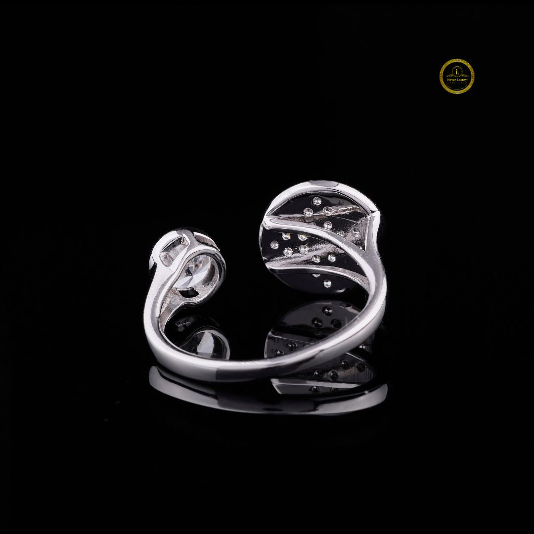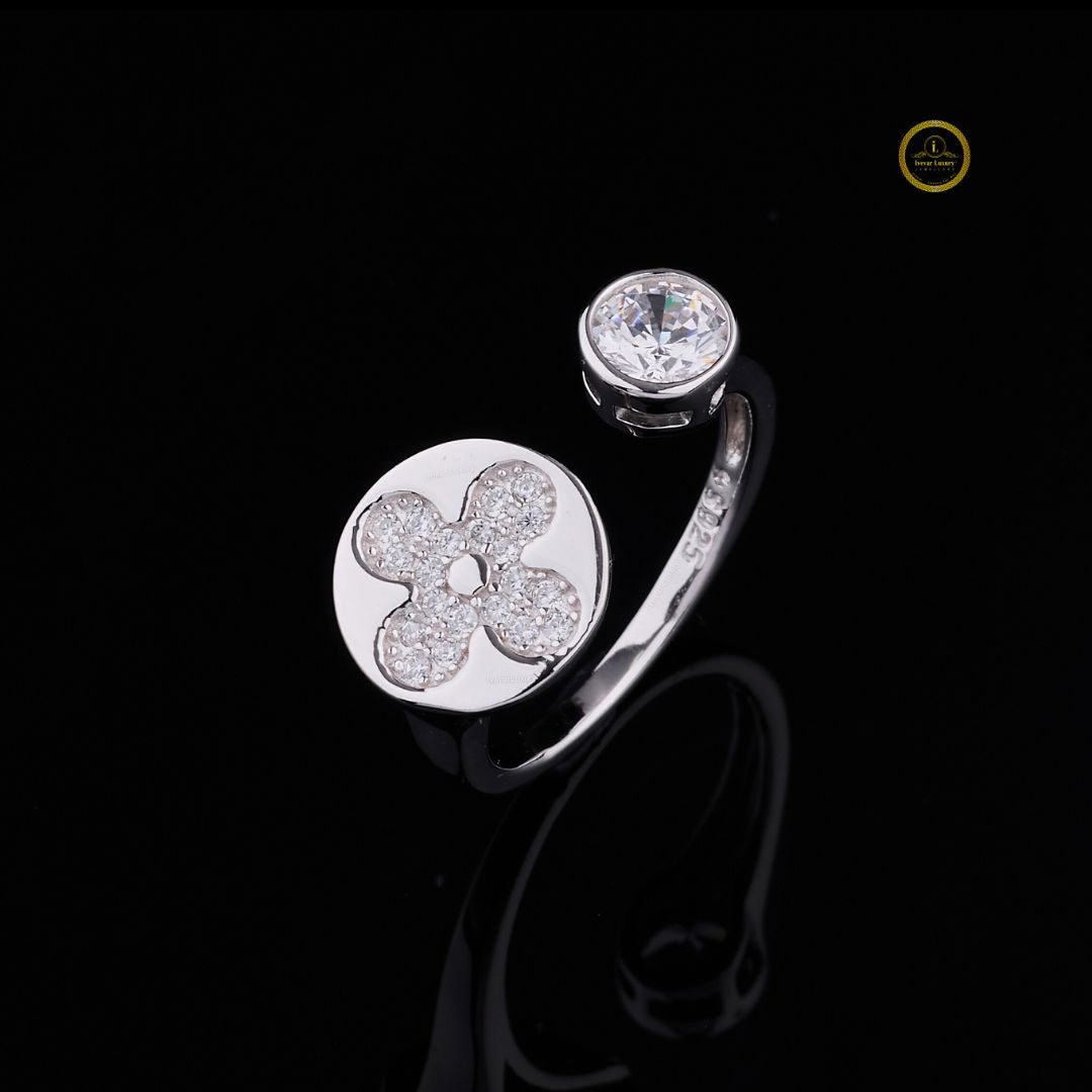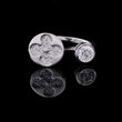 This elegant ring features a unique open-style design showcasing two distinct focal points: a sparkling floral motif adorned with brilliant round-cut stone set in a sleek bezel. Crafted in polished white gold, the piece blends modern artistry with timeless sophistication, making it a standout accessory for both everyday wear and special occasions.