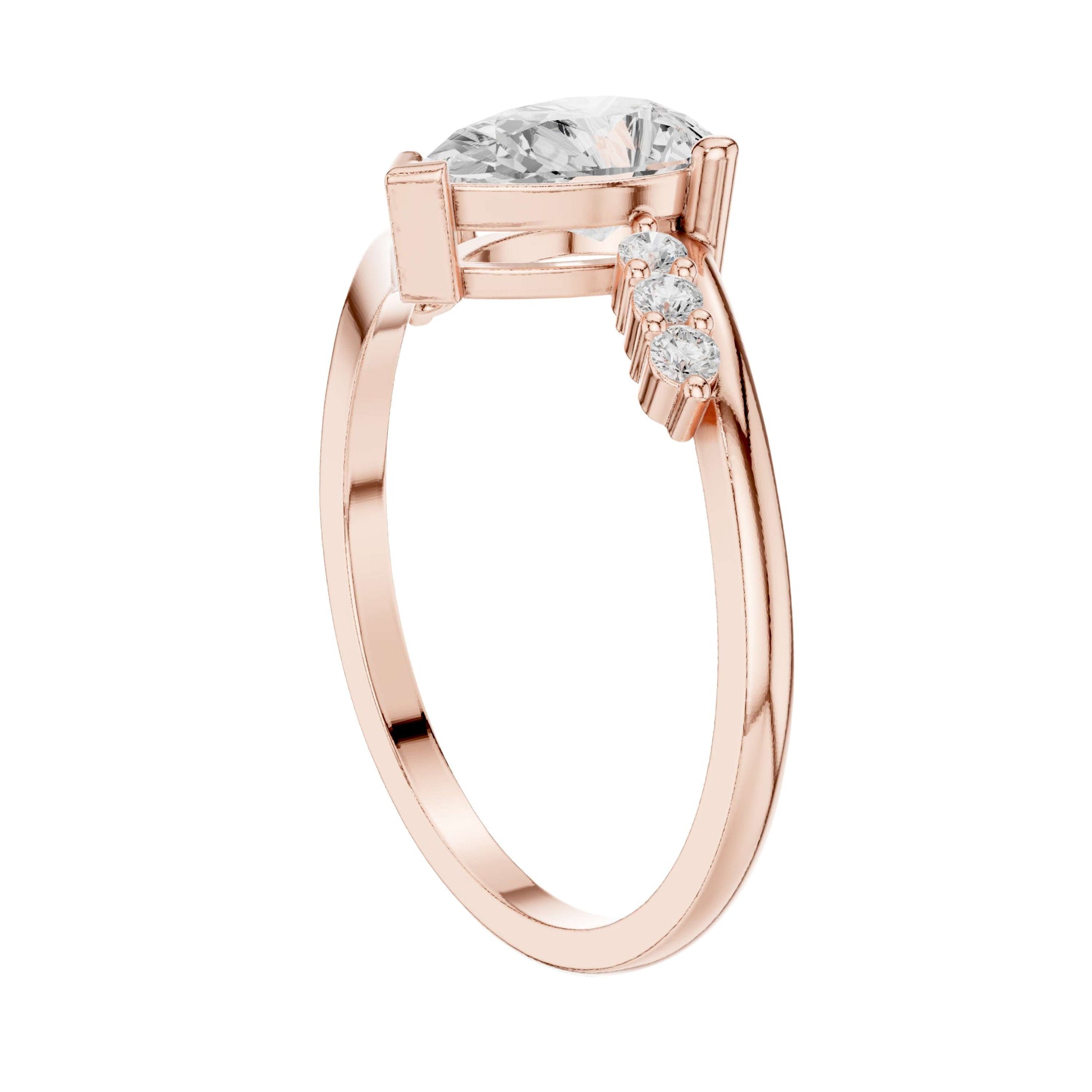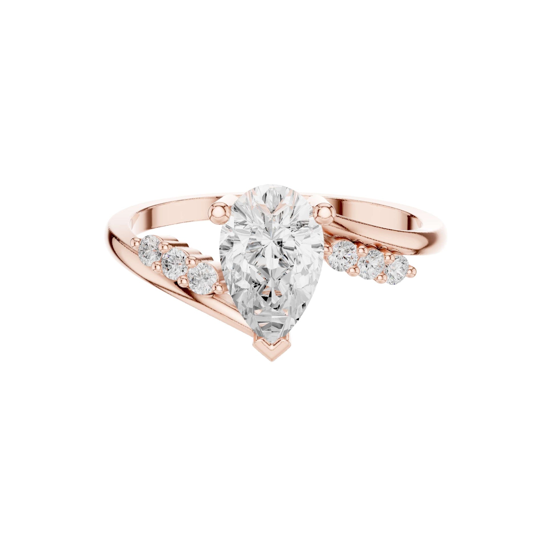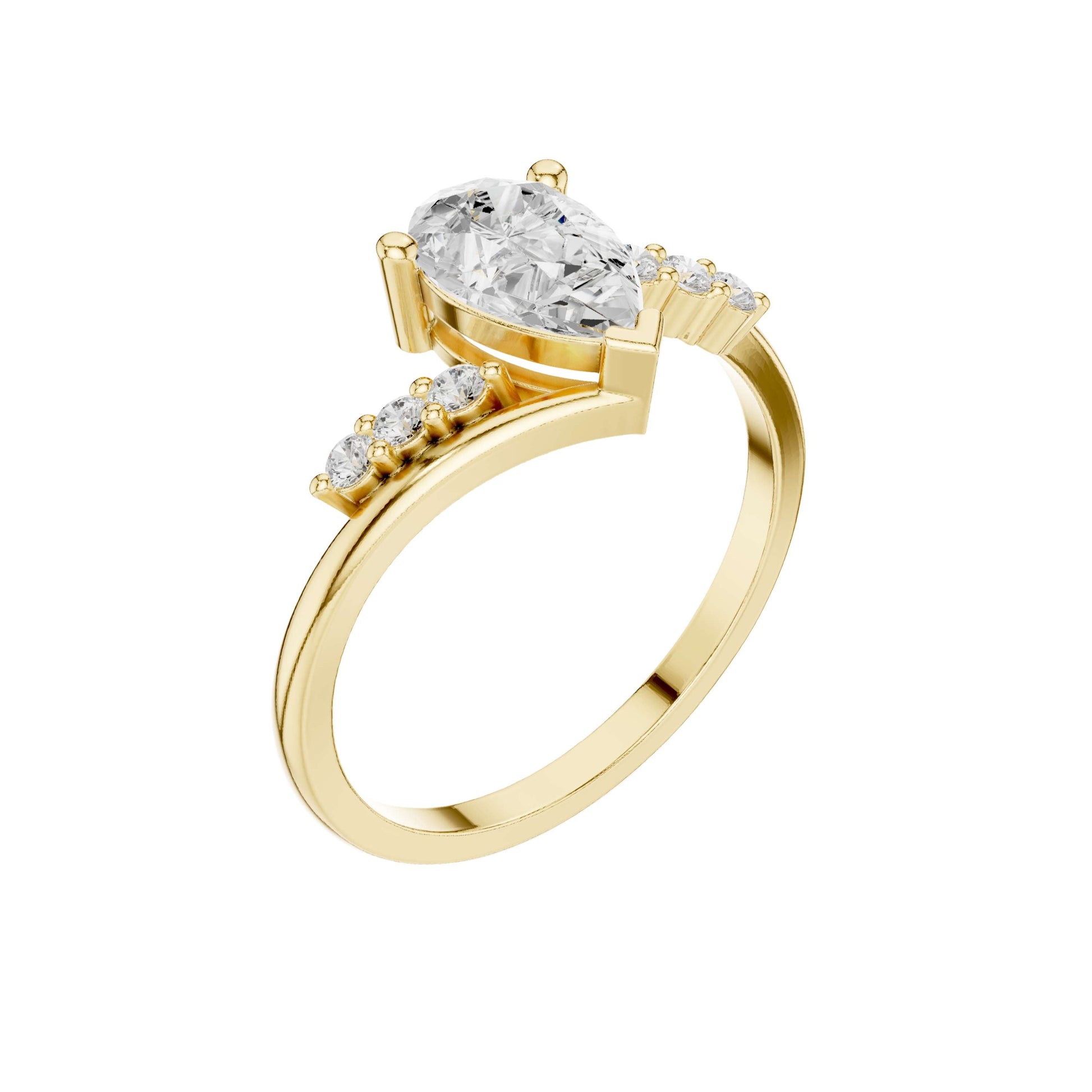 This elegant gold bypass ring showcases a stunning pear-shaped diamond as its centerpiece, gracefully framed by softly curving bands that sweep around the finger. Delicate round accent diamonds are set along each side of the split shank, adding balance, sparkle, and dimension without overpowering the center stone. The polished gold finish enhances the brilliance of the diamonds while the fluid, asymmetrical design offers a modern yet timeless appeal—perfect as a distinctive engagement ring, anniversary piece, or refined statement of everyday luxury by Ivevar.