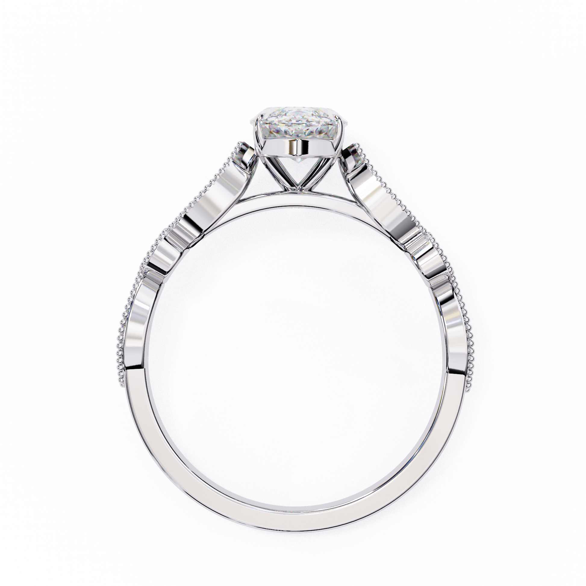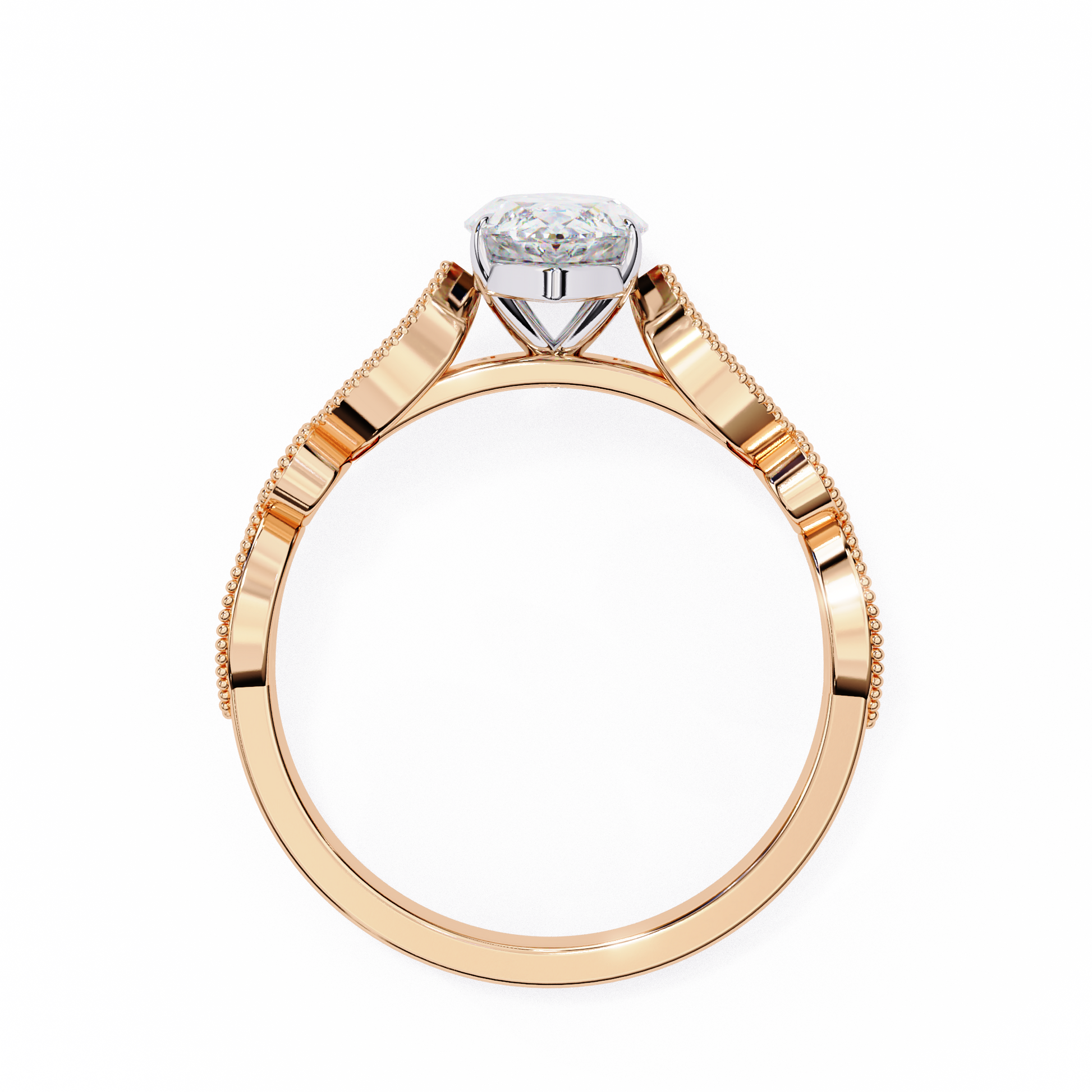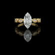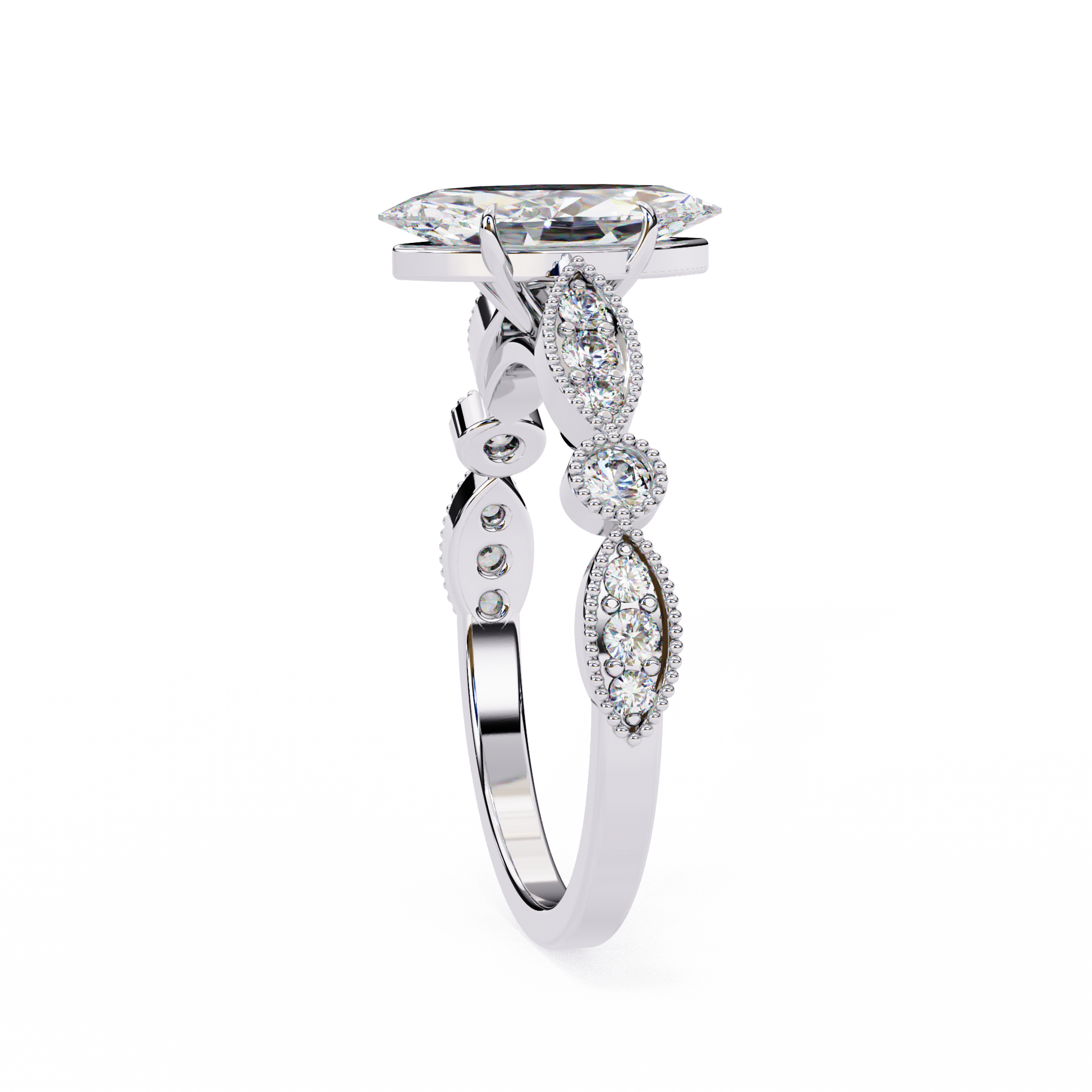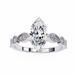 This breathtaking ring showcases a striking marquise-cut diamond at its center, radiating exceptional brilliance and elegance. The band features intricate vintage-inspired detailing with small accent diamonds framed in delicate milgrain edges, adding a touch of old-world charm. Crafted in luxurious gold, this design perfectly blends classic beauty with sophisticated artistry. Ideal as an engagement ring or a statement heirloom piece, it offers a truly unique and timeless appeal.