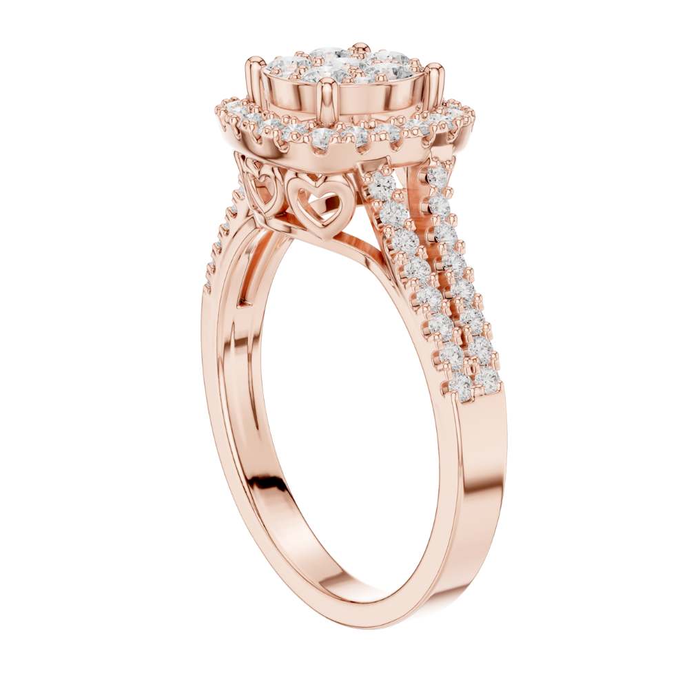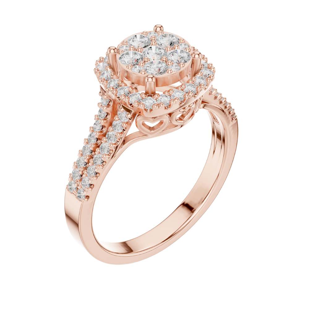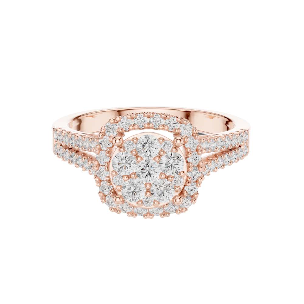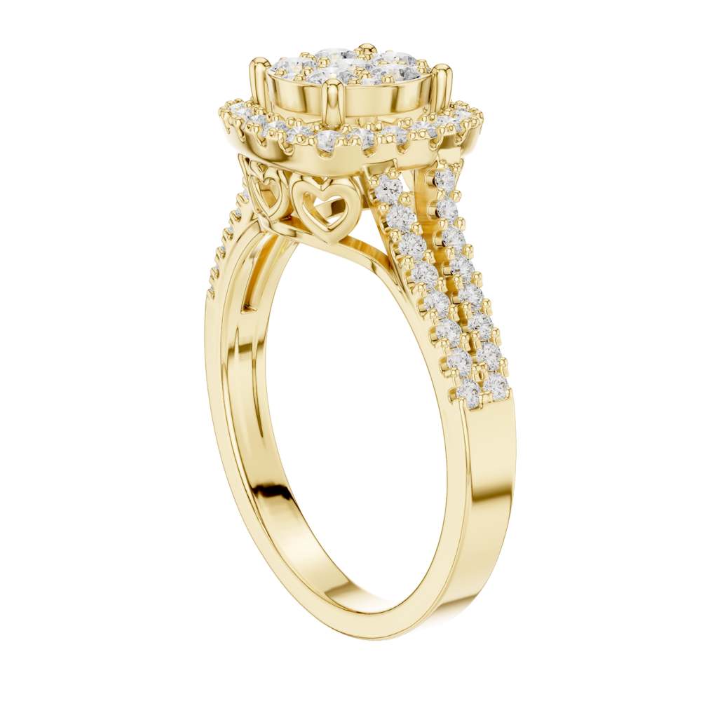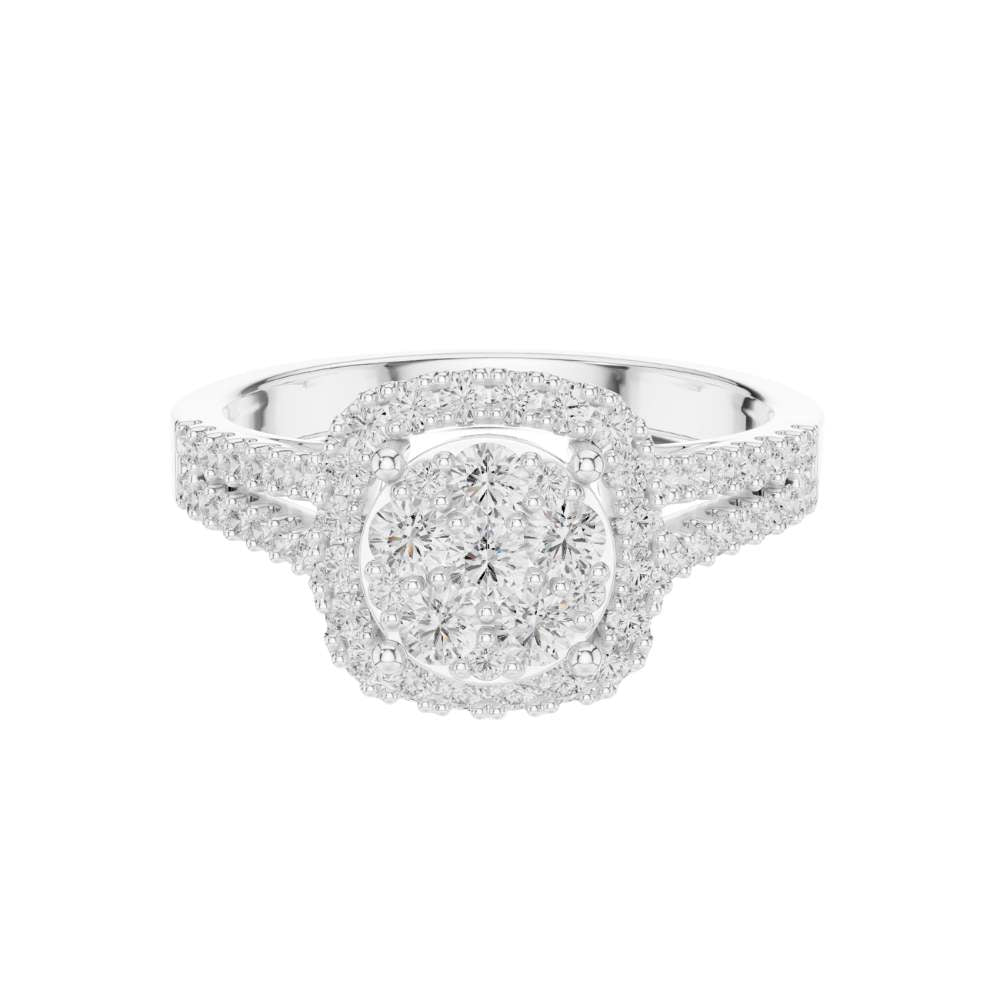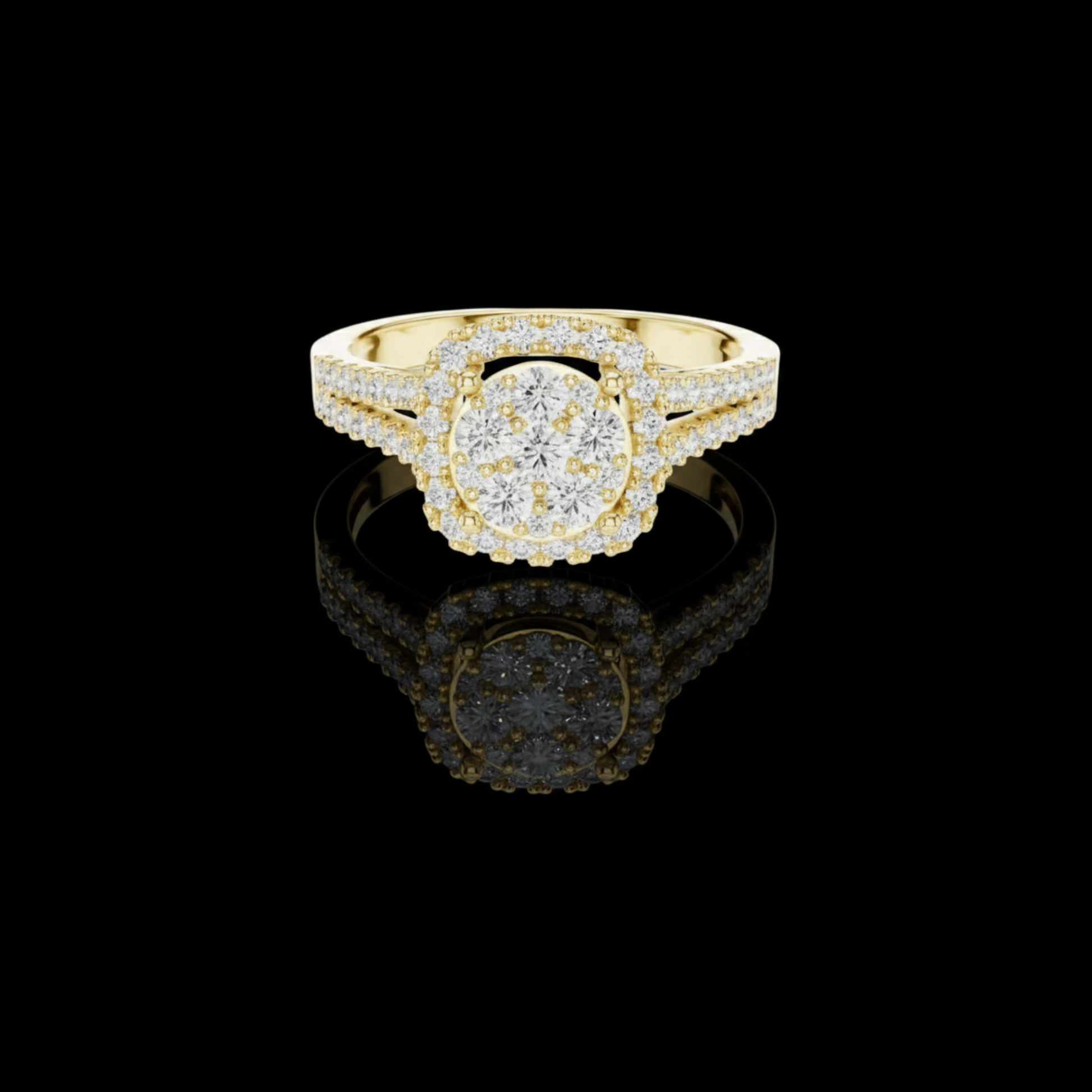 This stunning ring showcases a luxurious cluster of brilliant round diamonds set at the center, framed by a sparkling halo that enhances its radiance from every angle. Crafted in polished gold, the design features a diamond-encrusted split shank that adds extra brilliance and depth, creating a glamorous and eye-catching silhouette. With its bold sparkle and refined detailing, this ring embodies timeless elegance, making it an unforgettable statement piece for special occasions or a breathtaking symbol of love by Ivevar.