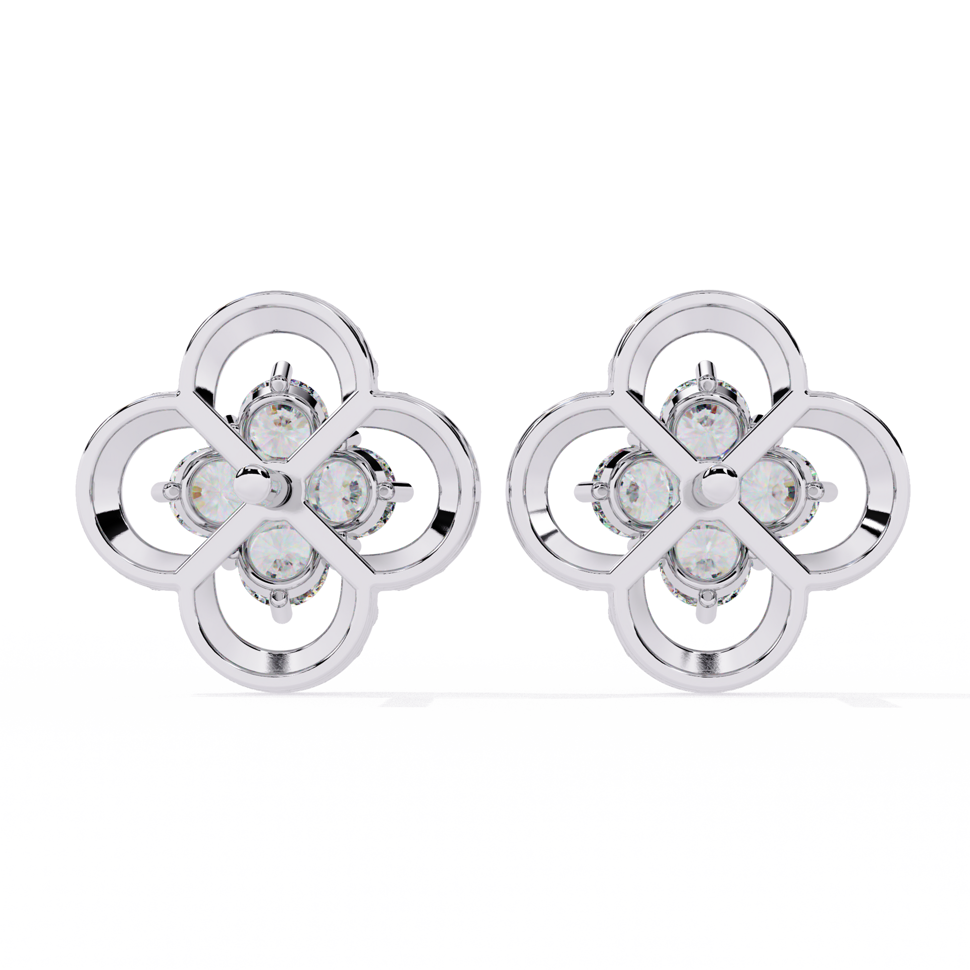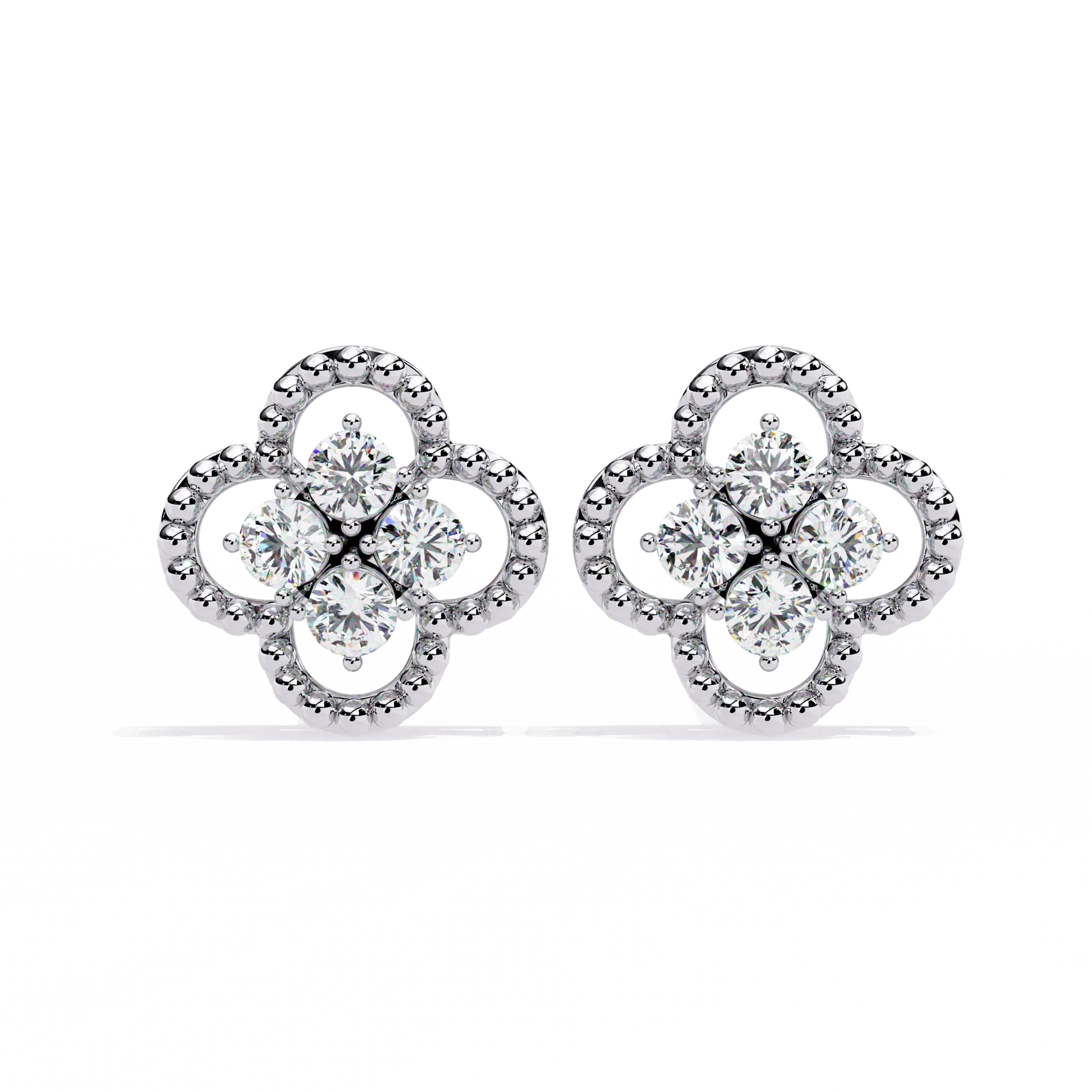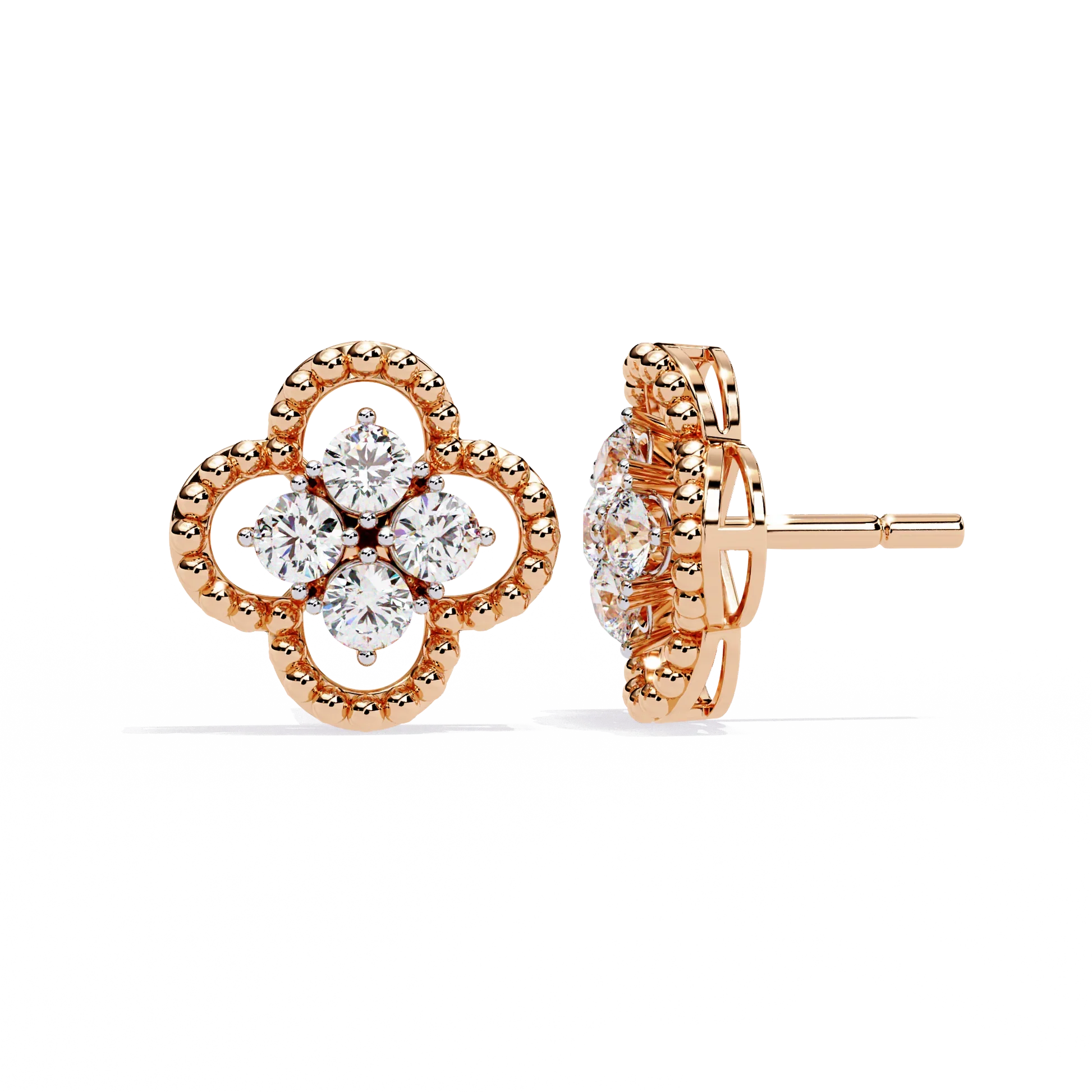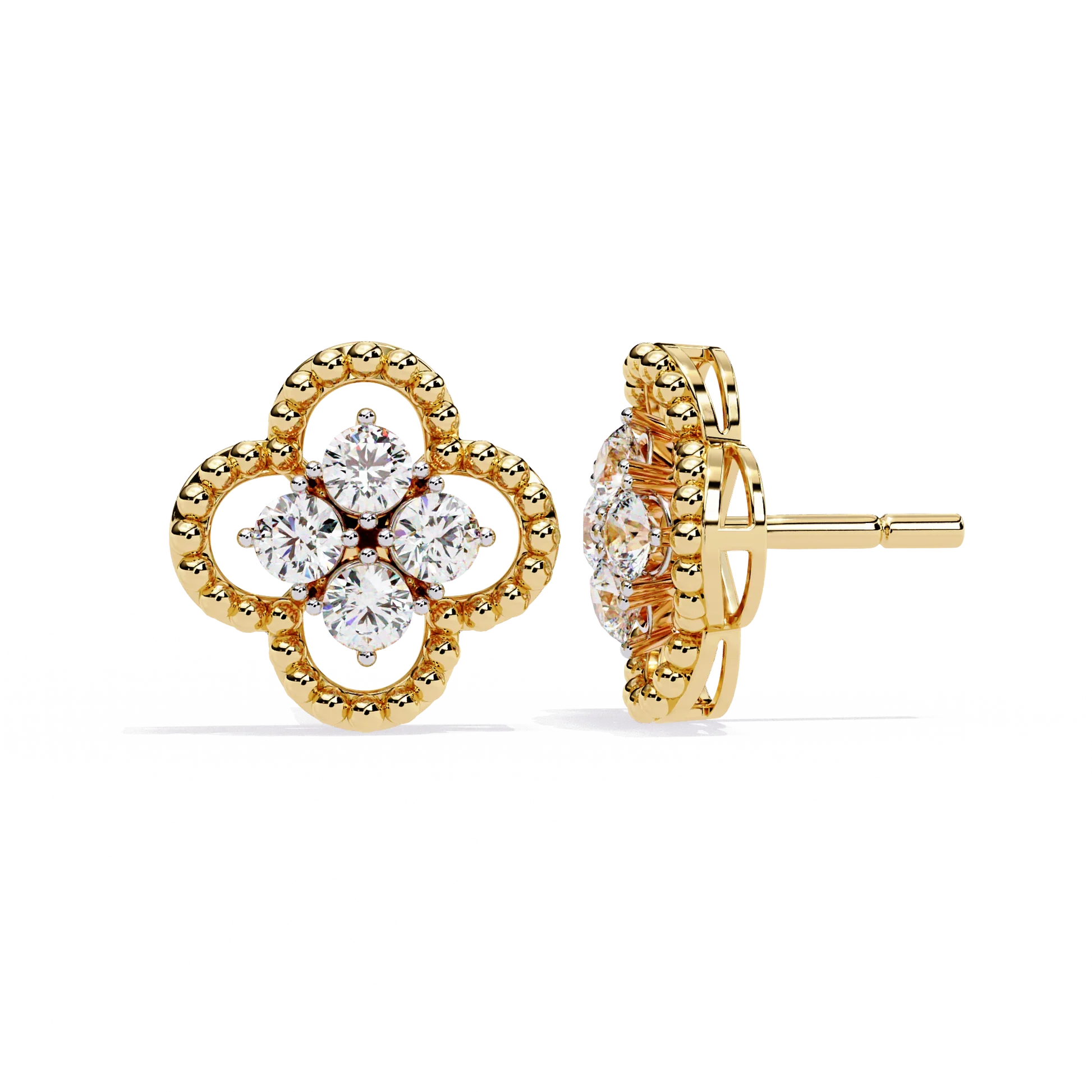 These elegant stud earrings feature a delicate four-petal floral motif crafted in gleaming gold, each petal outlined with intricate texture for added depth and sparkle. At the center of each earring, four brilliant round stones cluster together, creating a radiant focal point that enhances their refined, feminine appeal. Perfect for both everyday sophistication and special occasions, these earrings blend timeless design with luxurious detail by Ivevar.