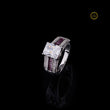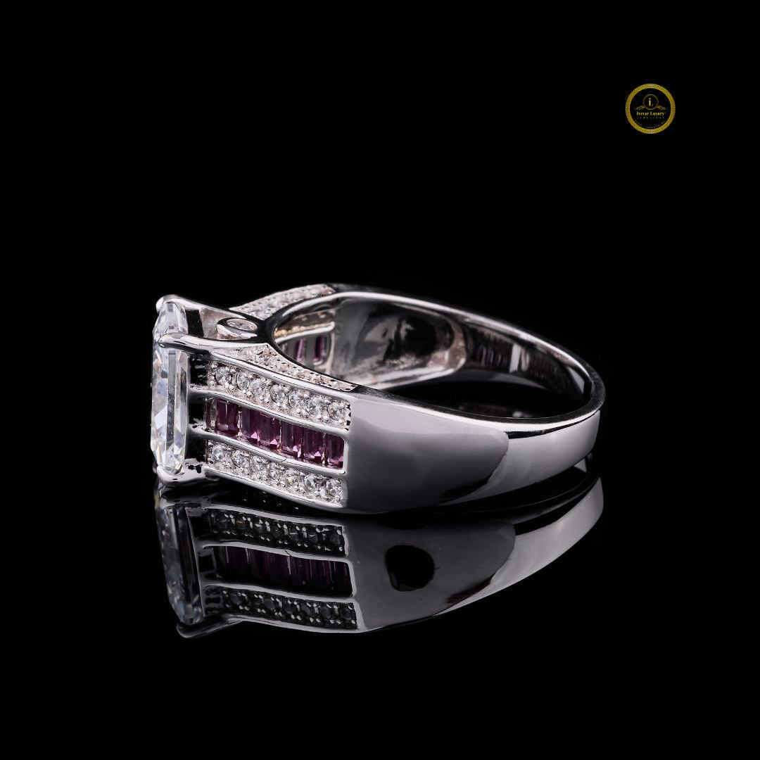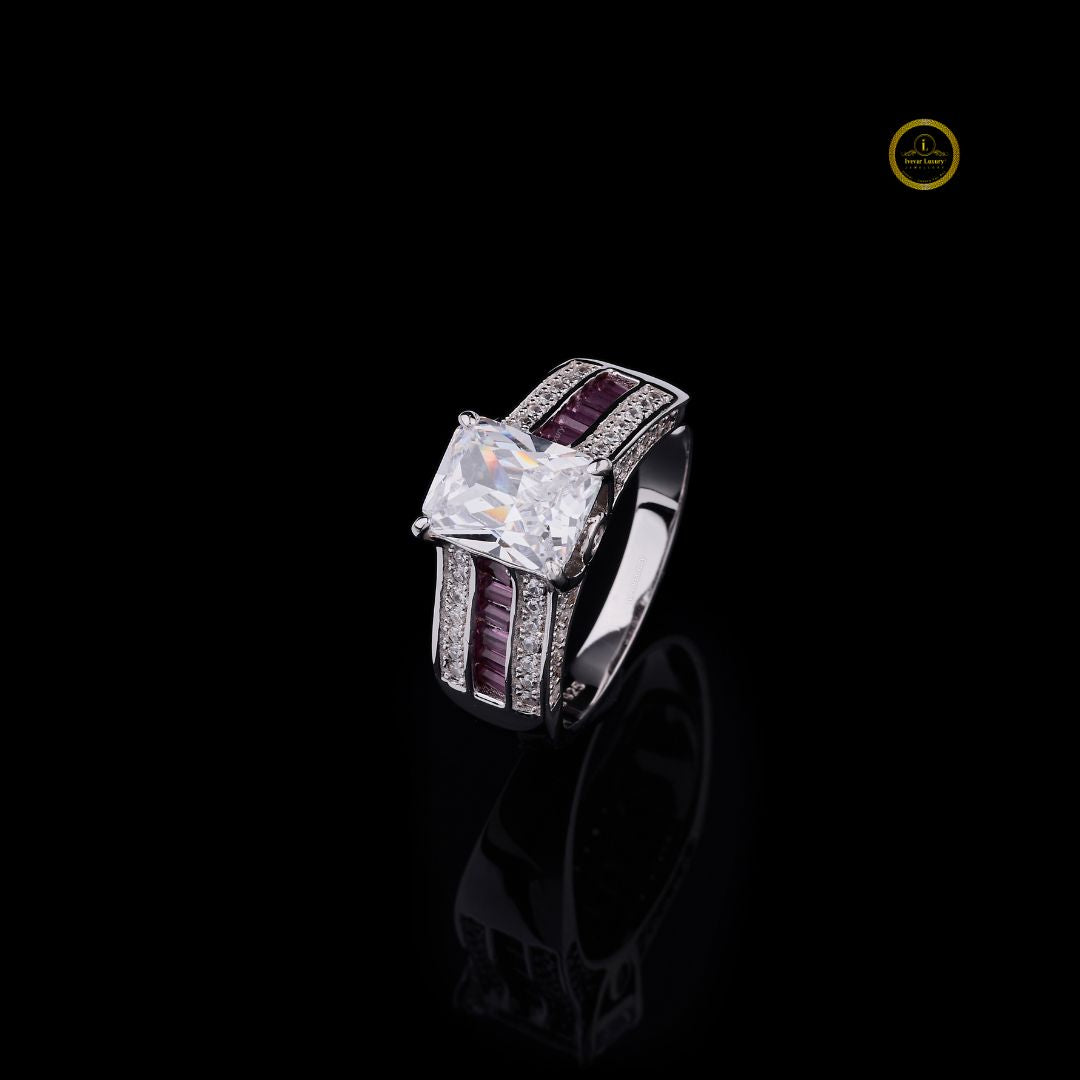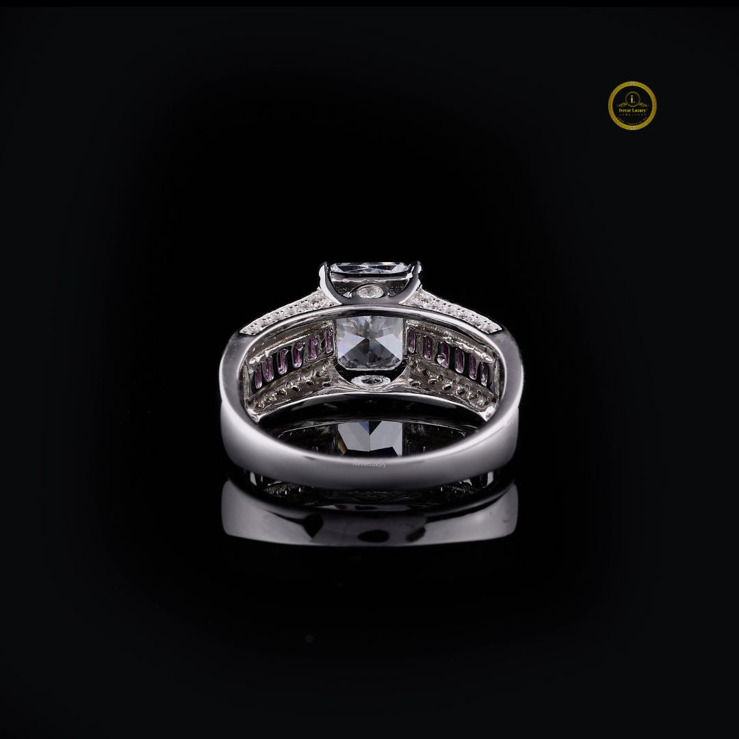 This exquisite ring features a stunning radiant-cut diamond centerpiece, elegantly framed by rows of deep red ruby baguettes and delicate pavé-set round diamonds. The design showcases a perfect harmony of brilliance and color, set in a polished white gold or silver band. Ideal for those who appreciate timeless elegance with a bold touch of sophistication, this piece reflects masterful craftsmanship and luxurious detail — a true statement of refined beauty.