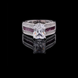 This exquisite ring features a stunning radiant-cut diamond centerpiece, elegantly framed by rows of deep red ruby baguettes and delicate pavé-set round diamonds. The design showcases a perfect harmony of brilliance and color, set in a polished white gold or silver band. Ideal for those who appreciate timeless elegance with a bold touch of sophistication, this piece reflects masterful craftsmanship and luxurious detail — a true statement of refined beauty.