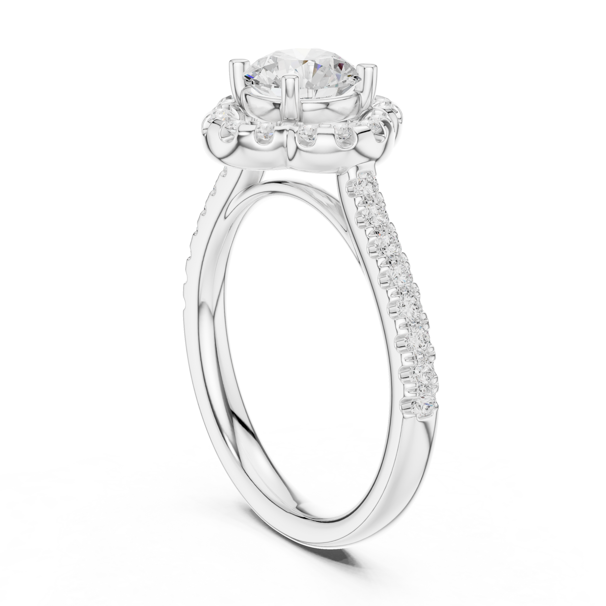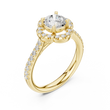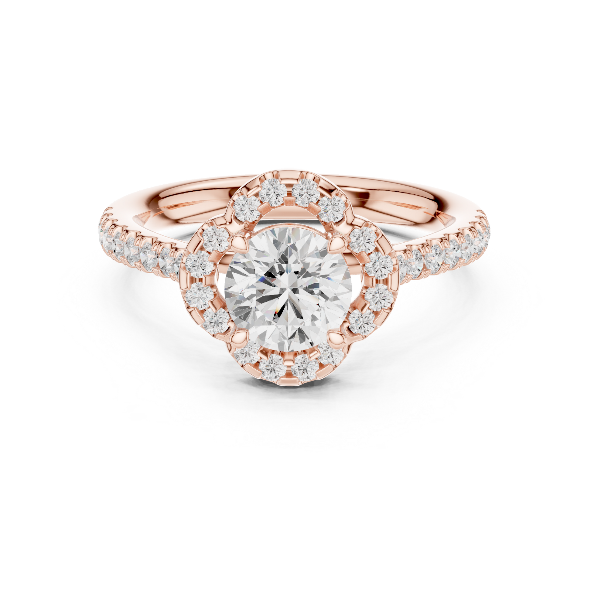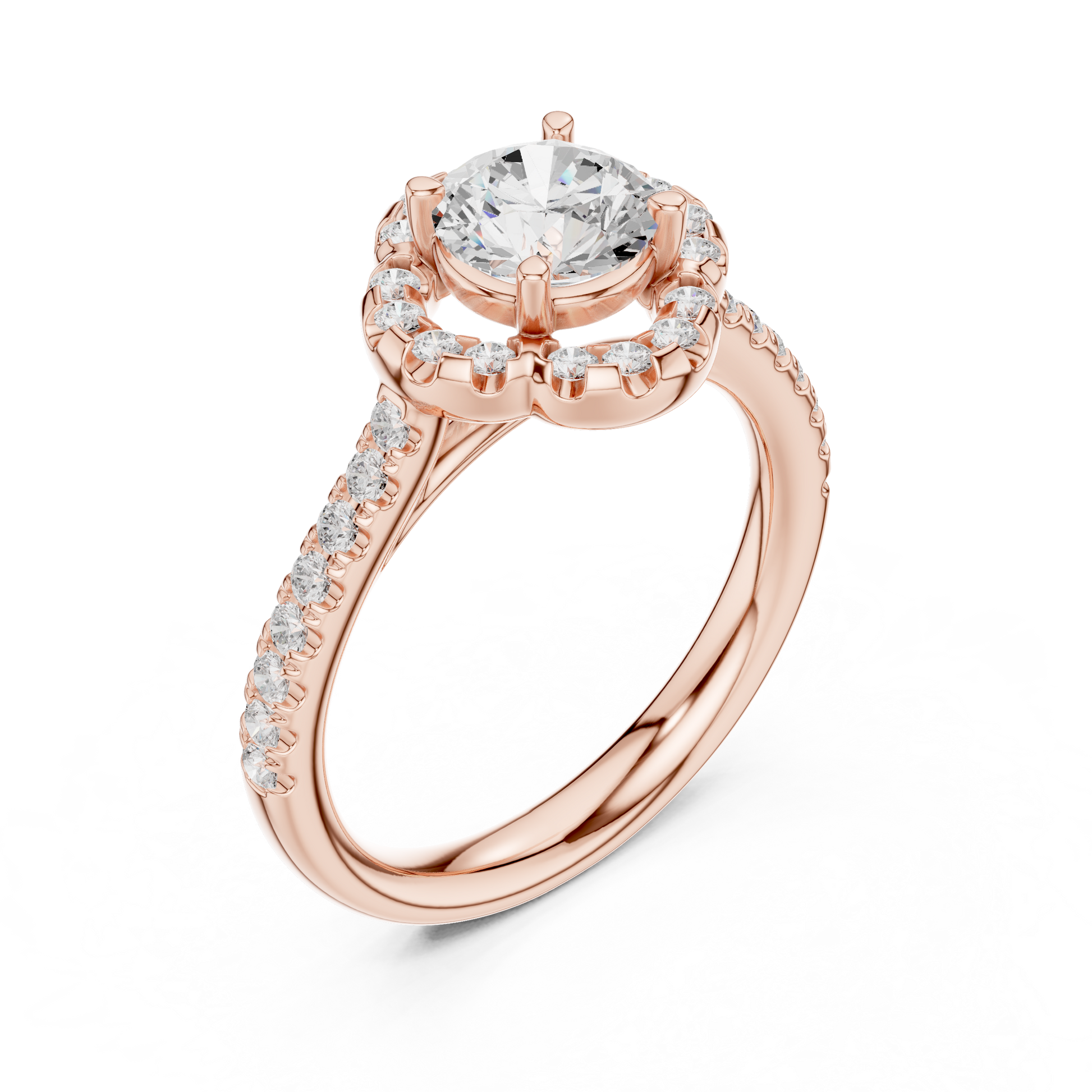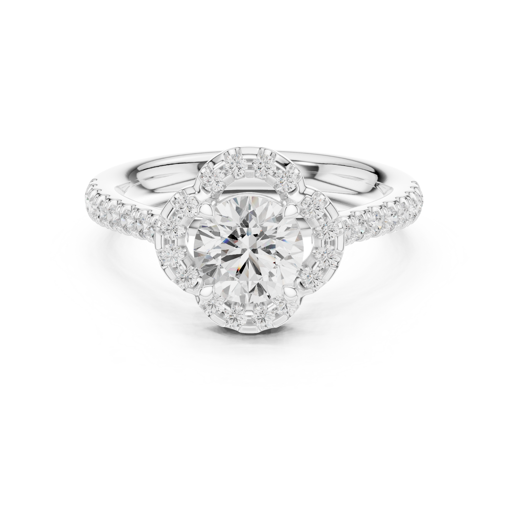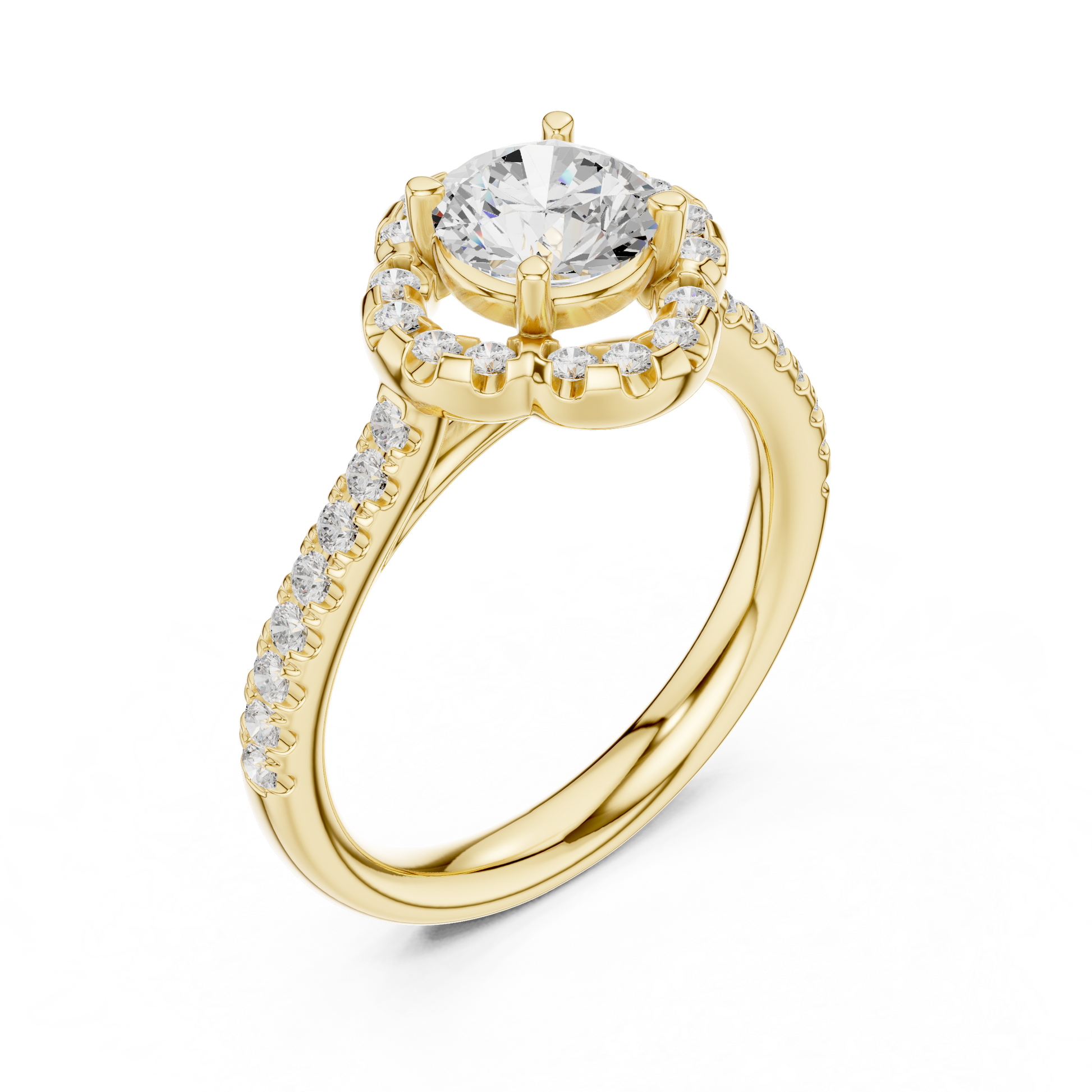 Experience the perfect blend of romance and brilliance with this captivating floral-halo diamond ring, masterfully crafted in glowing gold. A stunning round center diamond is surrounded by a petal-inspired halo of pave stones, creating a luminous bloom of sparkle from every angle. The shimmering diamond-accented band adds an extra layer of radiance, making this ring a symbol of timeless love and feminine elegance. Ideal for engagements or anniversary celebrations, this breathtaking design delivers unmatched charm, beauty, and luxurious craftsmanship.