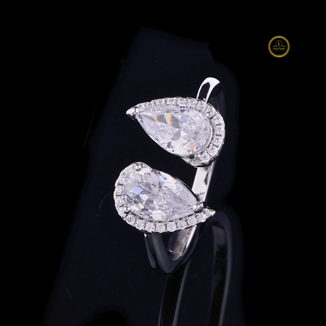This stunning dual pear-cut diamond ring showcases two brilliant teardrop-shaped stones, each surrounded by a halo of smaller dazzling round diamonds. Set on a sleek white gold band, the design exudes luxury, sophistication, and modern elegance. Perfect for making a bold yet graceful statement, this piece reflects timeless beauty and refined craftsmanship.